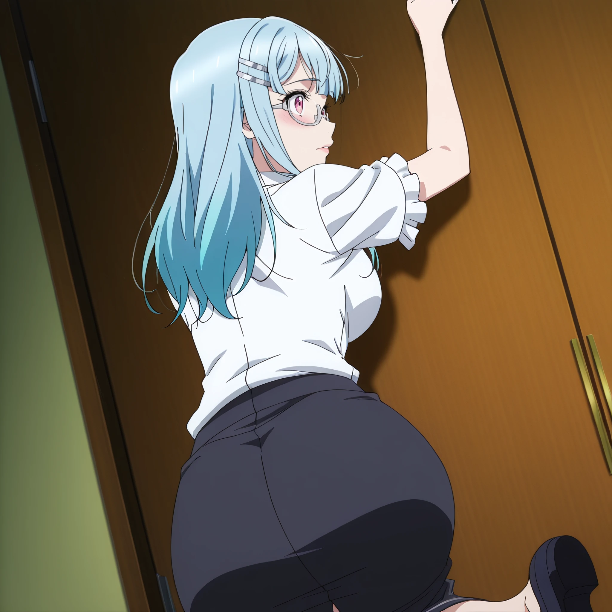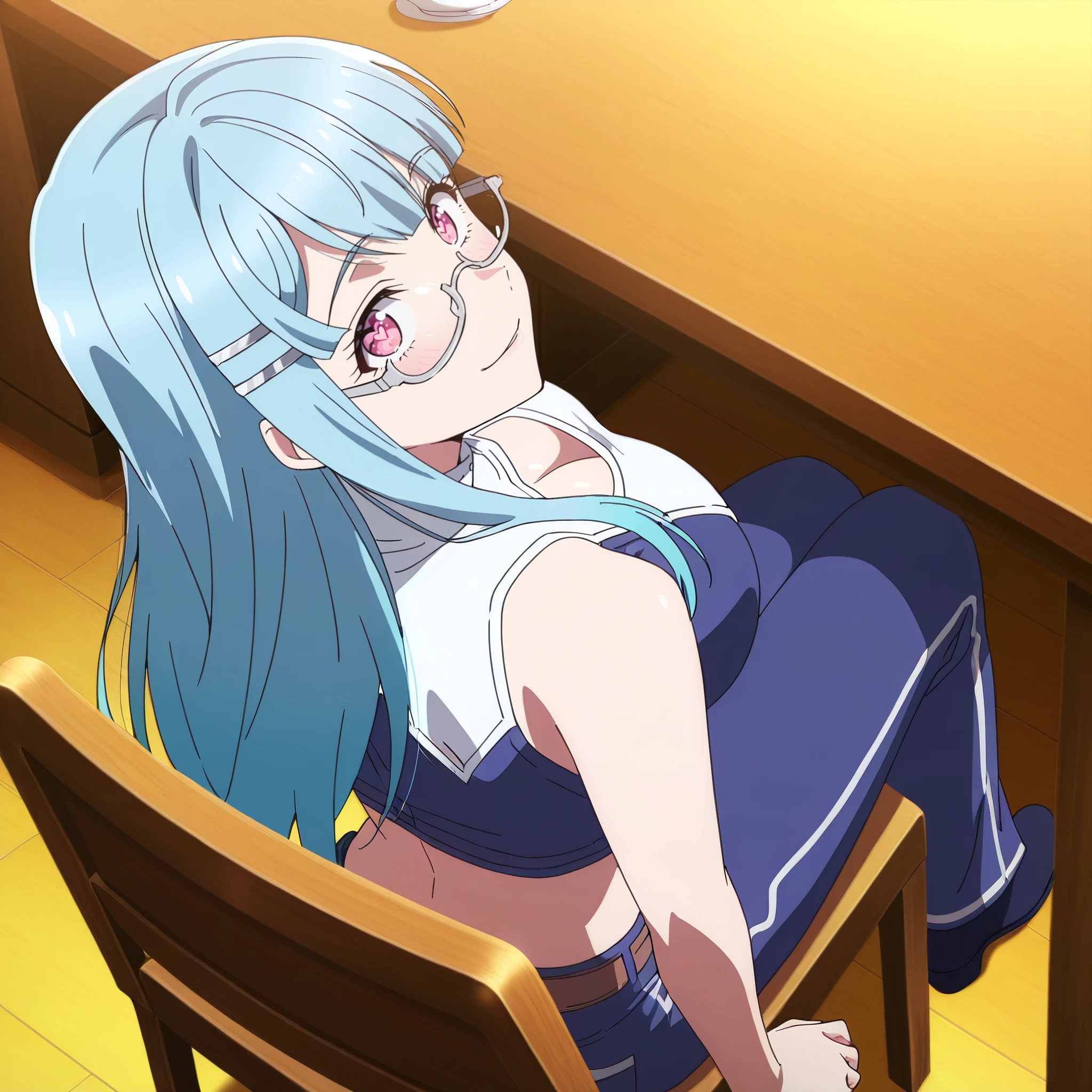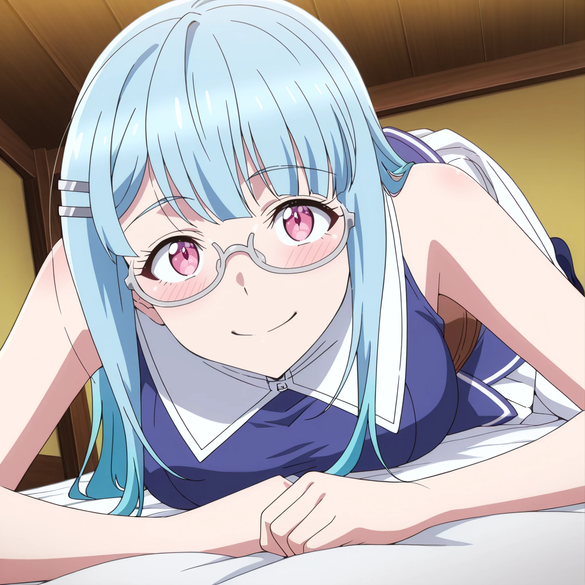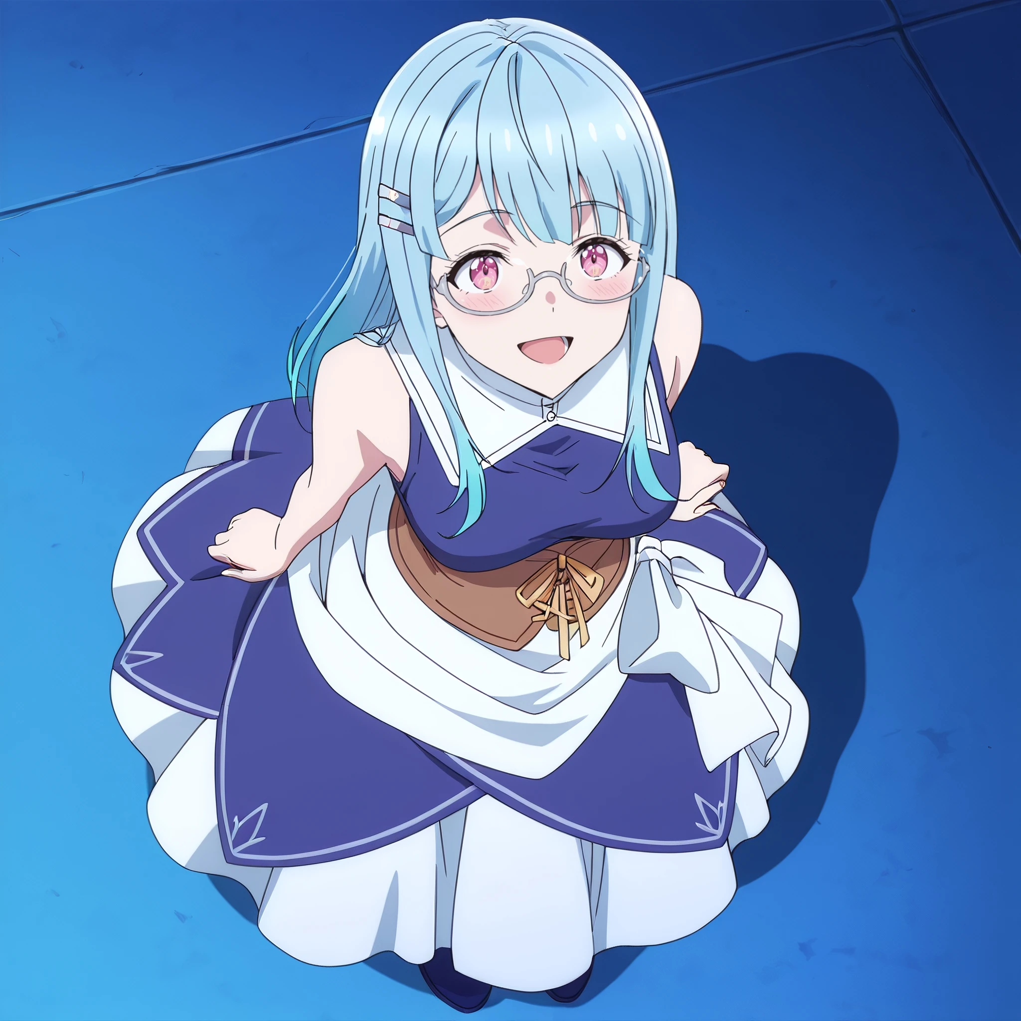 SRASilica, long hair, glasses, hair ornament, hairclip, pink eyes, blue hair, semi-rimless eyewear, grey-framed eyewear, blunt bangs, sidelocks,