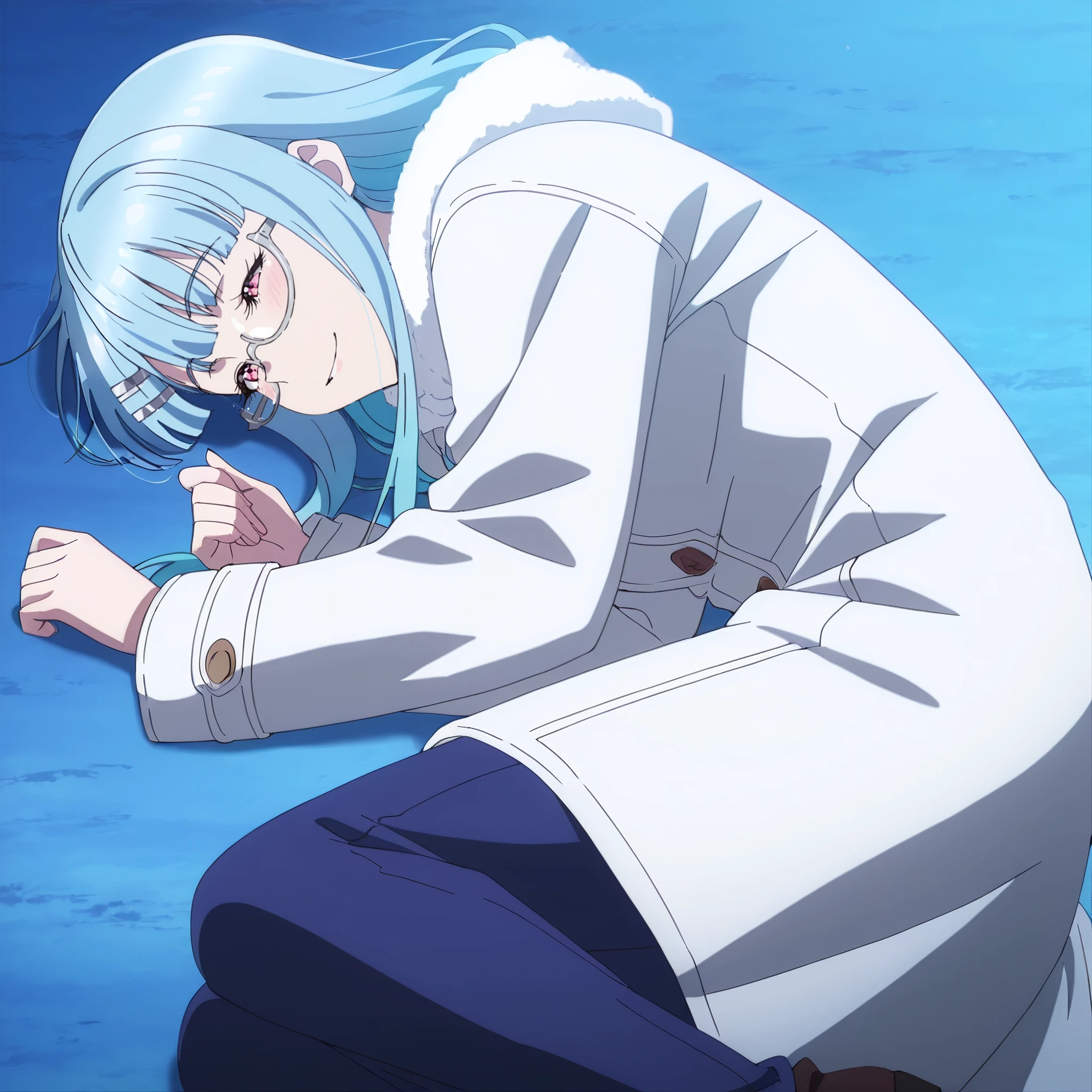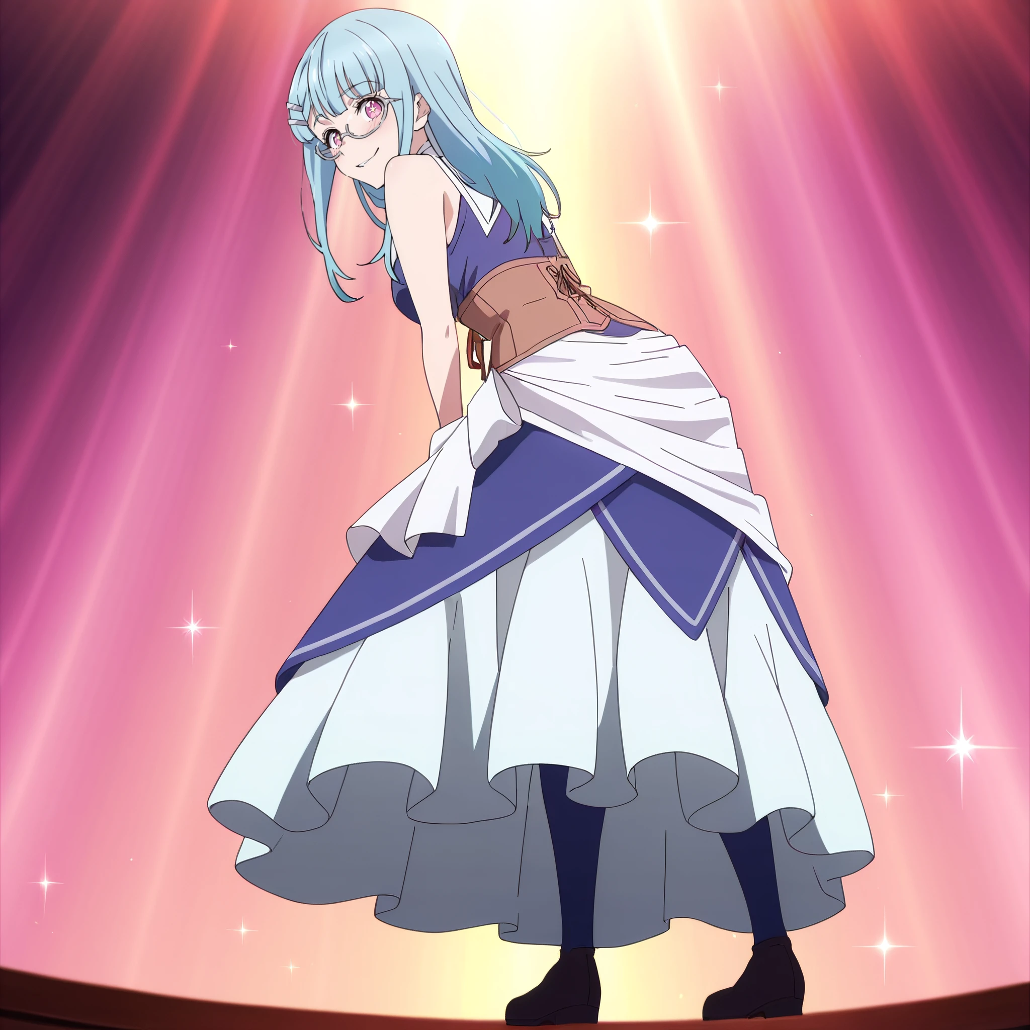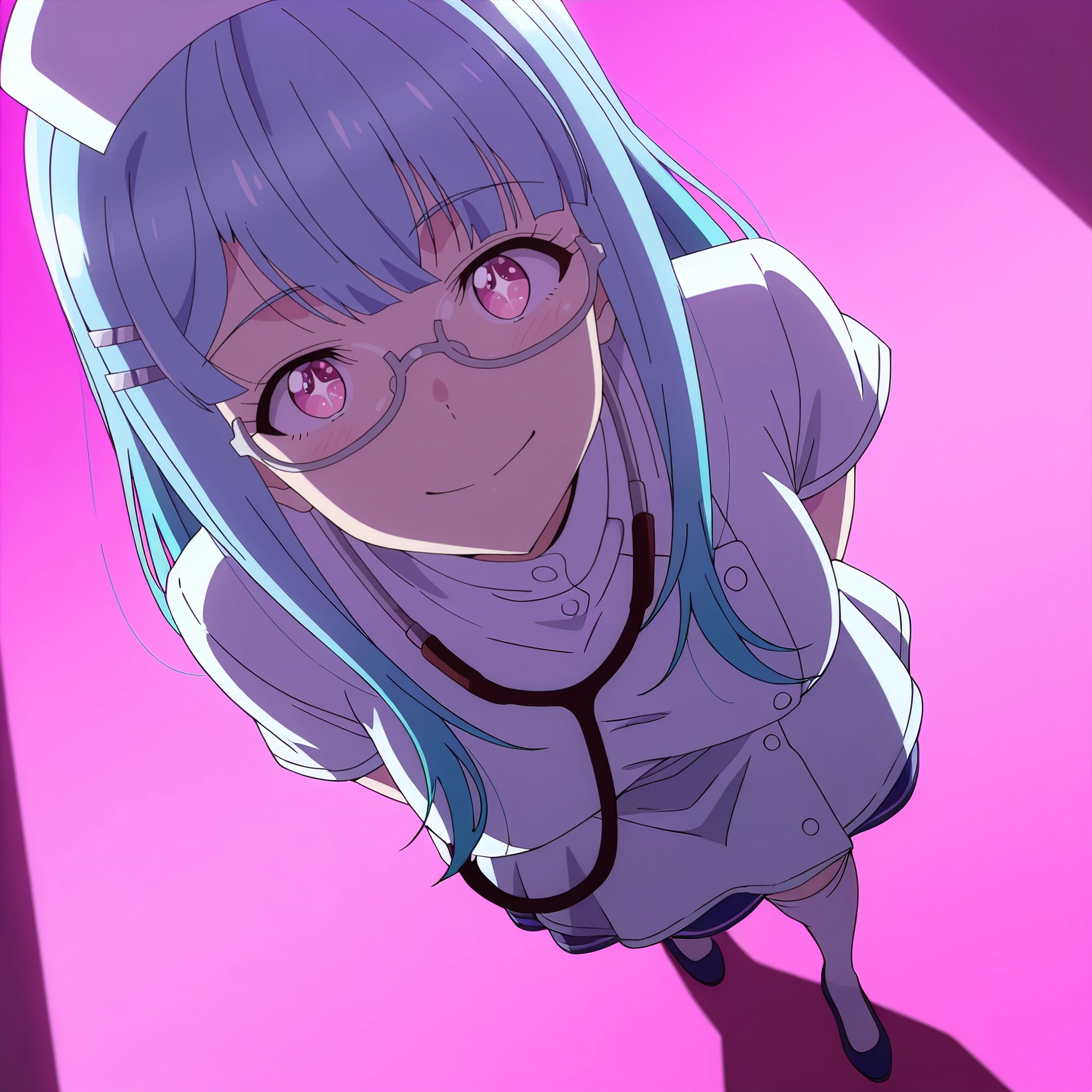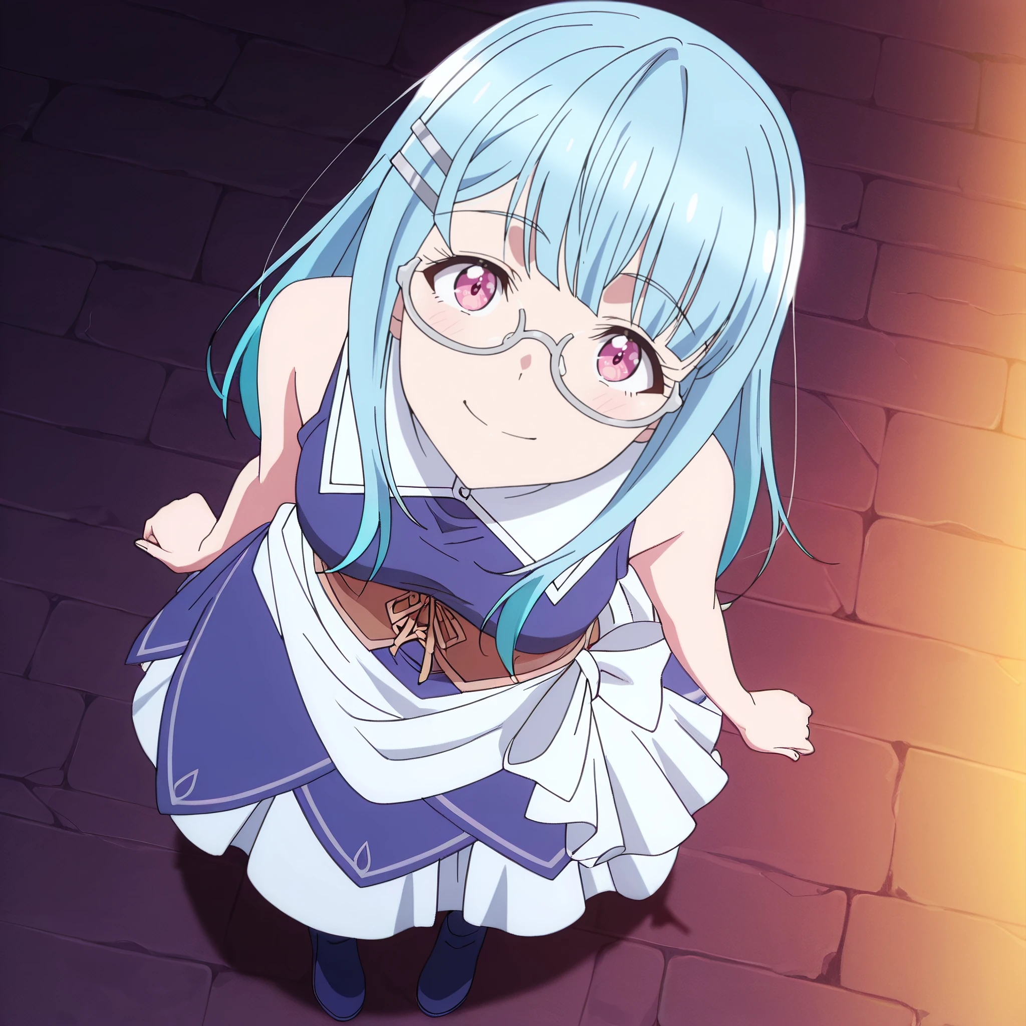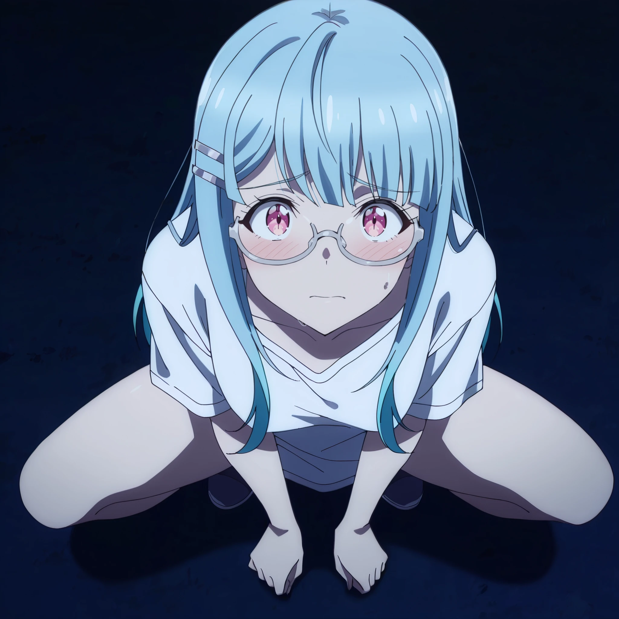 SRASilica, long hair, glasses, hair ornament, hairclip, pink eyes, blue hair, semi-rimless eyewear, grey-framed eyewear, blunt bangs, sidelocks,