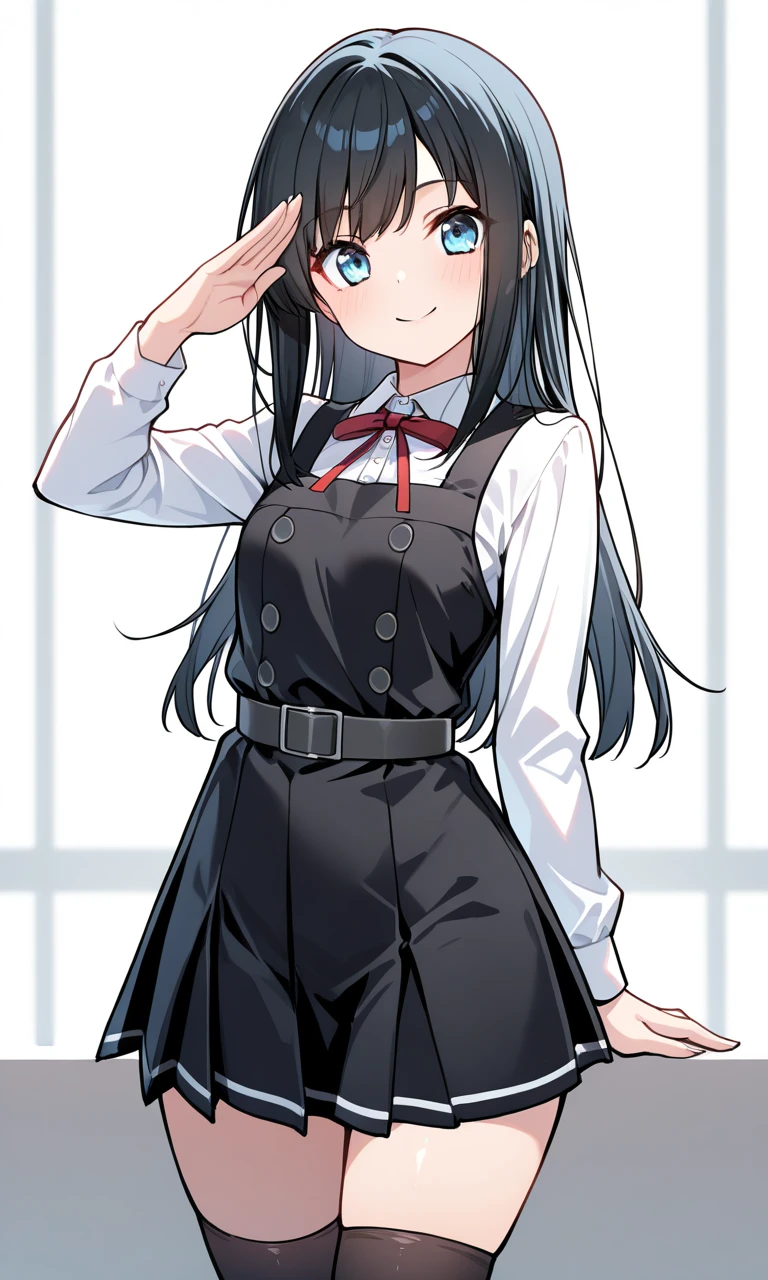 asashioKC,black hair,blue eyes, long hair, shirt, long sleeves, dress, bow, ribbon, white shirt, cowboy shot, belt, bowtie, black dress, red bow, red ribbon, neck ribbon, red bowtie, pinafore dress,black thighhighs,pleated_skirt,