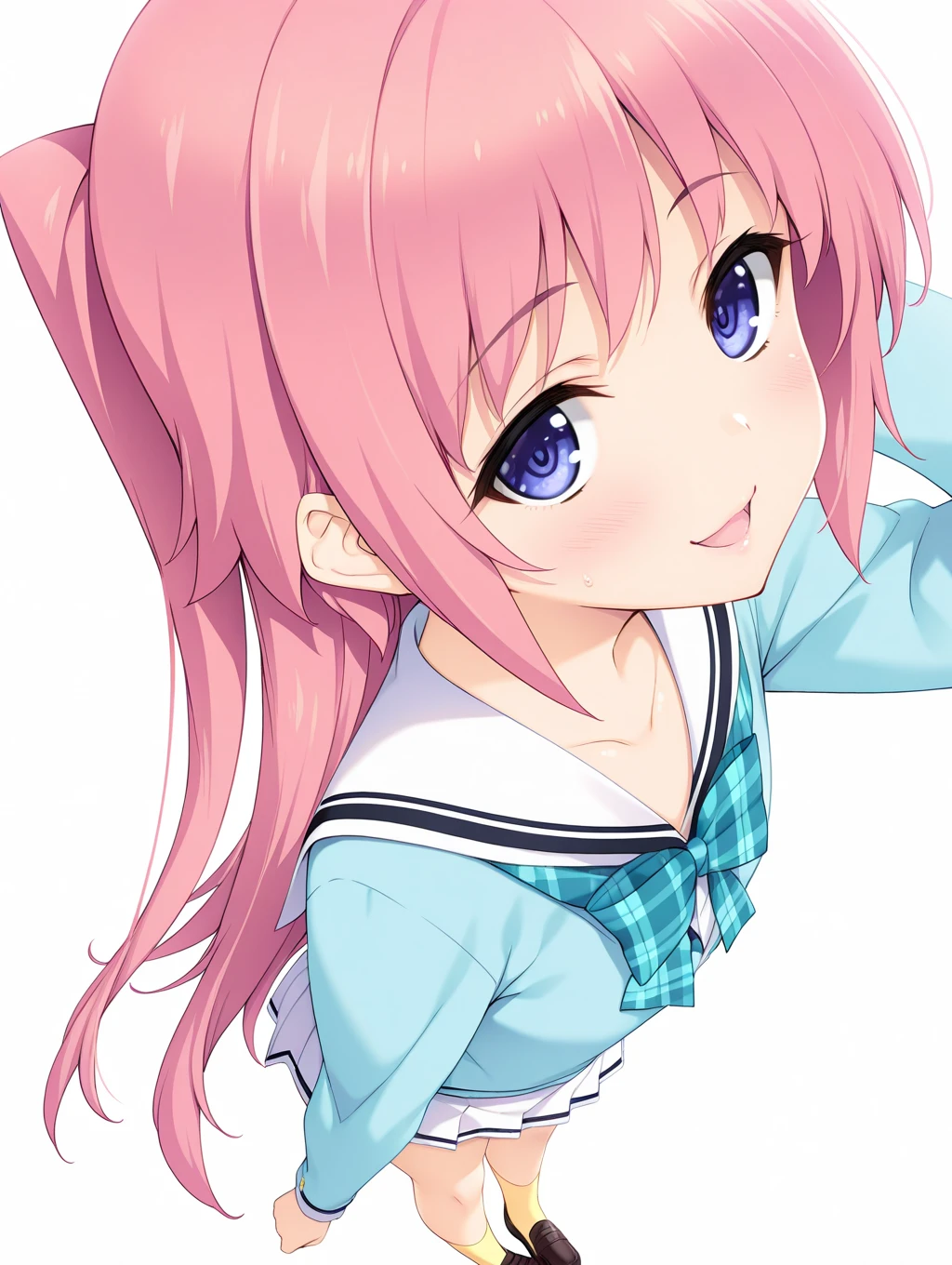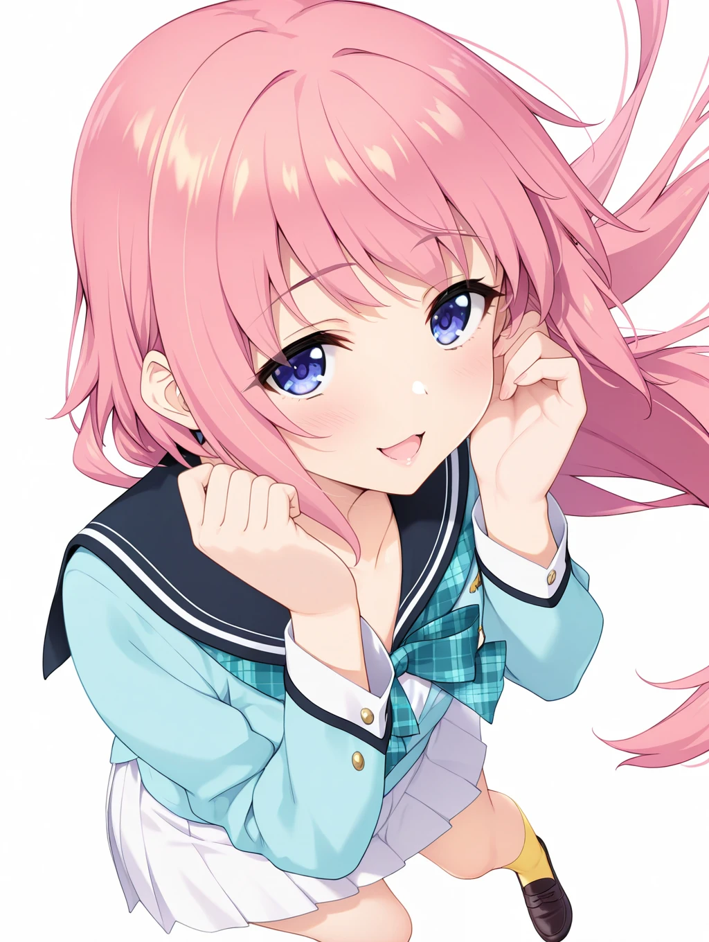 h_clothes,long_sleeves,light blue uniform,white pleated skirt,yellow socks,loafers,