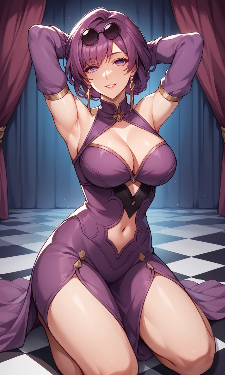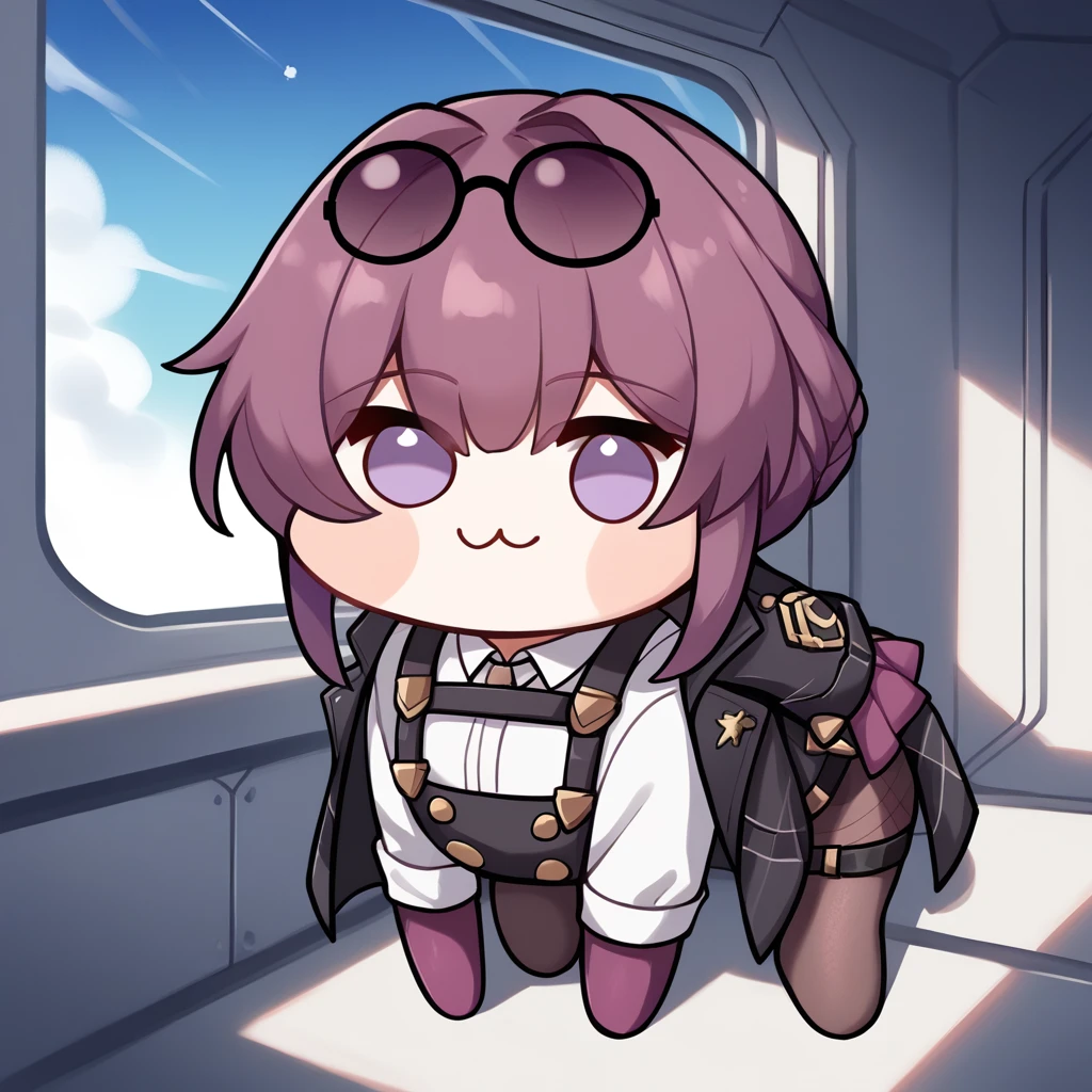 Trigger: KafkaHSR, eyewear on head, harness, shirt, black coat, purple gloves, pantyhose,