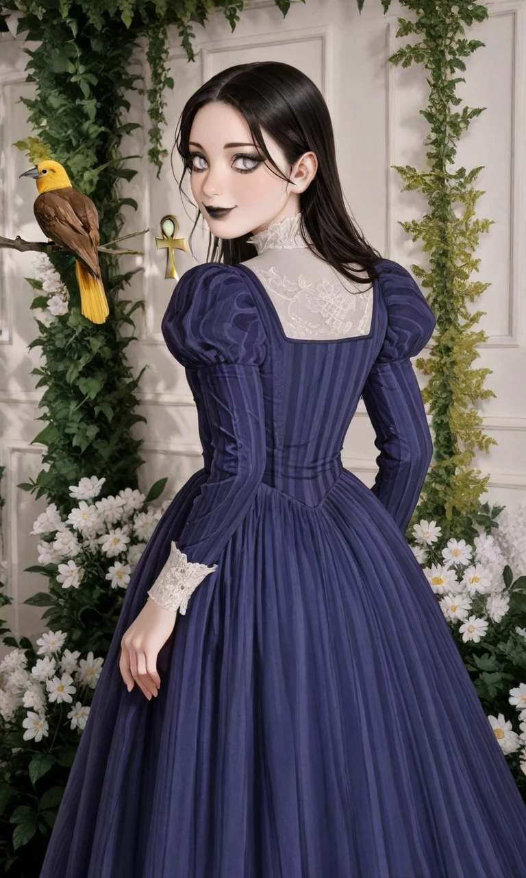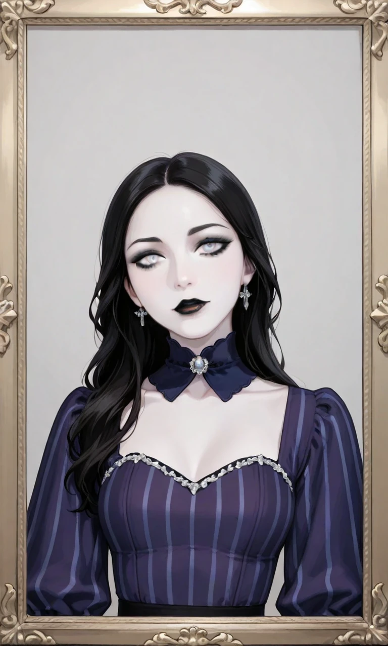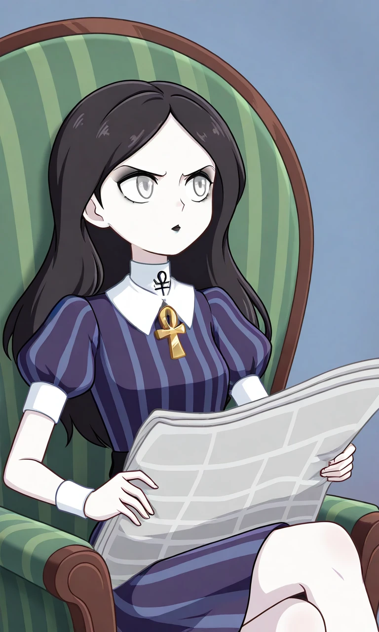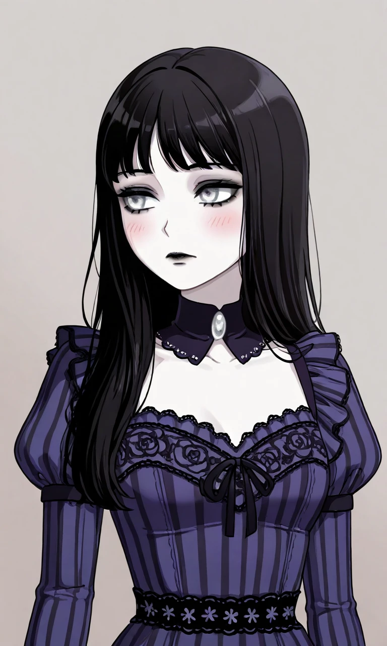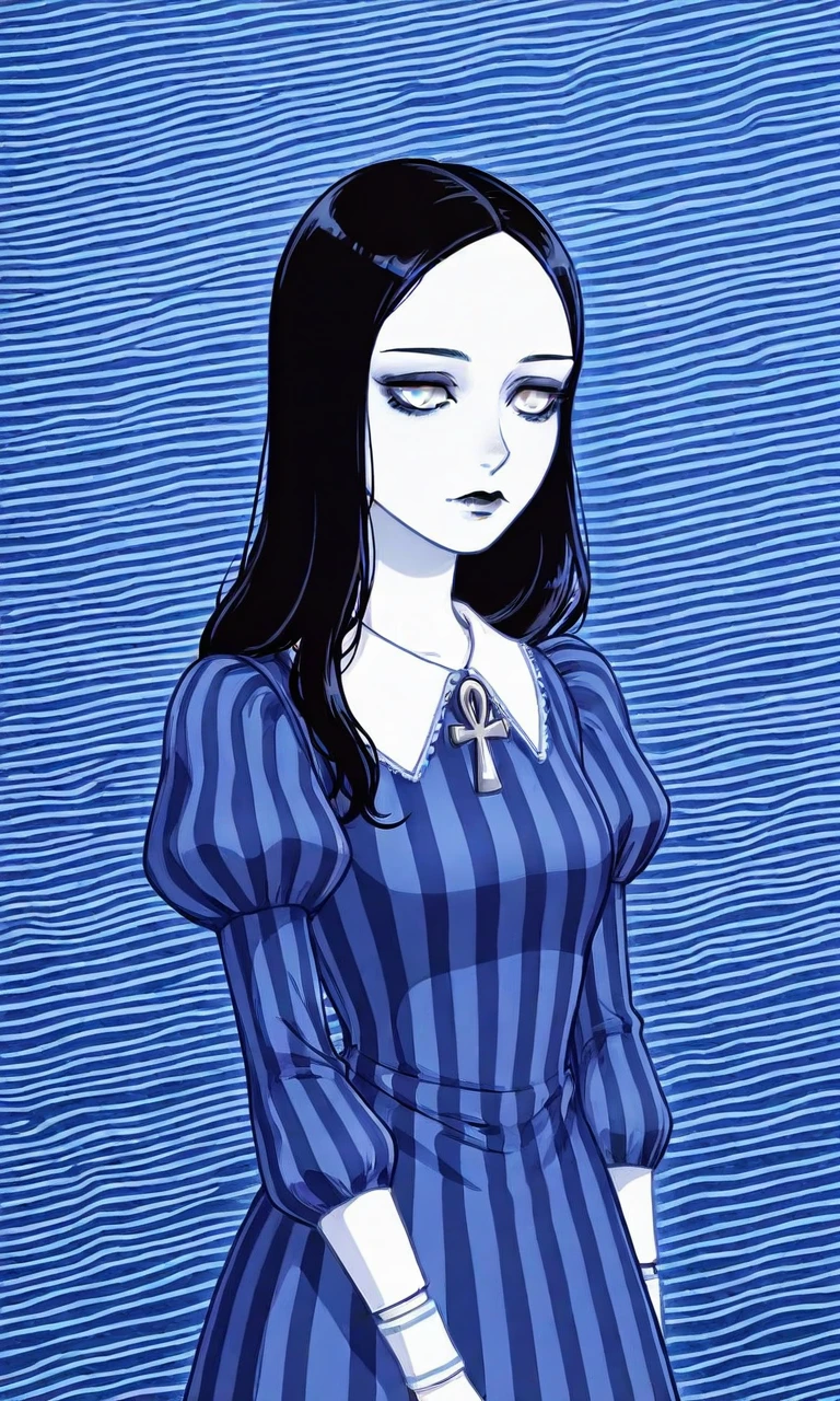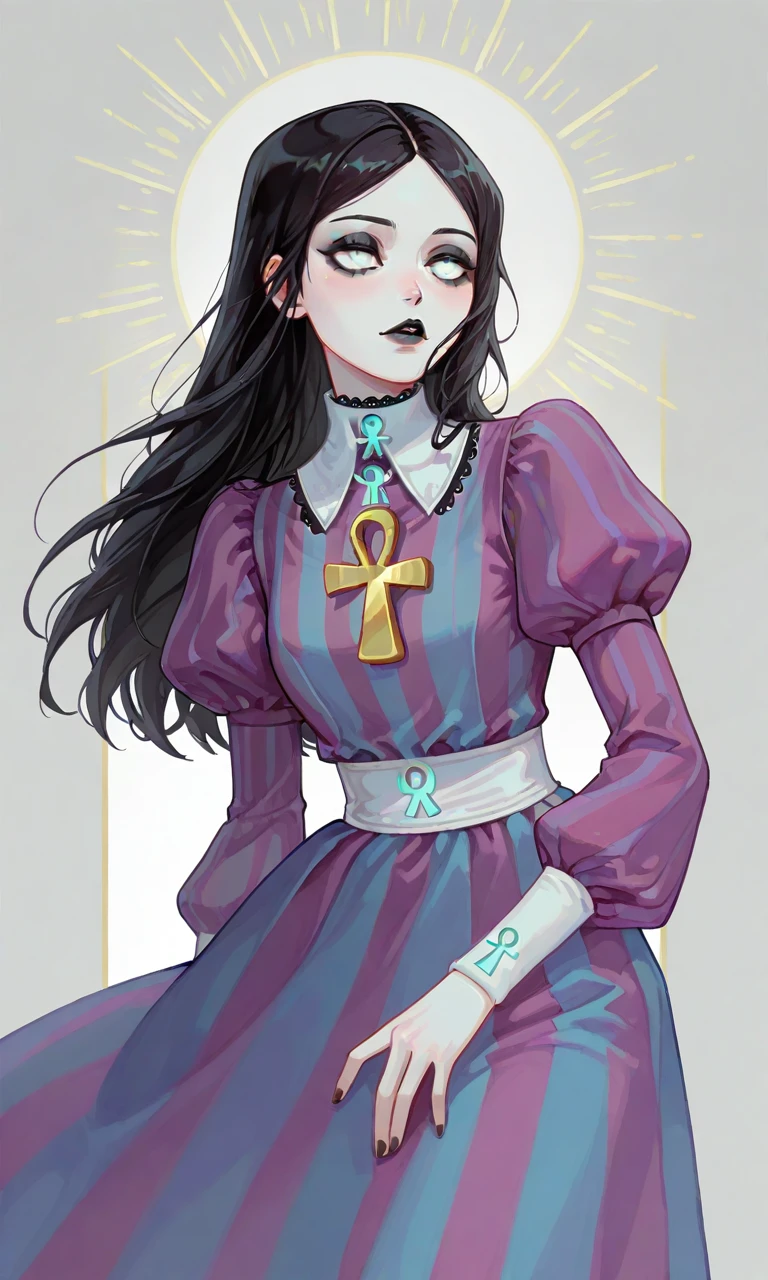 1girl,long hair,black hair,pale skin,white eyes,black eyeshadow,black lips,ankh,white-trimmed collar,collared dress,puffy short sleeves,long sleeves,white wristband,striped dress,vertical stripes,purple dress,blue dress