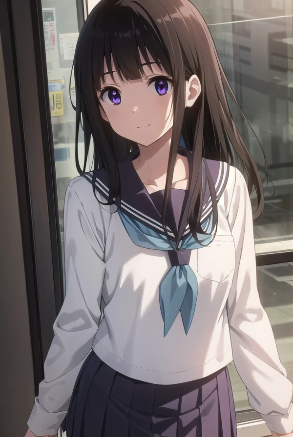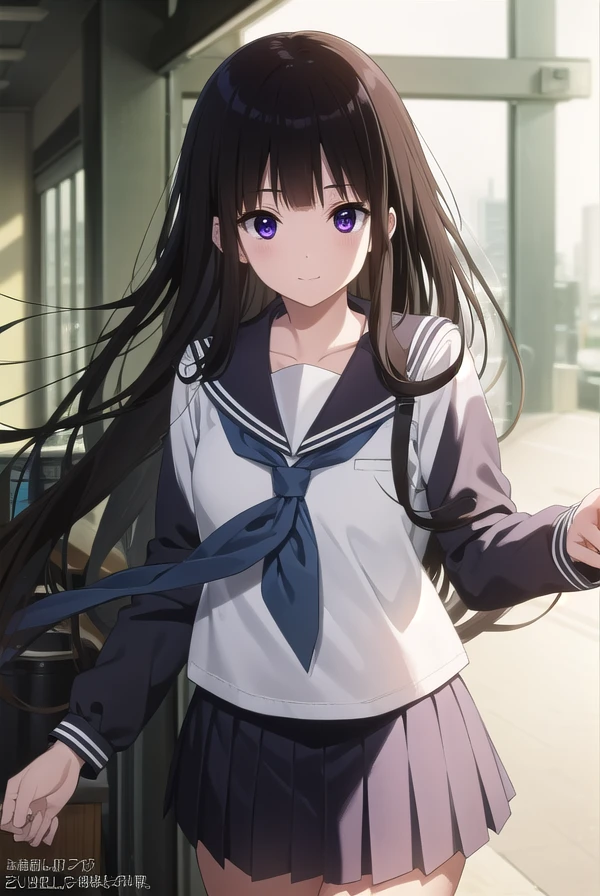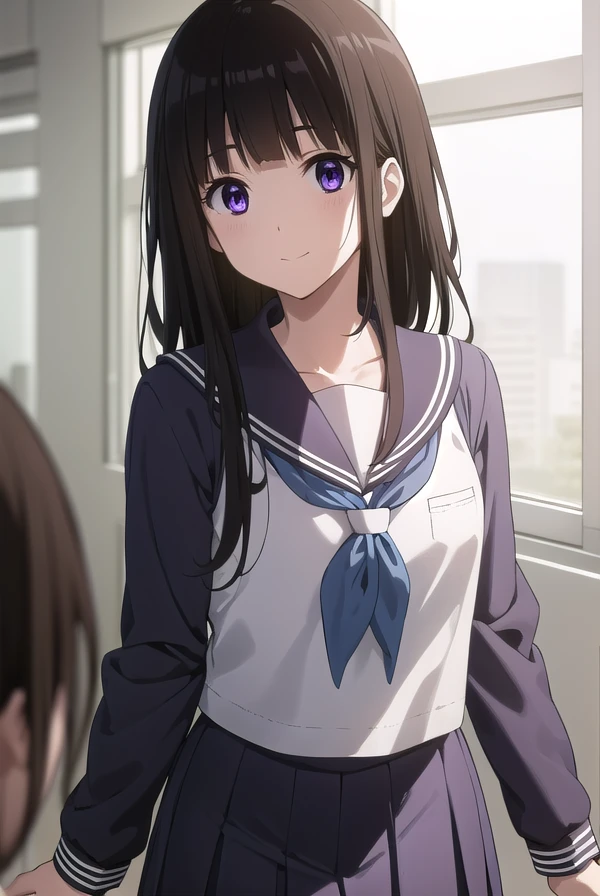 eru chitanda, long hair, black hair, bangs, blunt bangs, (purple eyes:1.1), sidelocks,