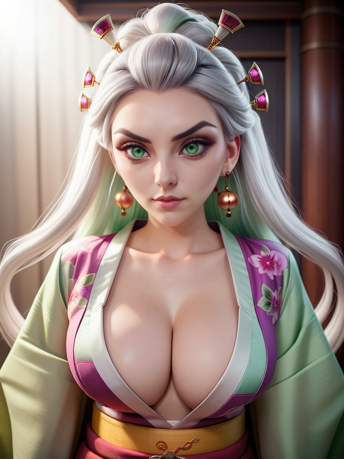 Core Tags: white hair, green hair, green eyes, hair pins, obi, sash.