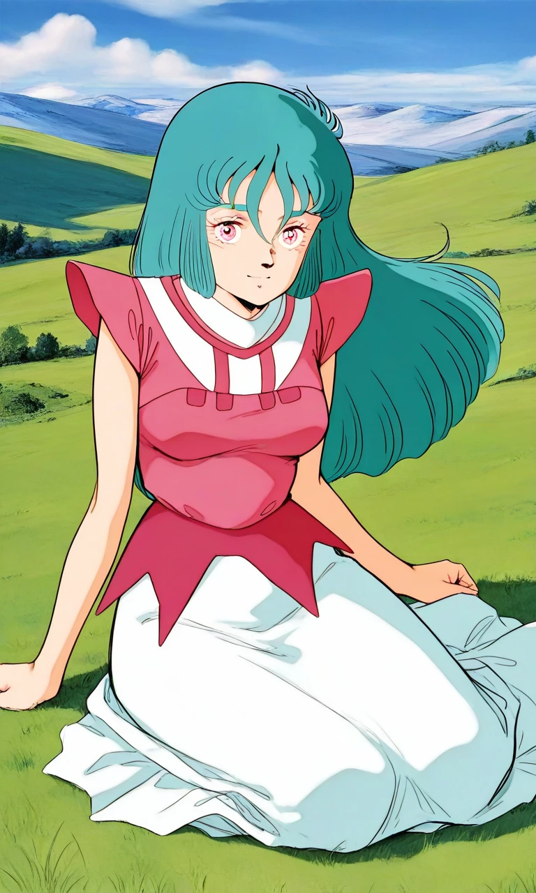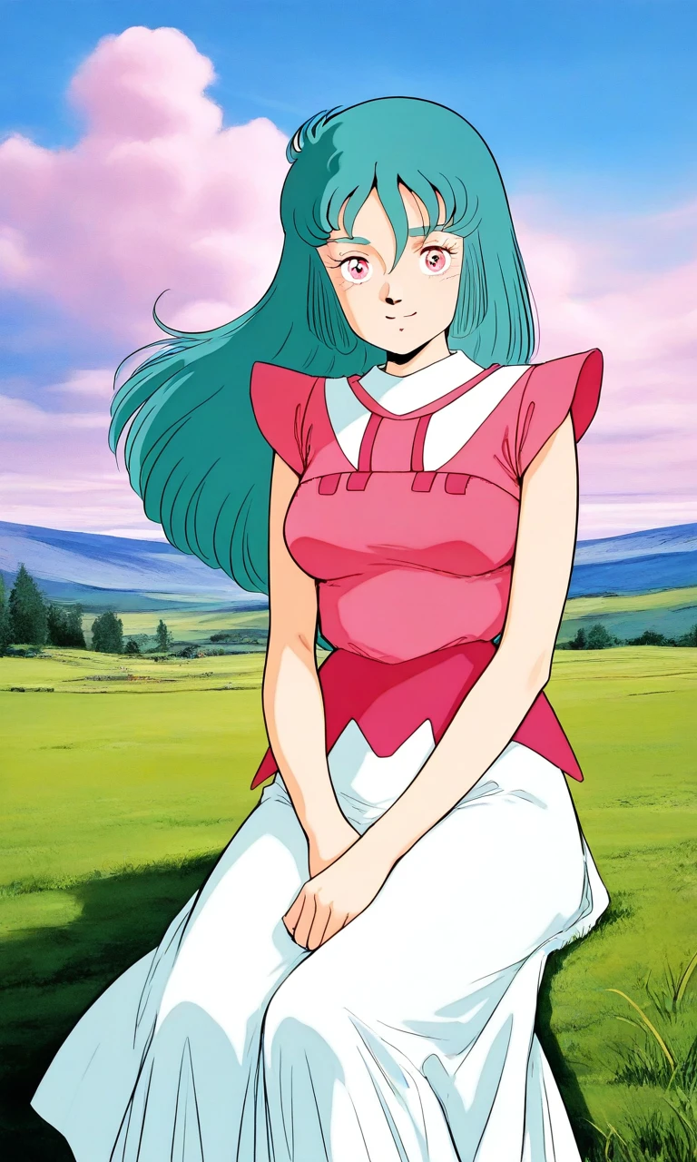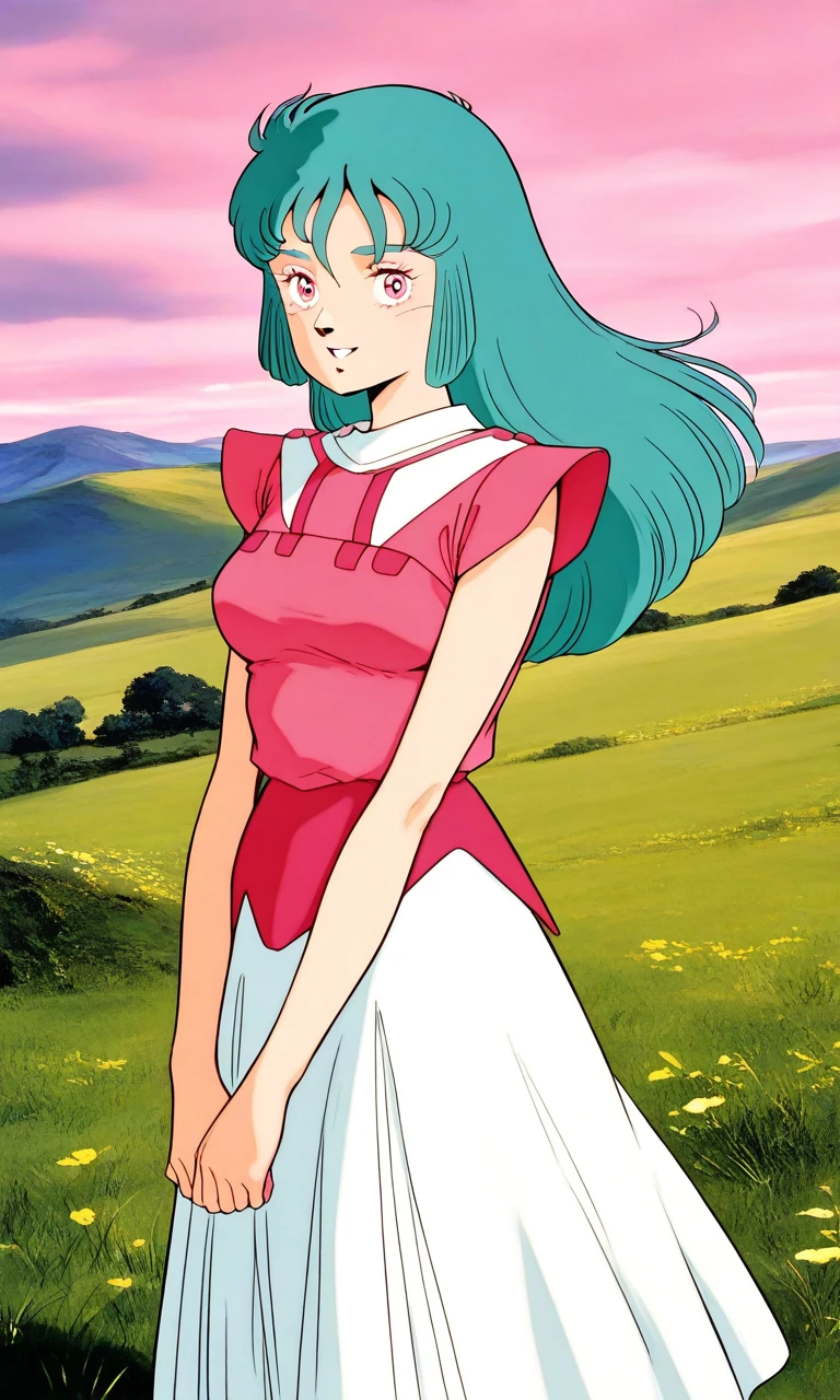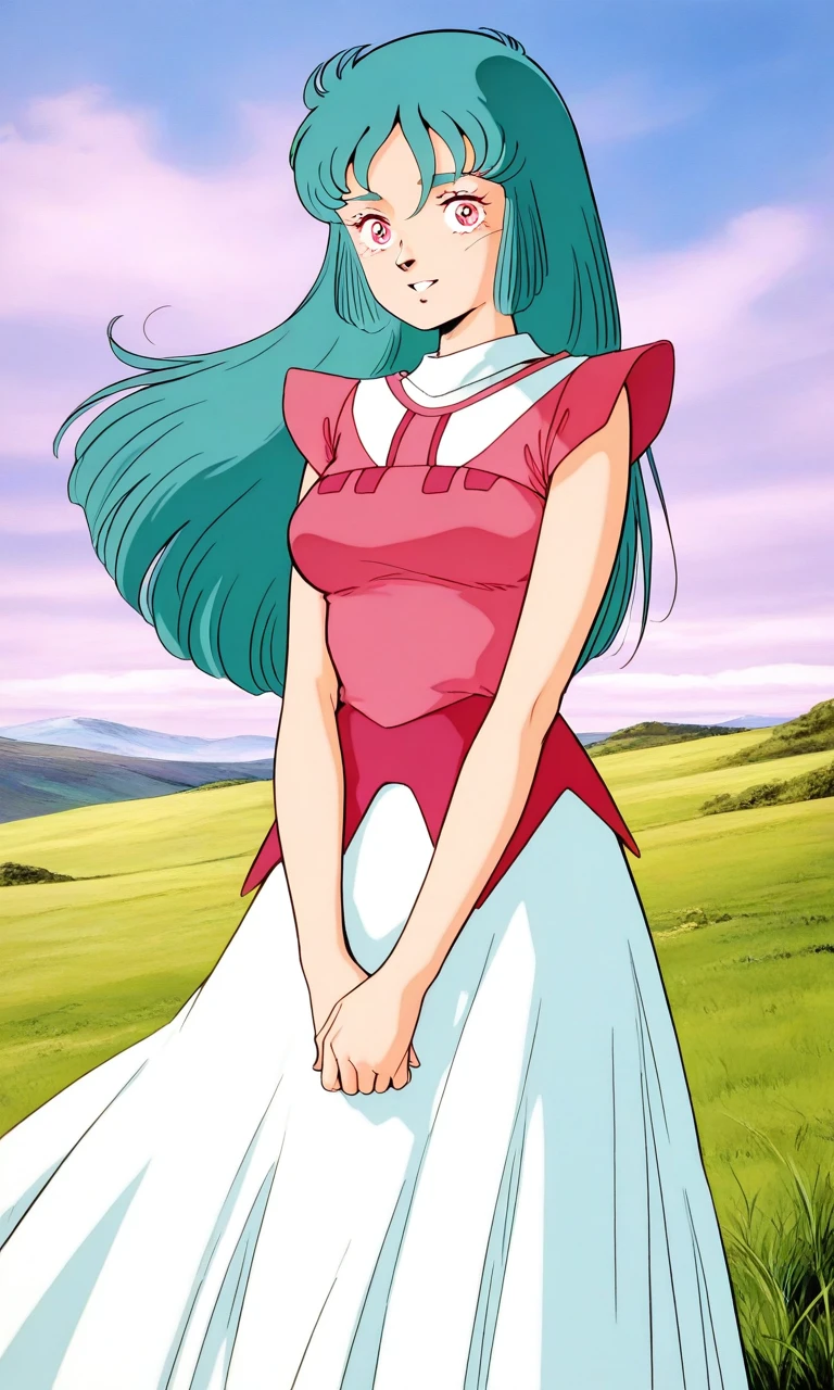 Ciela_Lapana, 1girl, solo, long hair, pink eyes, aqua hair, bangs, medium breasts, 1980s (style),