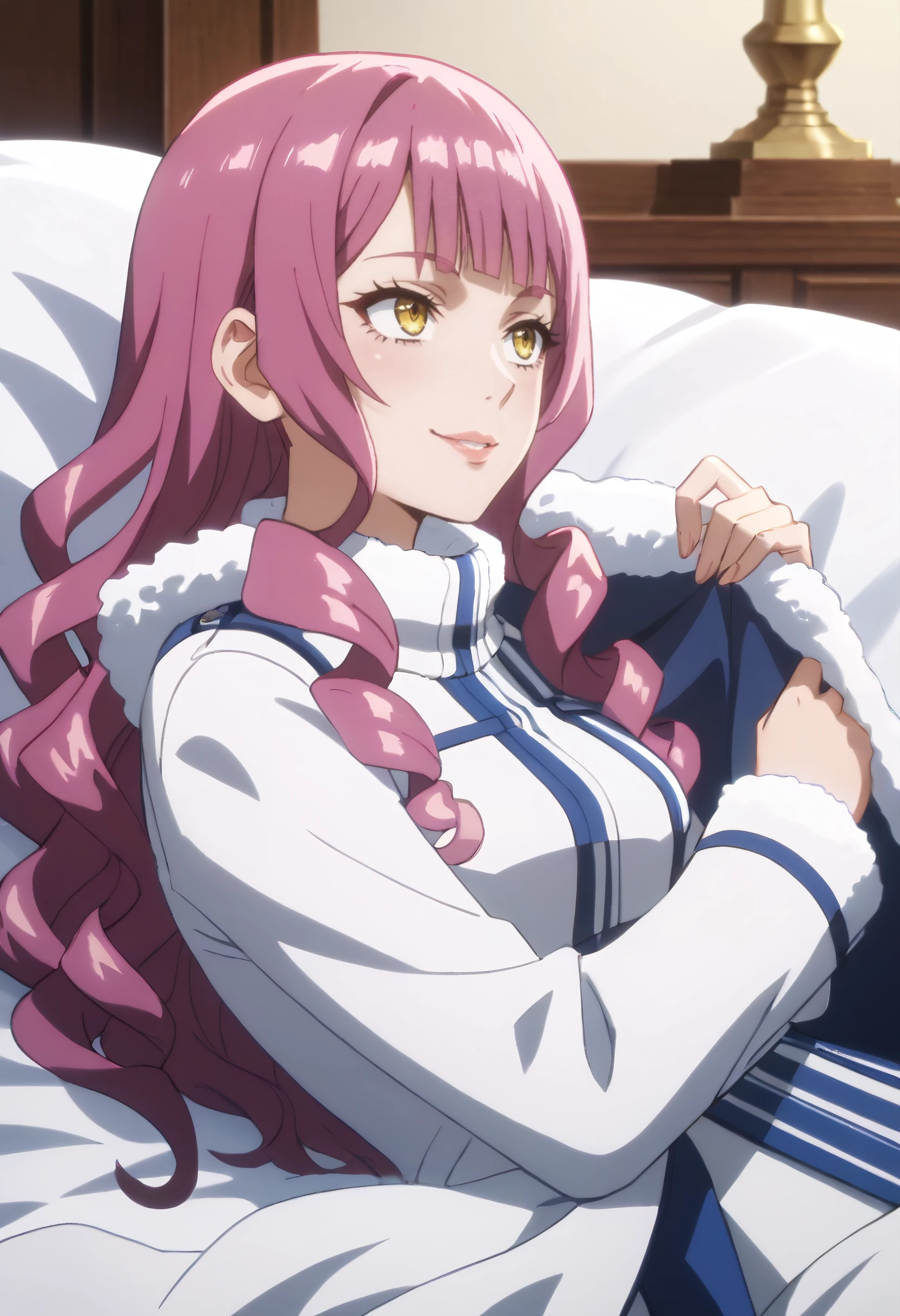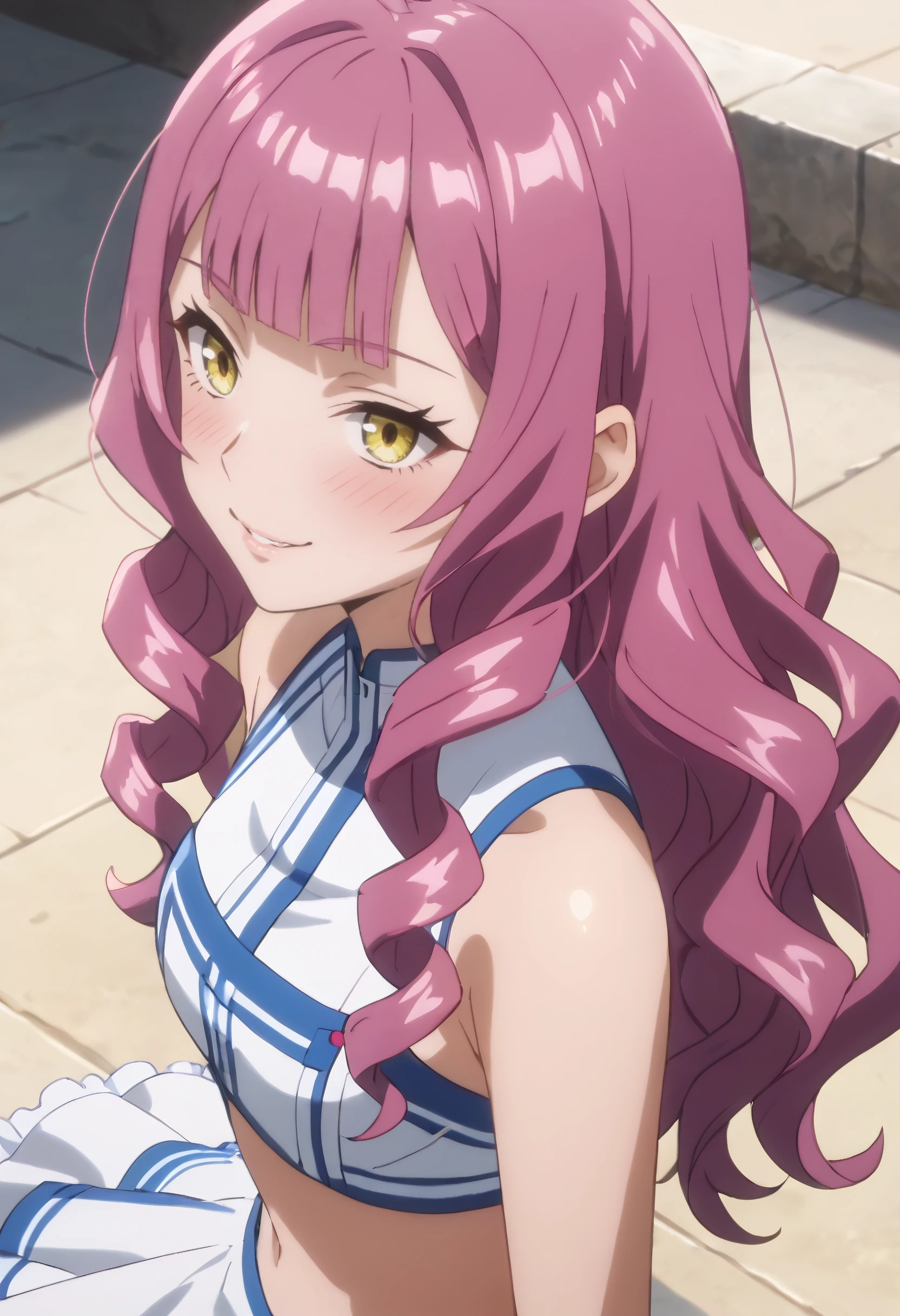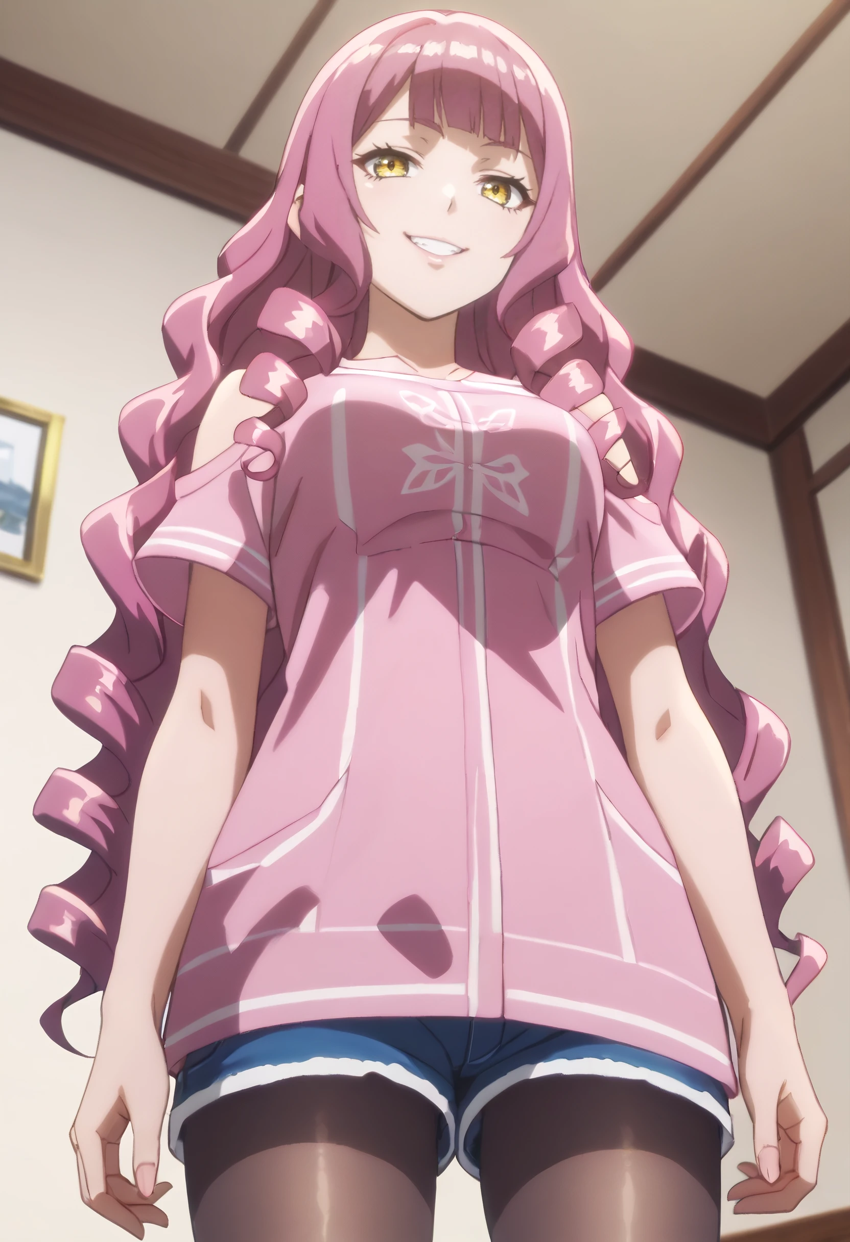 BNBMemil, long hair, yellow eyes, bangs, drill hair, pink hair, very long hair, blunt bangs, curly hair, wavy hair, multicolored hair, purple hair,