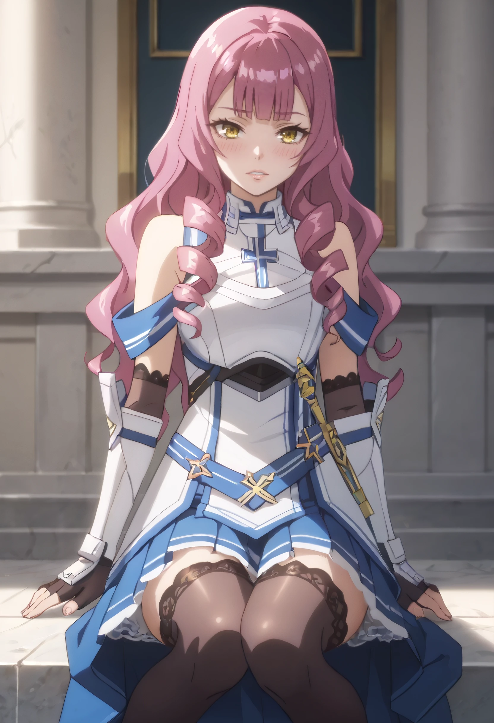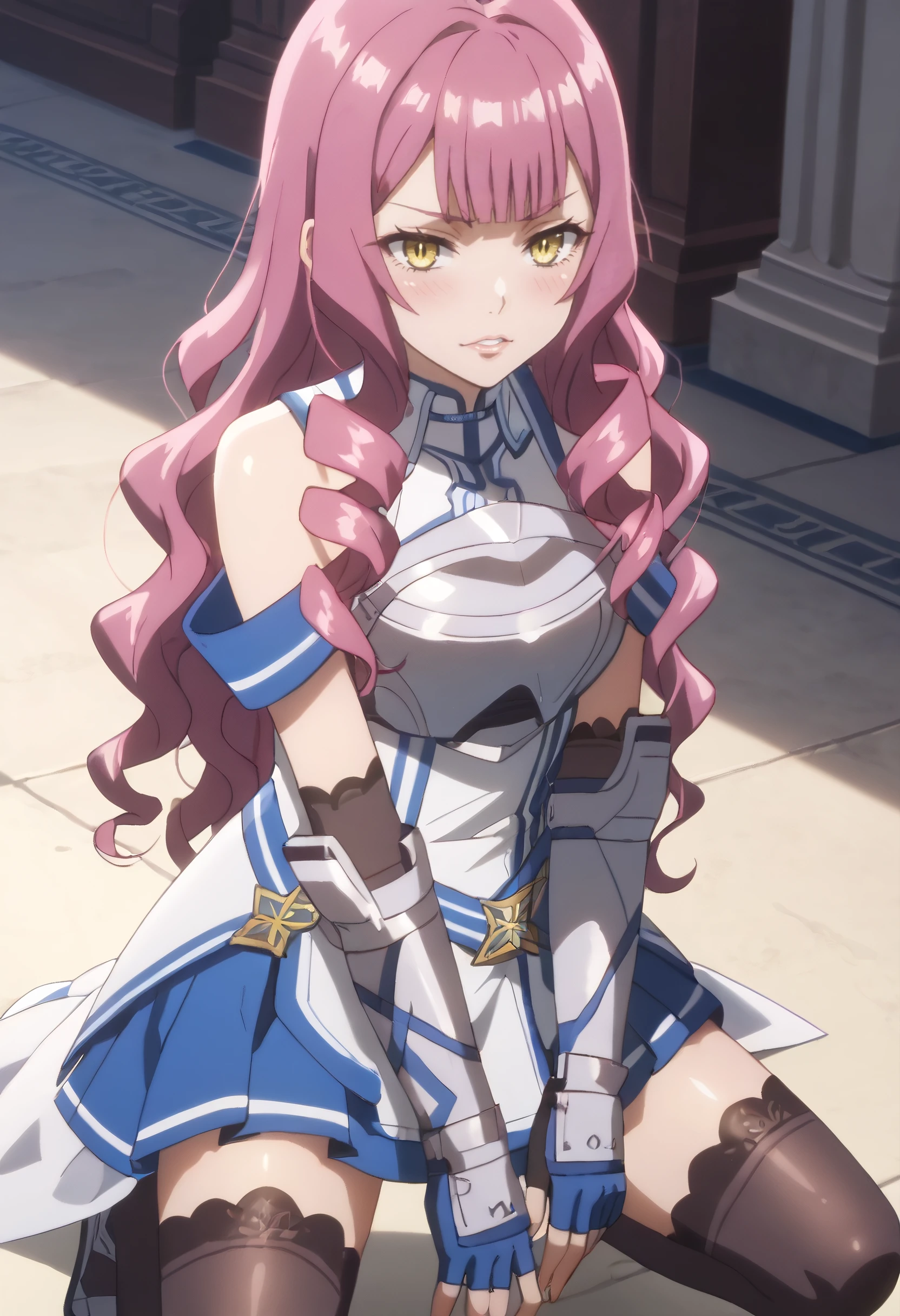 gloves, dress, thighhighs, elbow gloves, bare shoulders, armor, cross, sleeveless, skirt, fingerless gloves, white dress, shoulder, black legwear, pleated skirt,