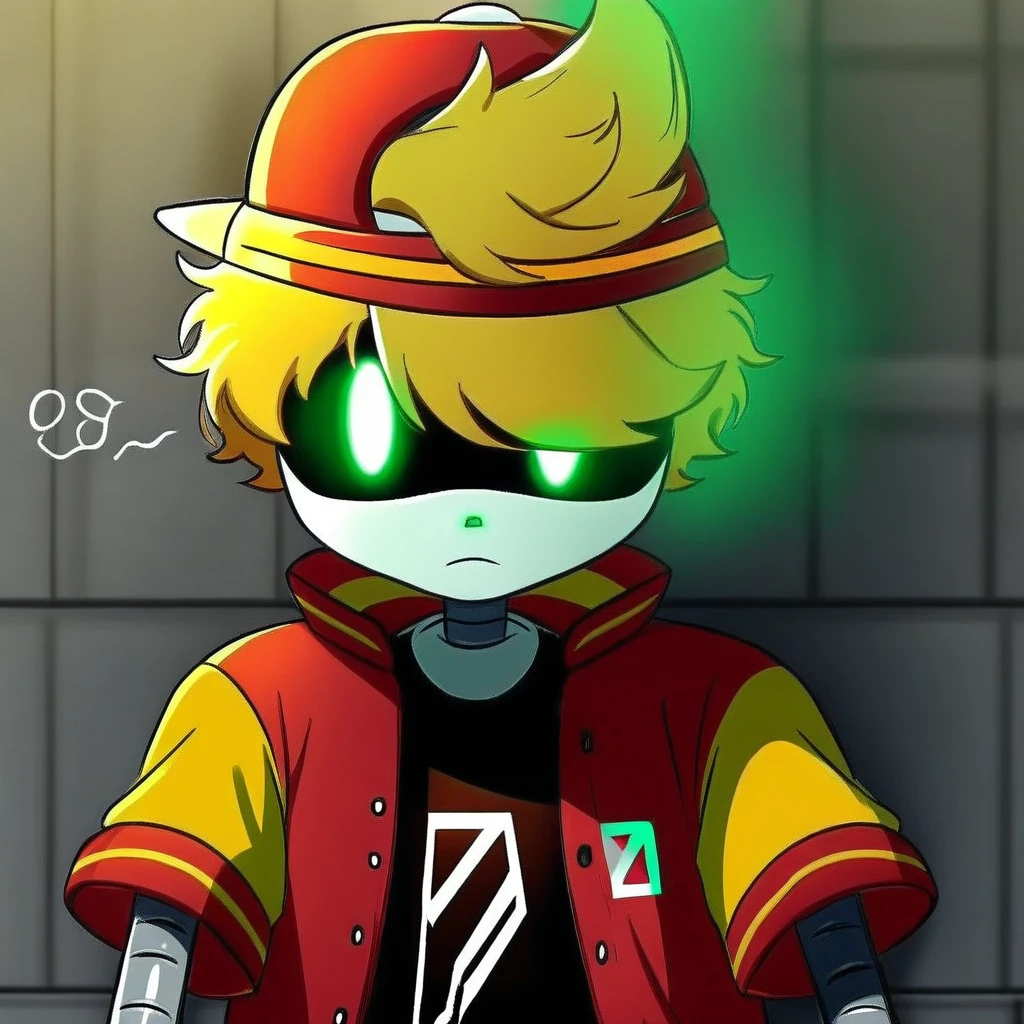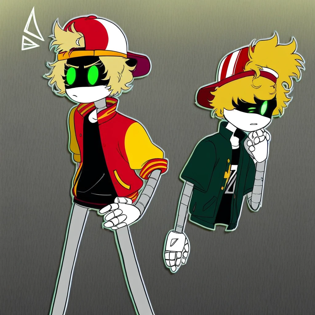 Thad, solo, solo male, robot, 1boy, blonde hair, hat, cap, backwards cap, green eyes, colored sclera, colored skin, robot boy, jacket, shirt