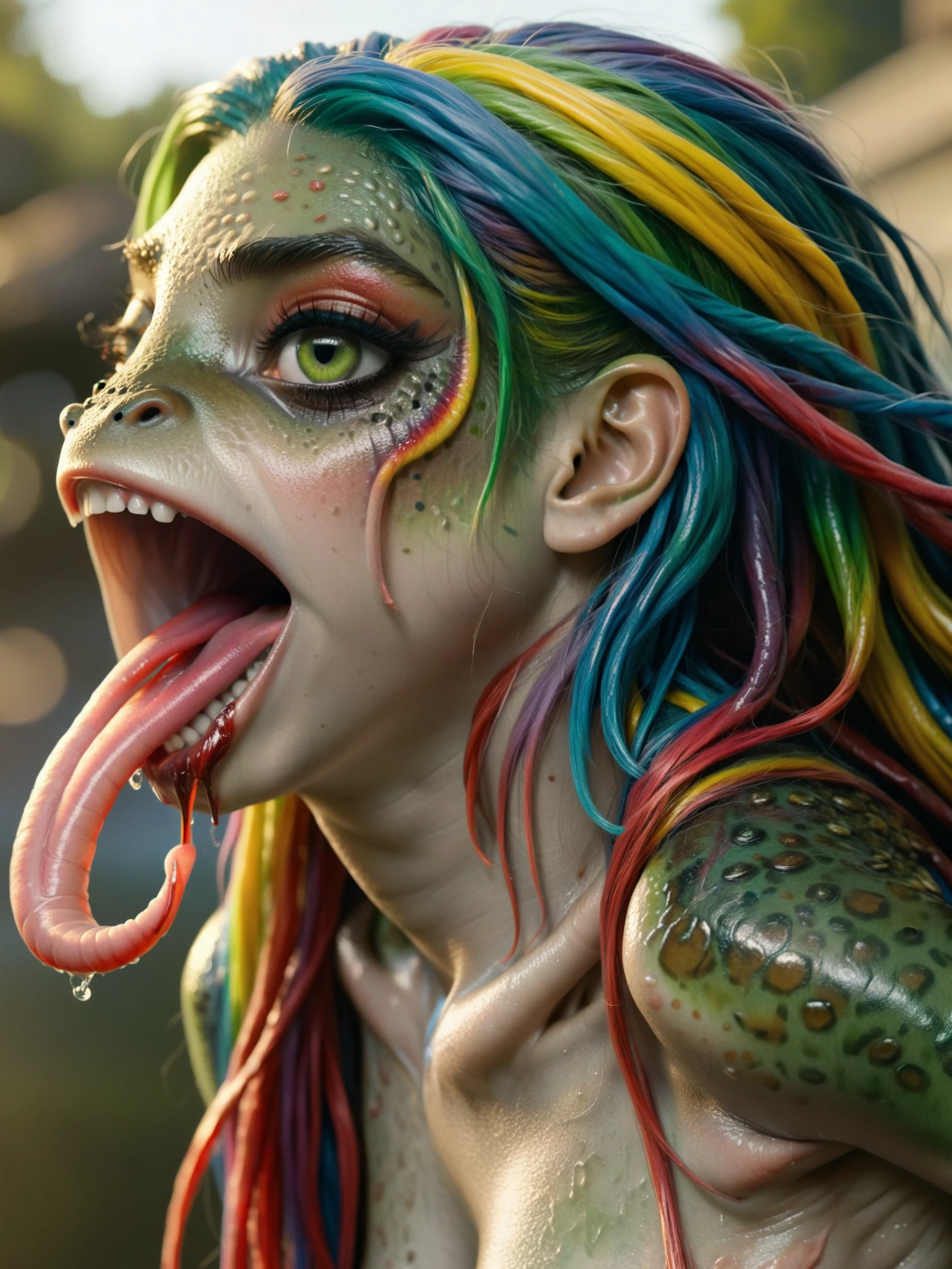 In general, a weight of 0.8-1.4 works well. The trigger word is "fr0g", but you can throw in frog features ("frog skin", "frog feet", etc) or "frog girl" to get things going. Add in "long tongue" for more frog tongue action, and tweak the weight if you get more tongues than you intended 😜. For a more subtle effect, just use "fr0g" and "green skin".