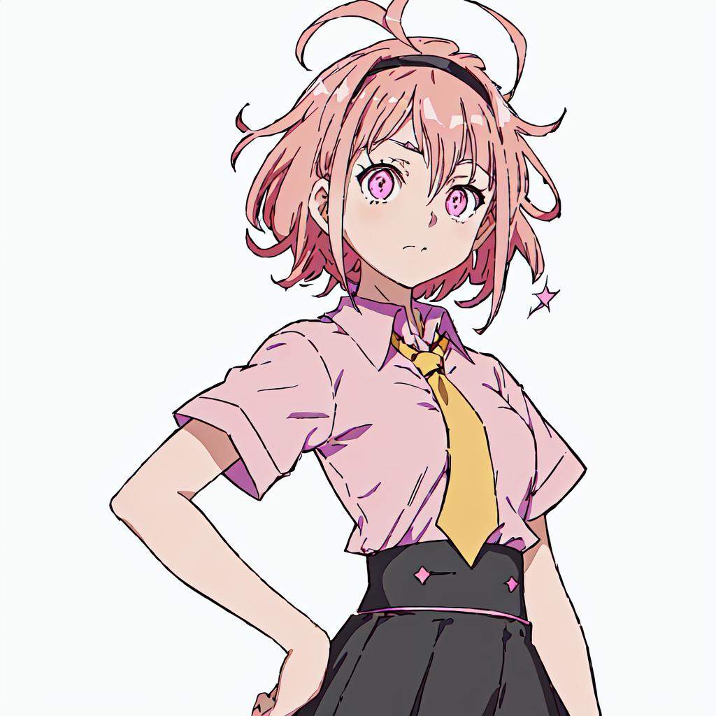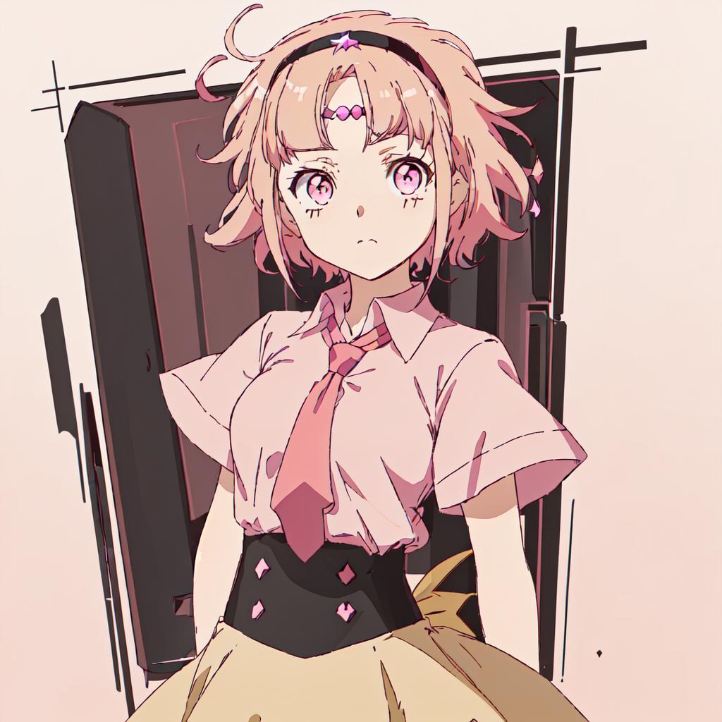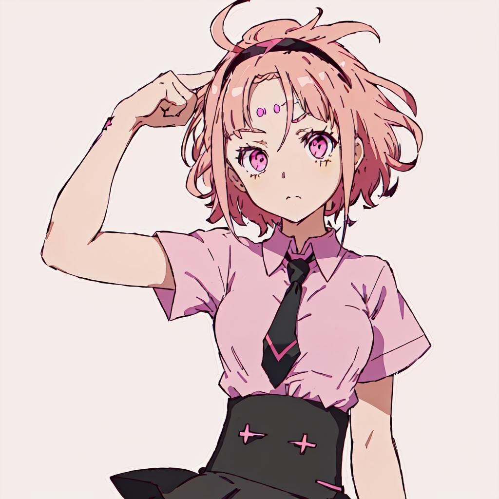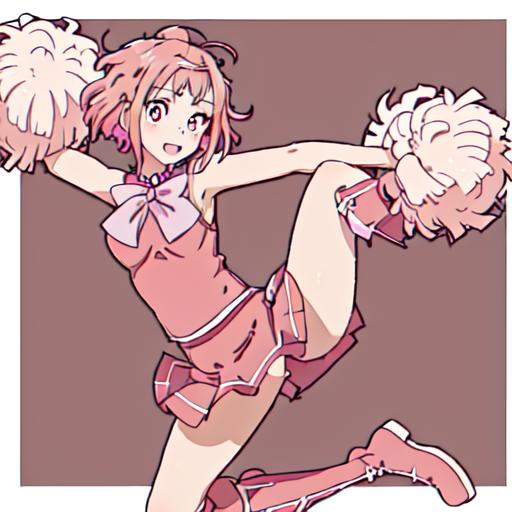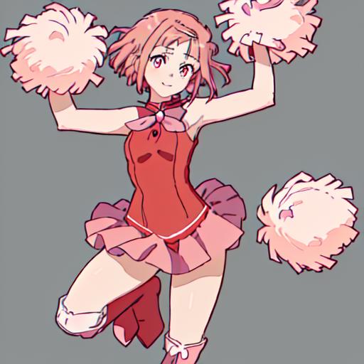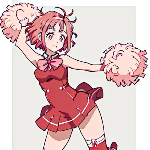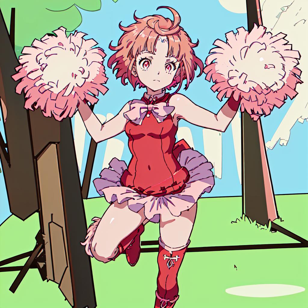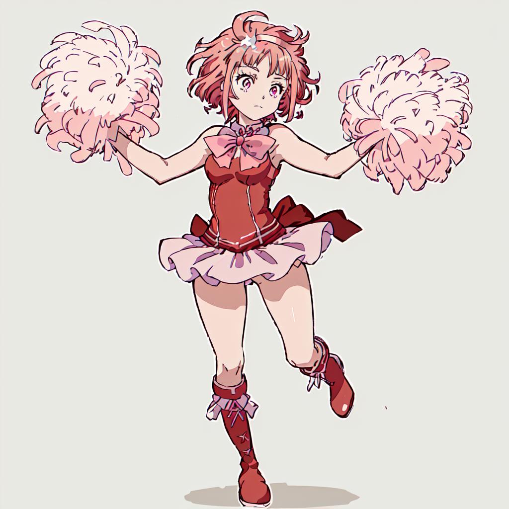 Noredo_Nug, 1girl, short hair, red dress, solo, short hair, hair ornament, pink hair, red boots, white bow, sleeveless, pink eyes, knee boots, cheerleader,forehead jewel,frill