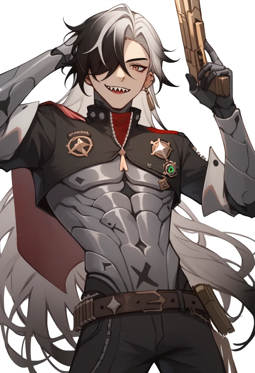 boothill_\(honkai:_star_rail\),male_focus,1boy,black_hair,white_hair,hair_over_one_eye,long_hair,two-tone_hair,sharp_teeth,split-color_hair,black_hat,earrings,ear_piercing,hat_feather,police_badge,brown_belt,