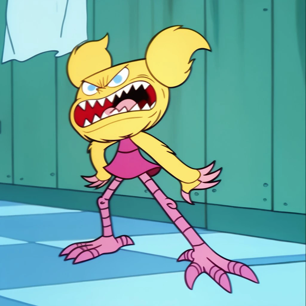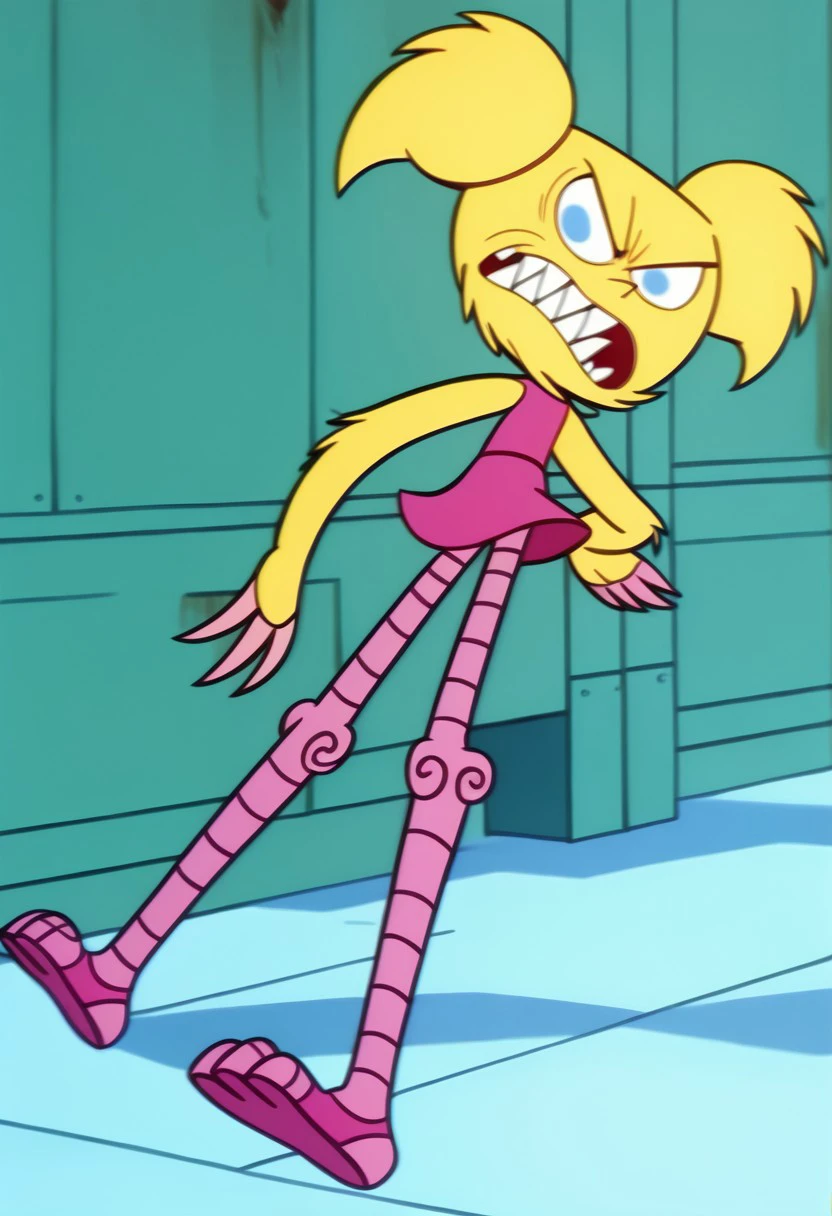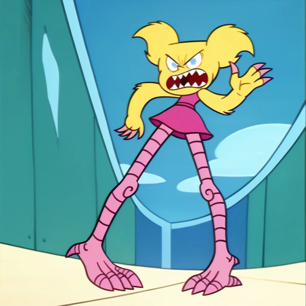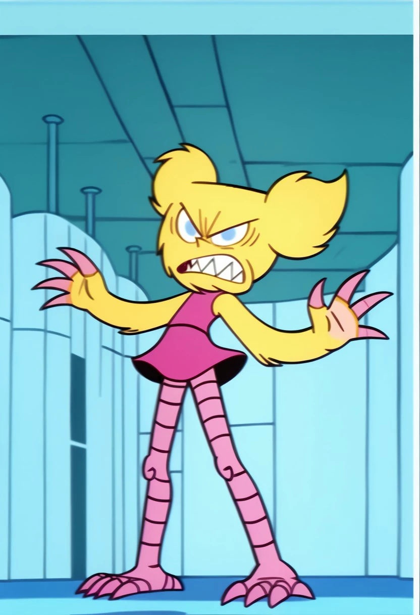 DeeMon, 1girl, blonde fur, light blue eyes, sharp pointy teeth, pink claws, pink legs