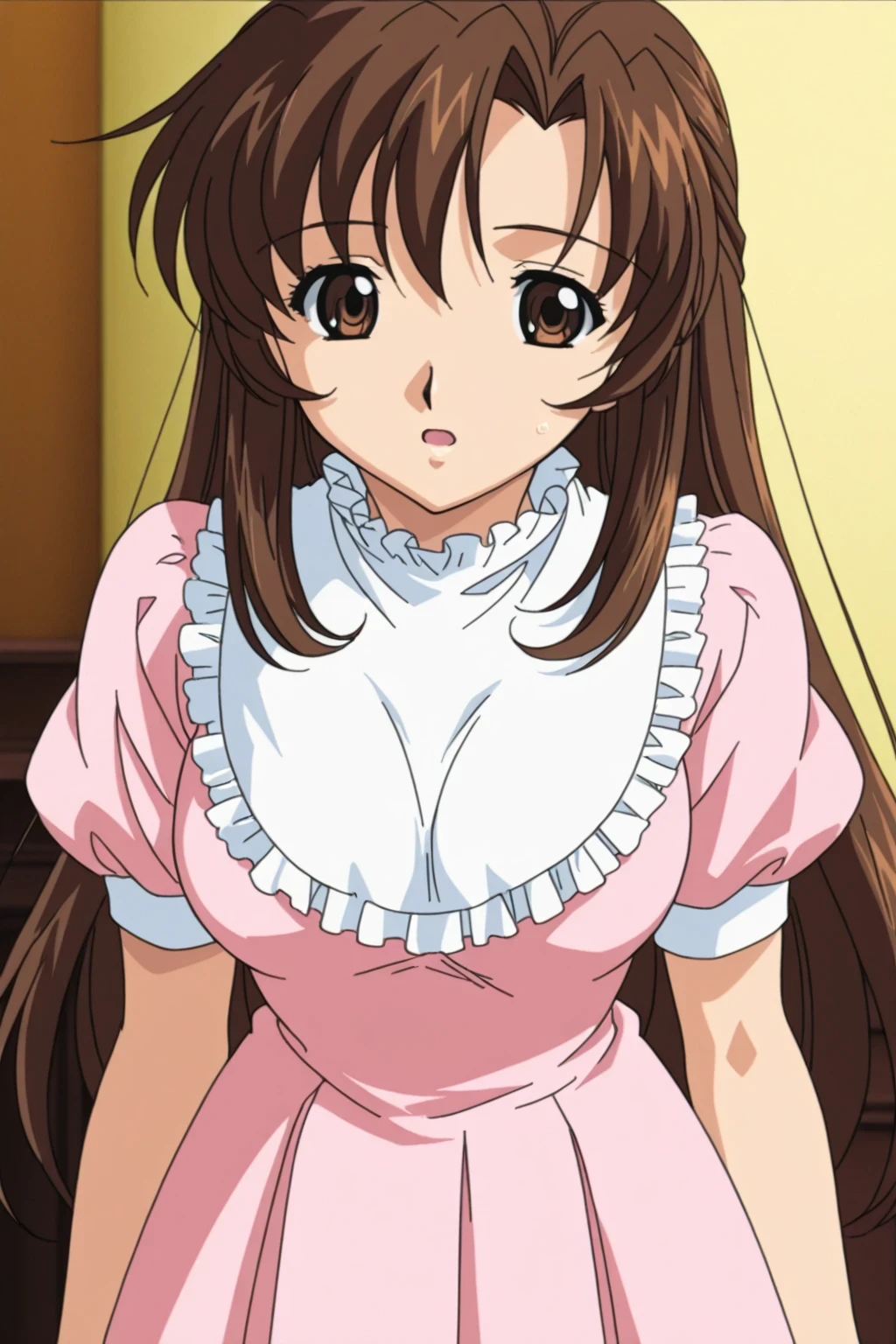 Takajou Nanako,anime coloring,Early 2000s style,brown hair,long hair,Parted in Middle,Sideburn curl,brown eyes,teen,