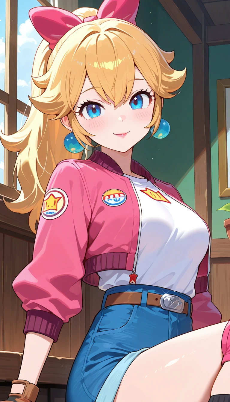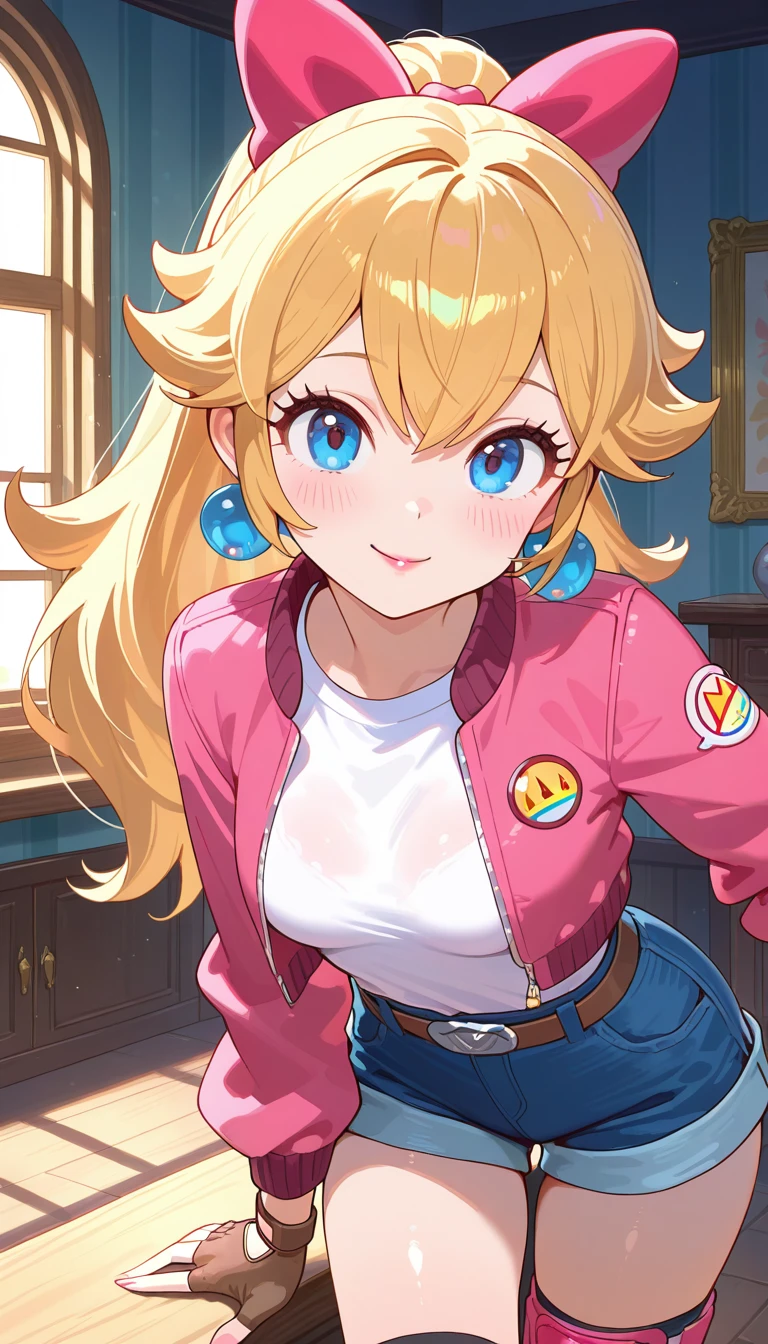 blonde hair,long hair,ponytail,hair bow,pink bow,jewelry,sphere earrings,sidelocks,hair between eyes,parted bangs,blue eyes
