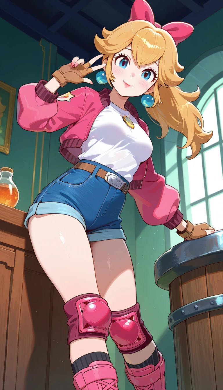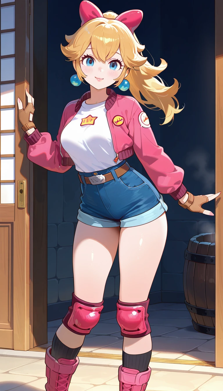 official alternate costume,pink jacket,cropped jacket,white shirt,long sleeves,fingerless gloves,medium breasts,shirt tucked in,brown belt,blue shorts,short shorts,shorts rolled up,pink knee pads,black socks,boots,pink footwear