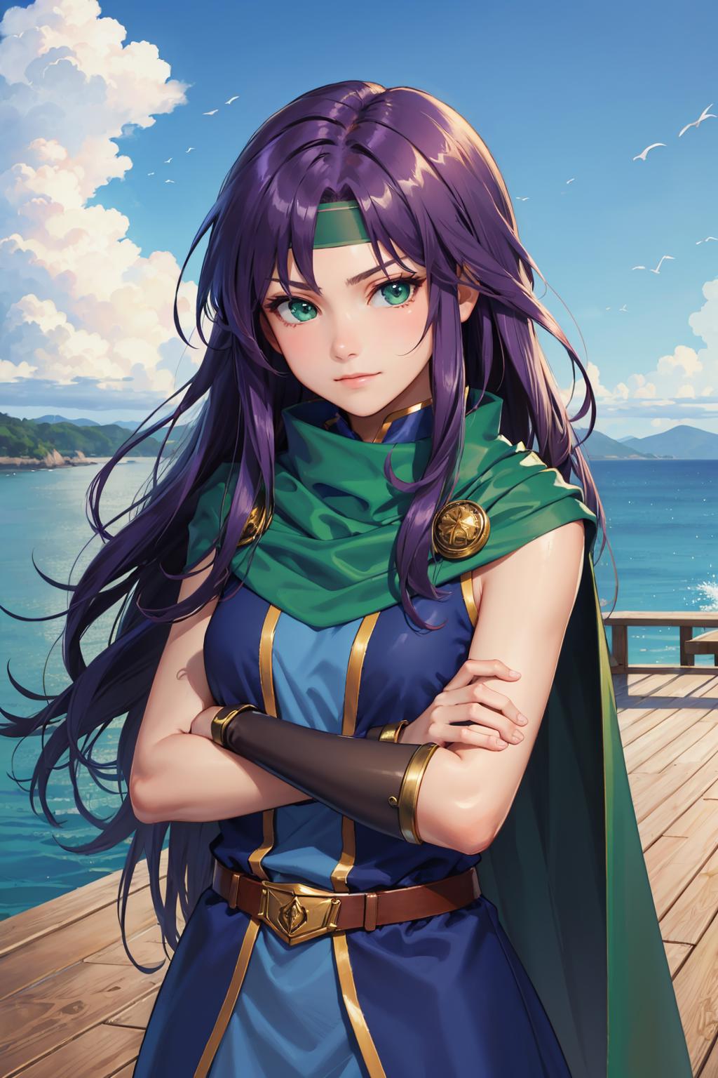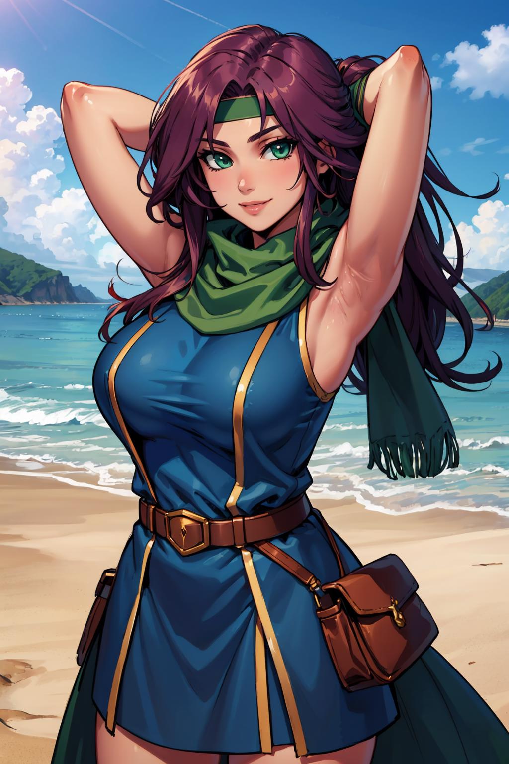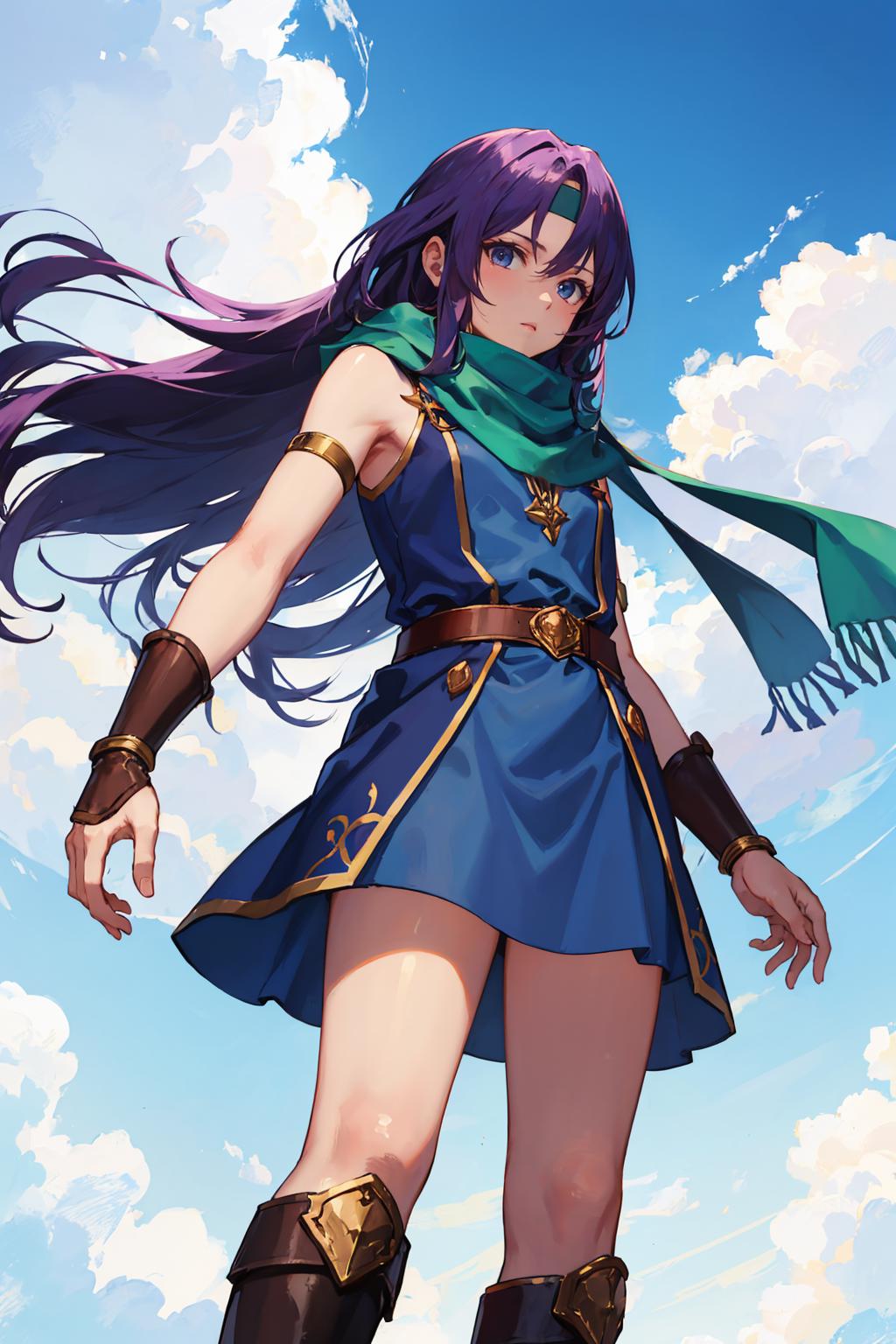 Add "headband, scarf, blue dress, bracer, short dress, belt" for her typical look.