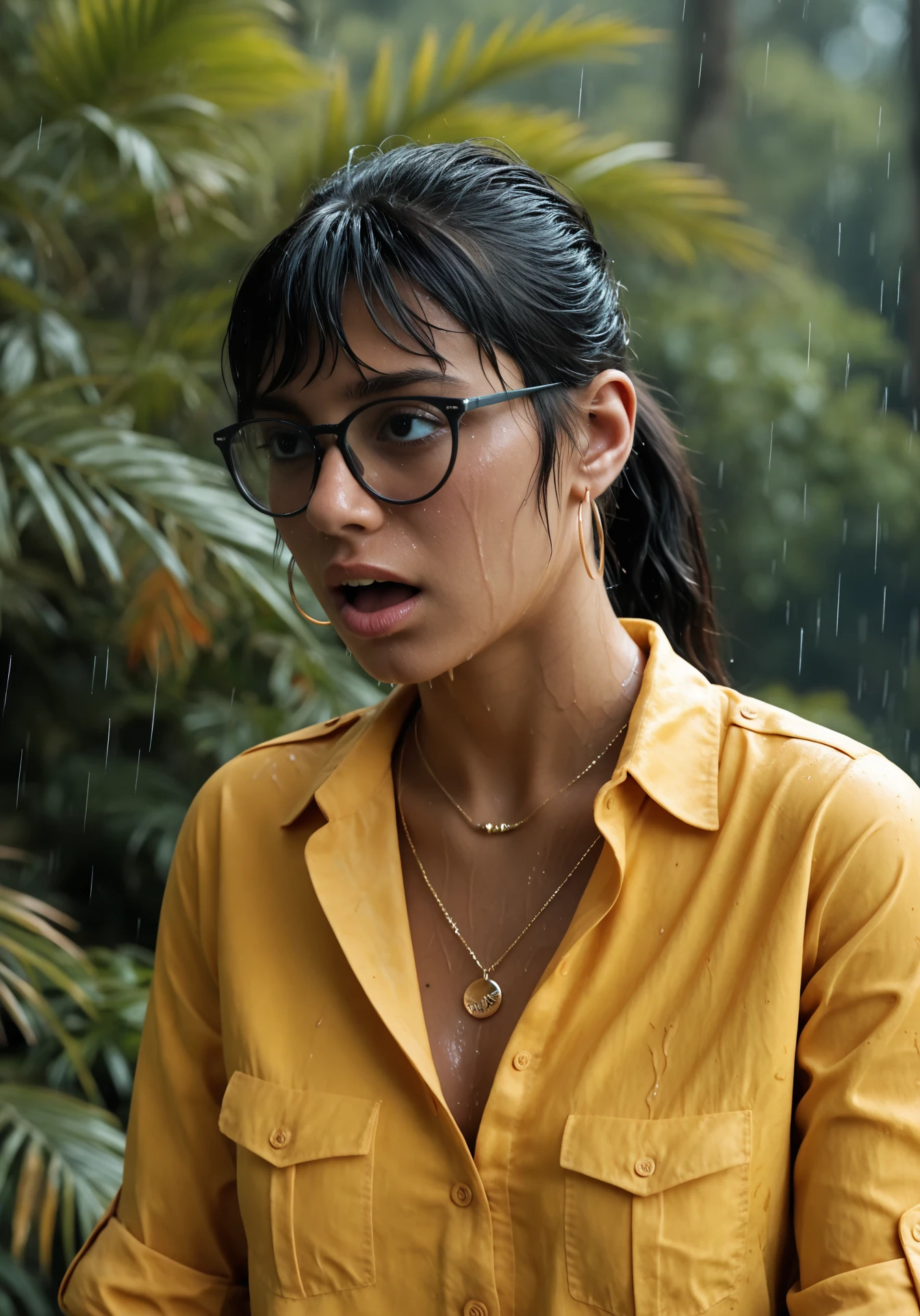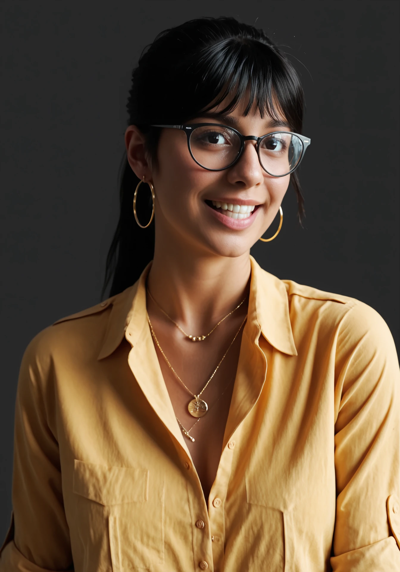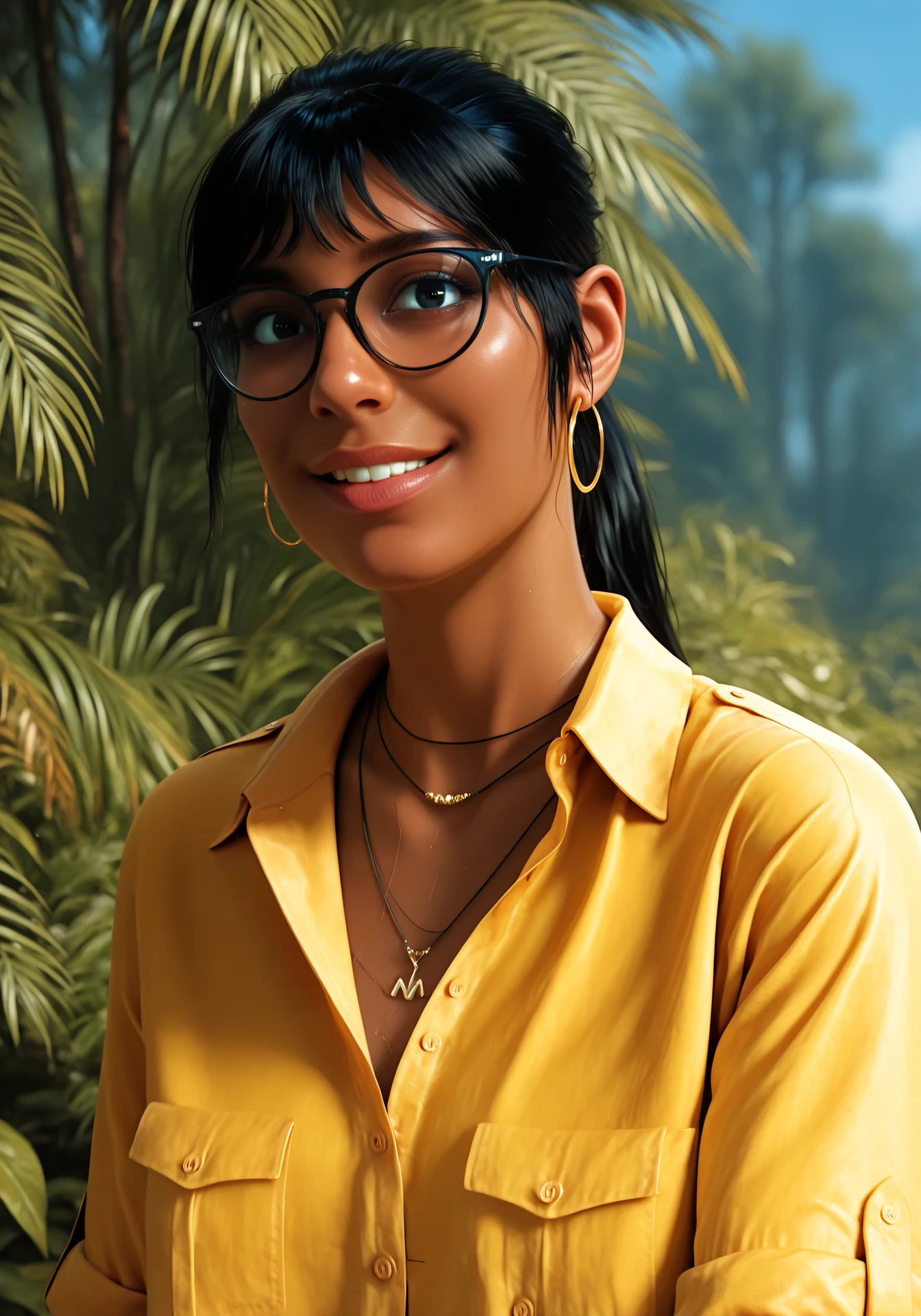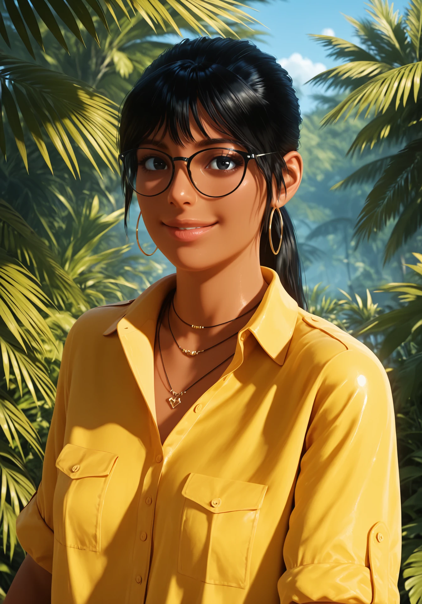 dark skinned female, black hair, ponytail, black eyes, glasses