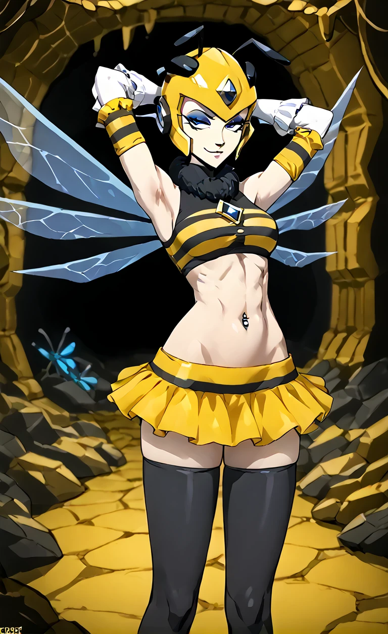 female robot, bee lady, skirt, blue eyes, eyeshadow, wings, black tights, white gloves,