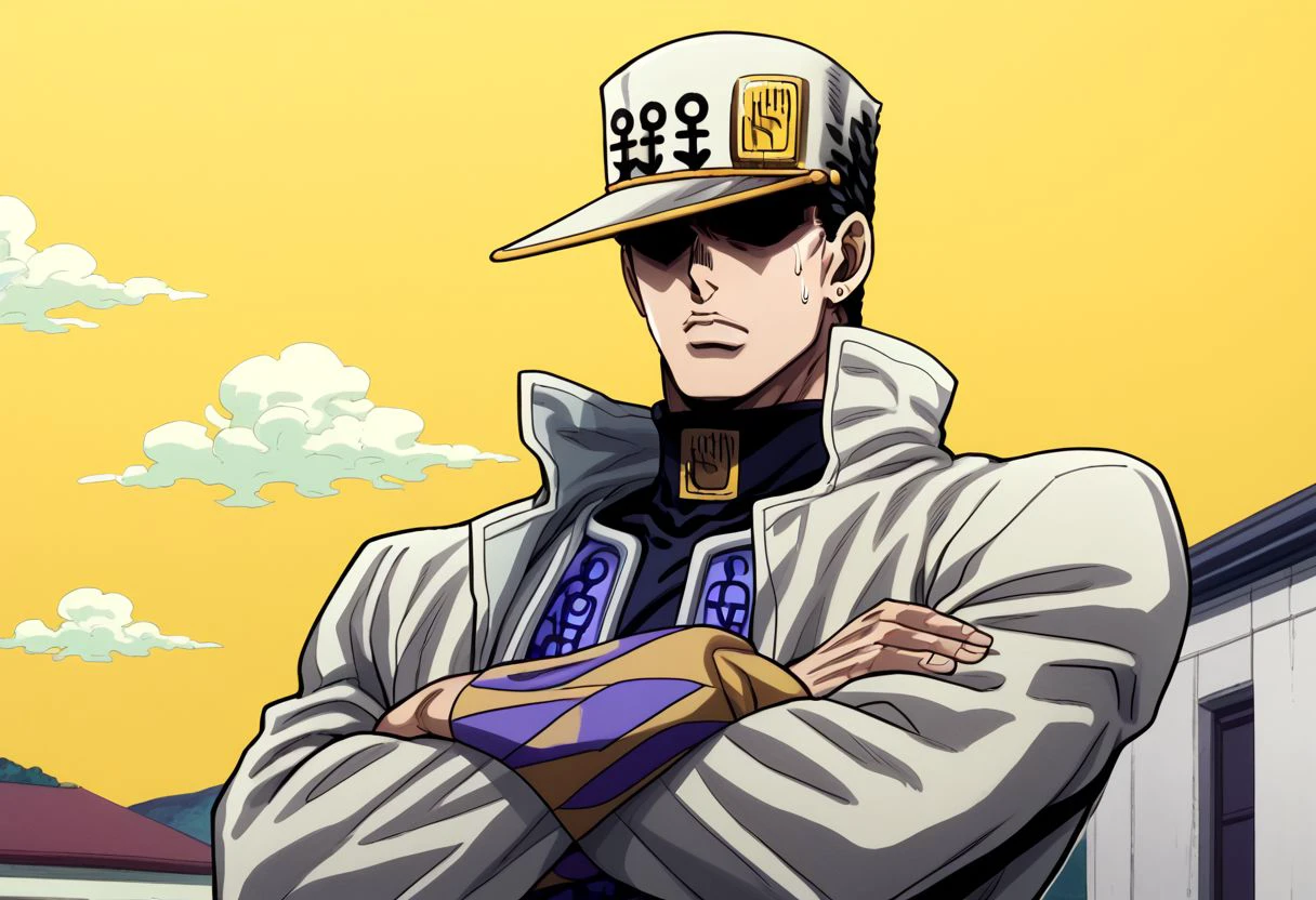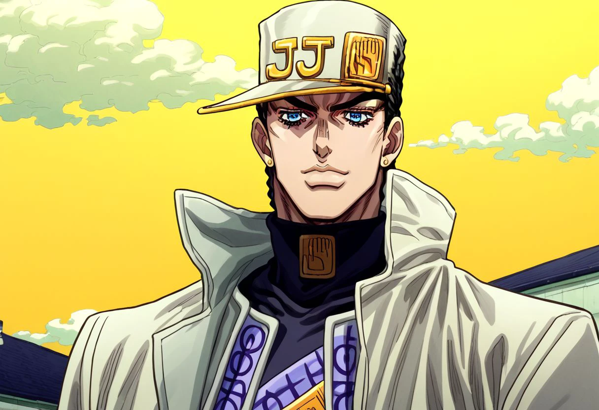 Jotaro Kujo, black hair, hat, jewelry, blue eyes, stud earrings, muscular, white coat, trench coat, multiple belts, anime style, JoJo, white pants