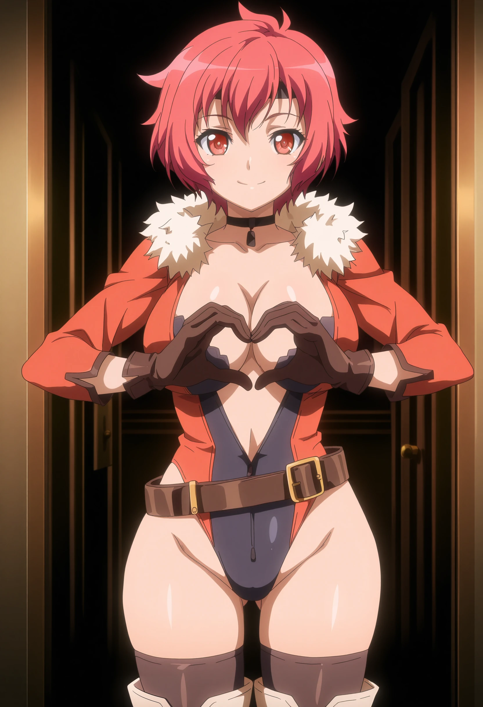 Maia (character) | red hair, short hair, red eyes, large breasts | fur trim, belt, gloves, choker, leotard, cleavage, boots, thighhighs,