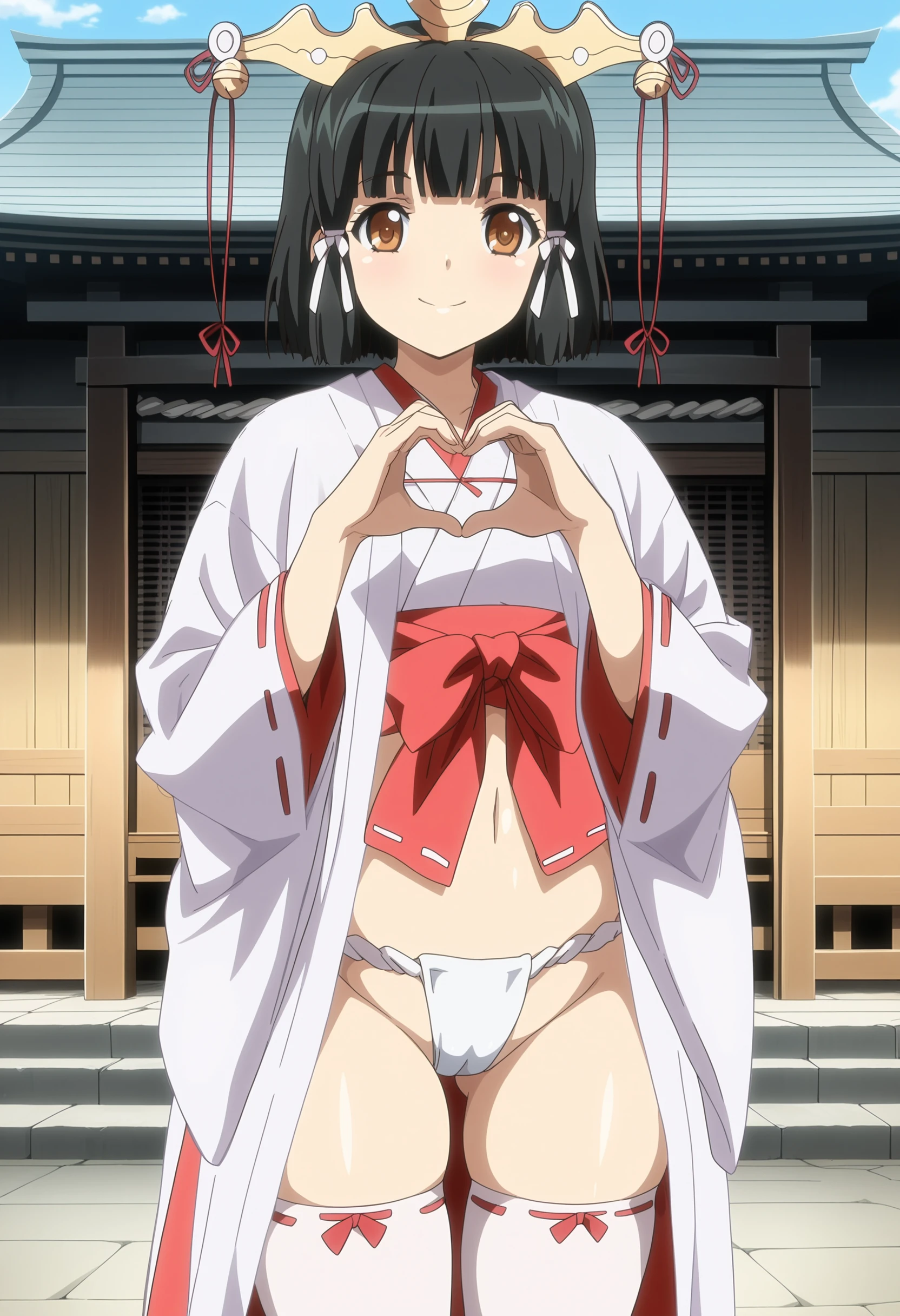 Kaguya (character) | black hair, brown eyes, | miko, Japanese clothes, thighhighs, hair ribbon, ribbon, maebari, fundoshi, wide sleeves, crown | ofuda (try: ofuda covering vagina),