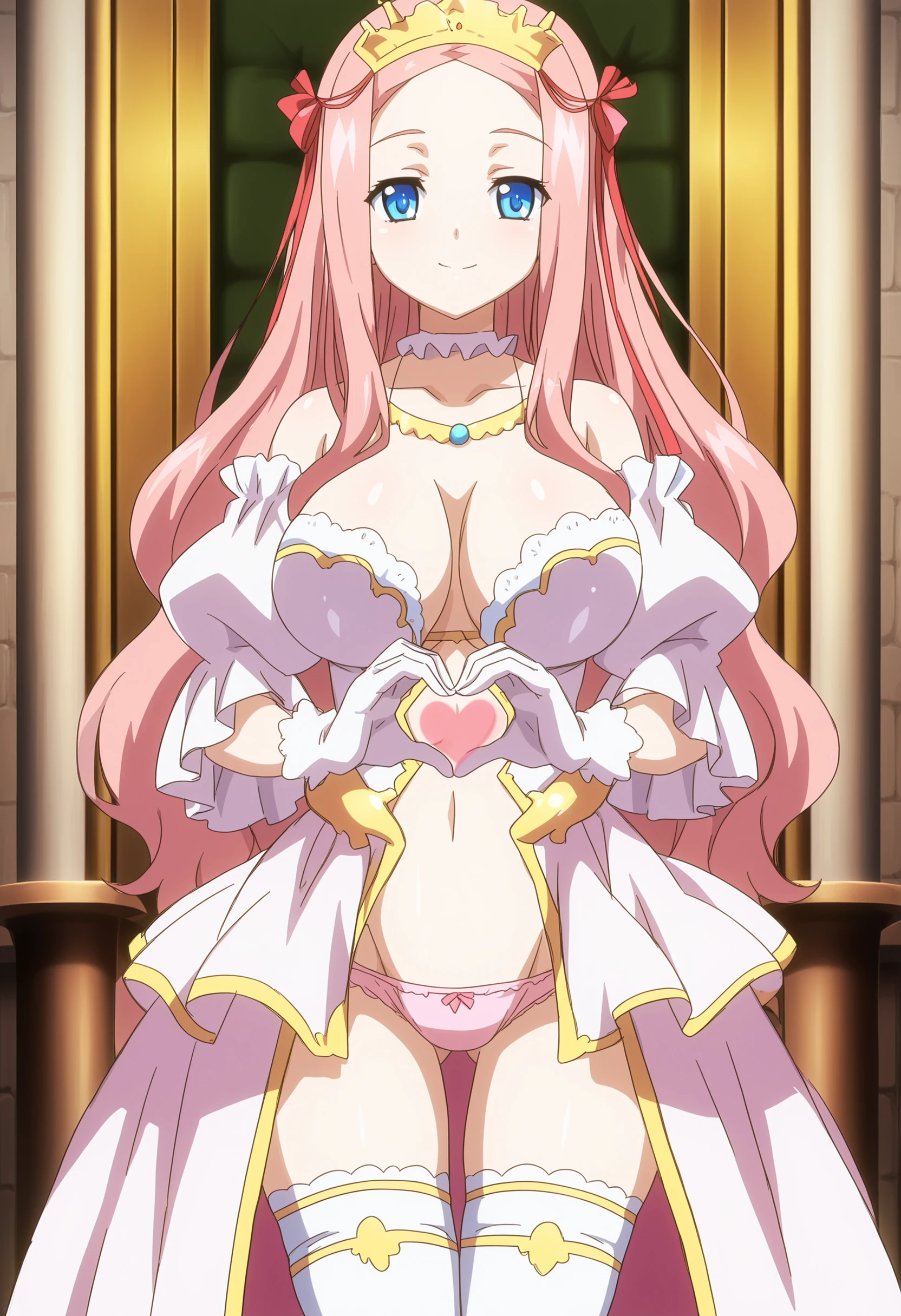 Prim Fiorire (character) | pink hair, long hair, blue eyes, large breasts, | necklace, underwear, pink panties, thighhighs, crown, ribbon, hair ribbon, skirt, gloves | dress