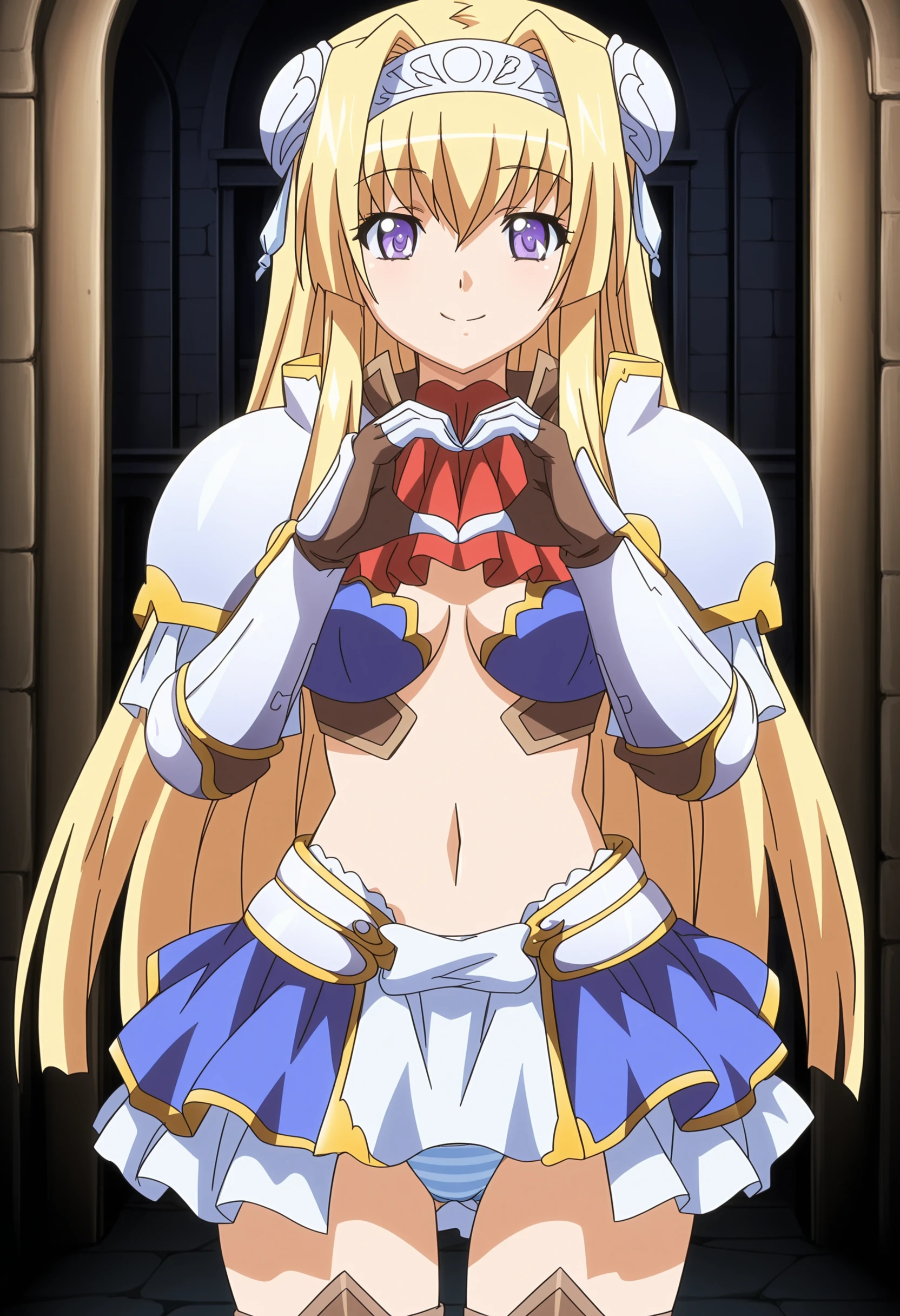 Alicia Arcturus (character) | blonde hair, long hair, purple eyes, breasts, | headband, thighhighs, armor, clevage, midriff, skirt, gloves, panties