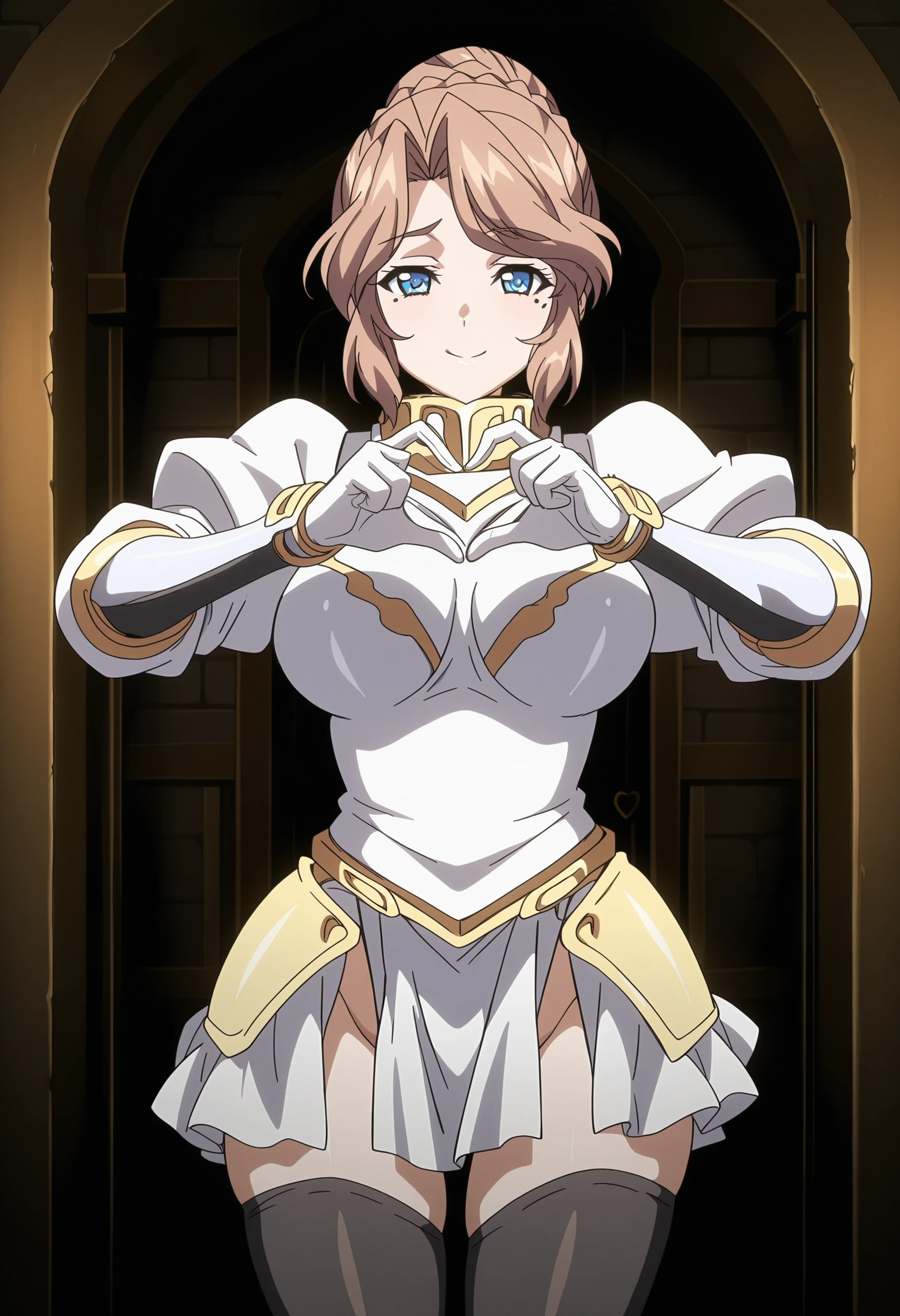 Claudia Levantine (character) | brown hair, hair bun, braid, large breasts, blue eyes, mole under eye, | armor, helmet, white gloves, thigh highs