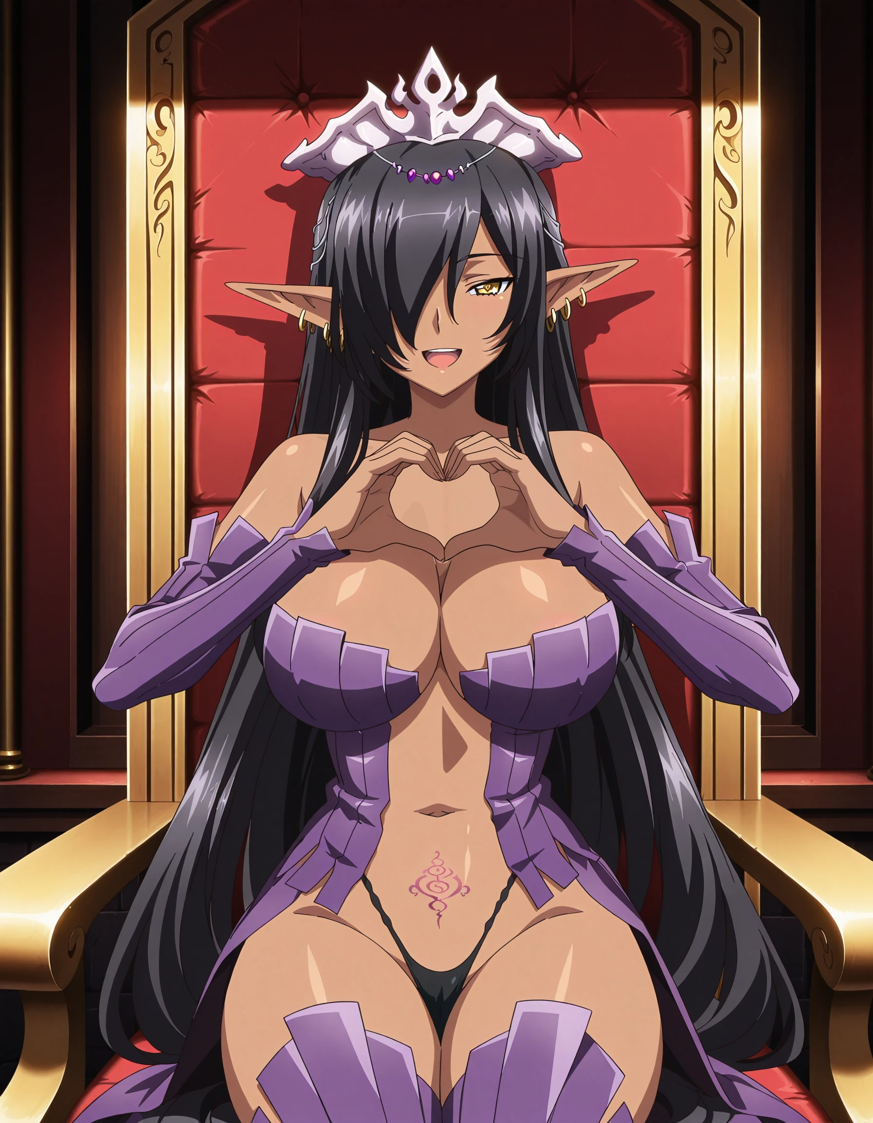 Olga Discordia (character) | long hair, hair over one eye, black hair, dark skin, large breasts, elf, pointy ears, earrings | purple thighhighs, highlegs, jewelry, cleavage, panties, armor, black thong, pubic tattoo, tattoo | crown