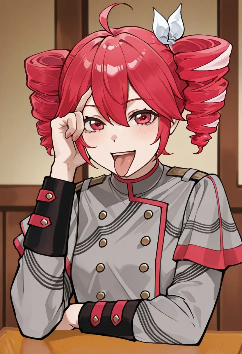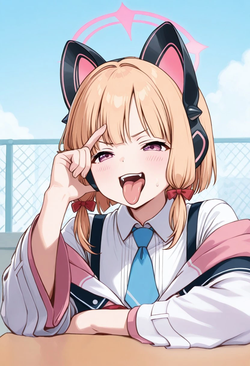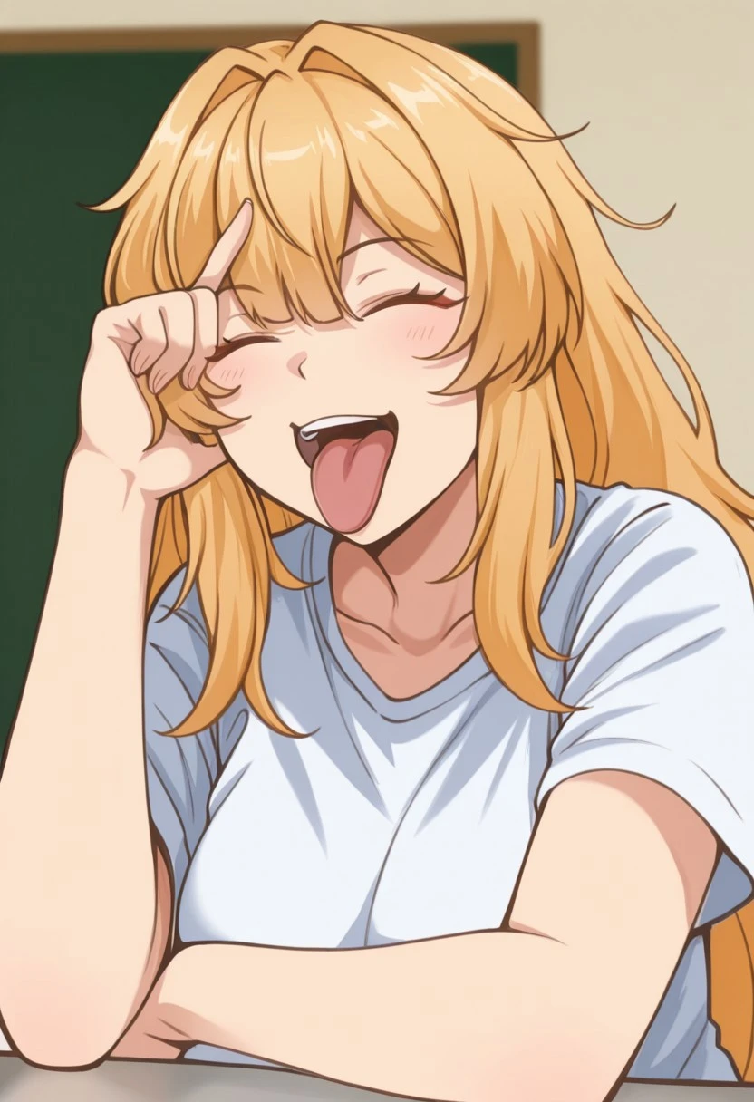 solo, 1girl, solo, blonde, long hair, orange eyes, t-shirt, aldn_frky_pose, hand on head, hand on table, table, tongue out, open mouth, smile, closed eyes, indoor, masterpiece, 4k resolutionㅤㅤ
