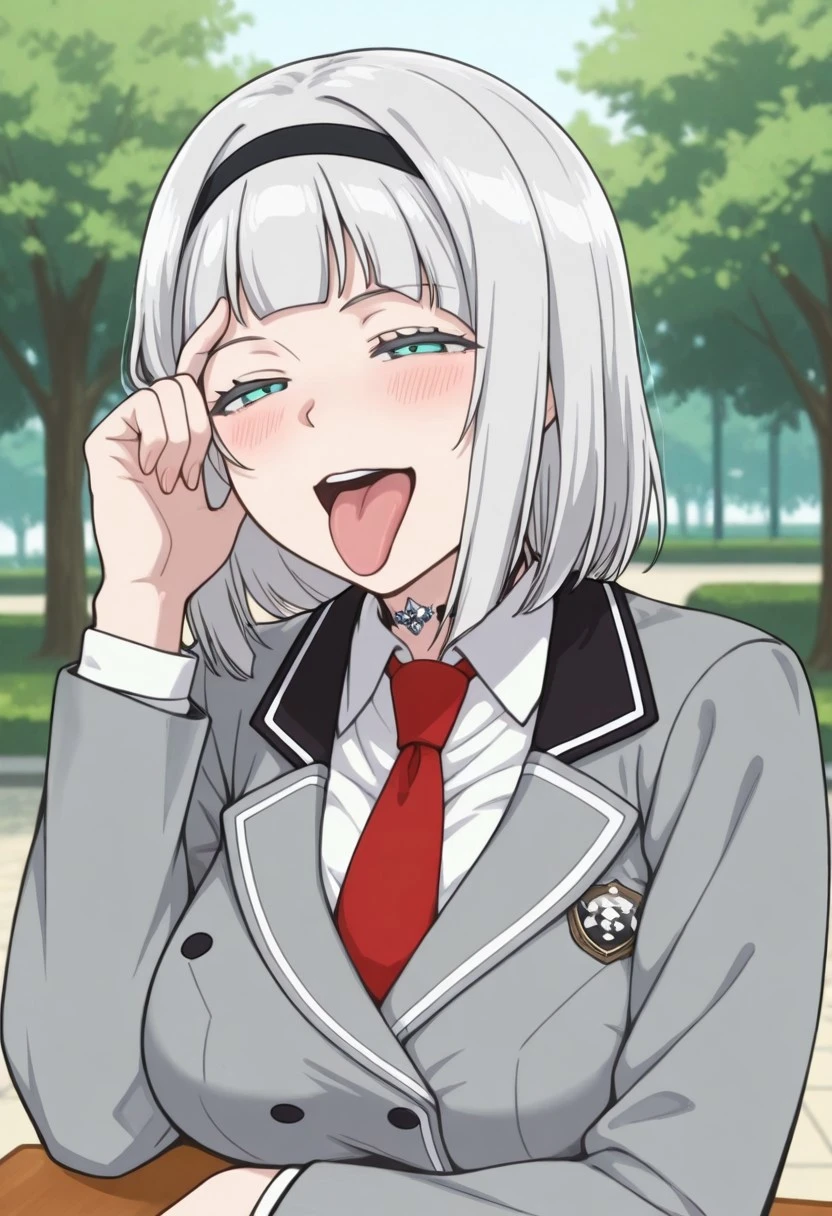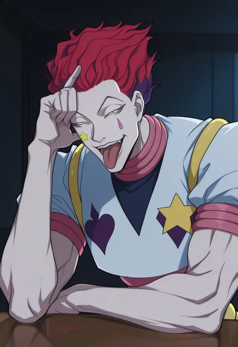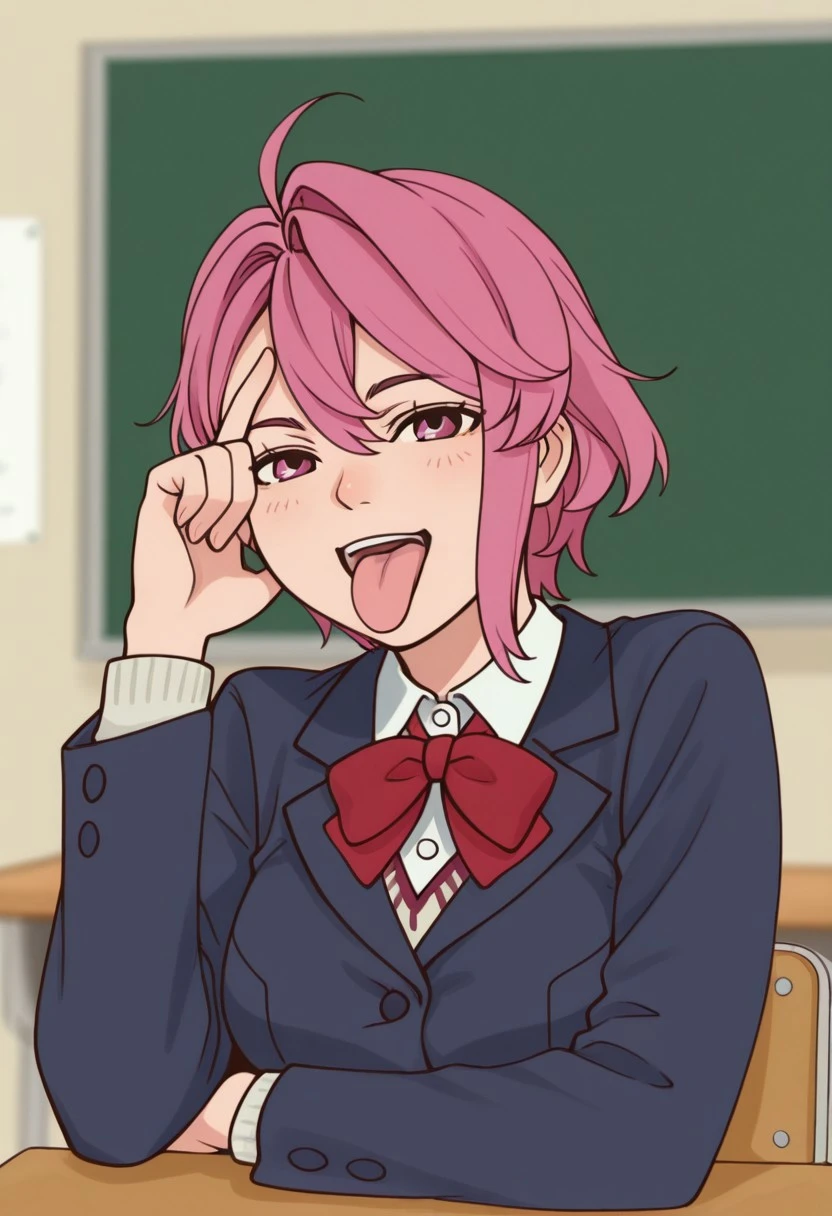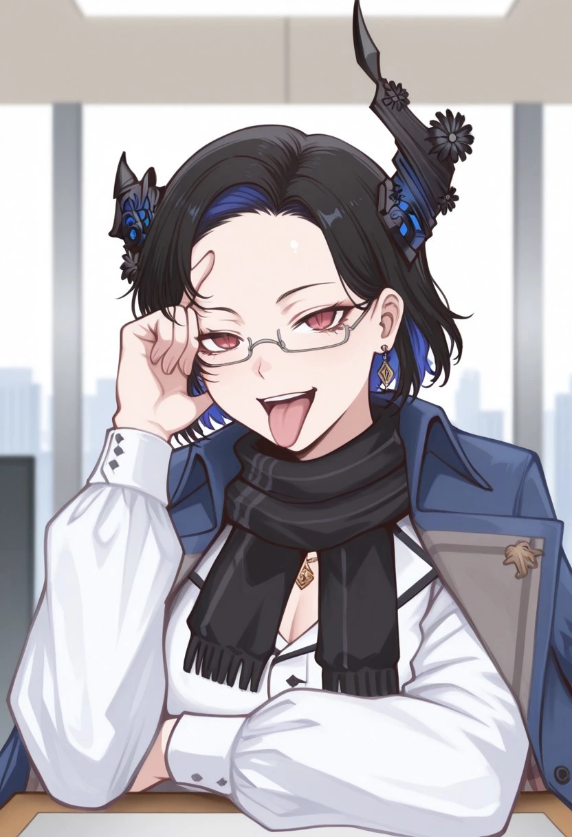 solo, 1girl, solo, blonde, long hair, orange eyes, t-shirt, aldn_frky_pose, hand on head, hand on table, table, tongue out, open mouth, smile, closed eyes, indoor, masterpiece, 4k resolutionㅤㅤ