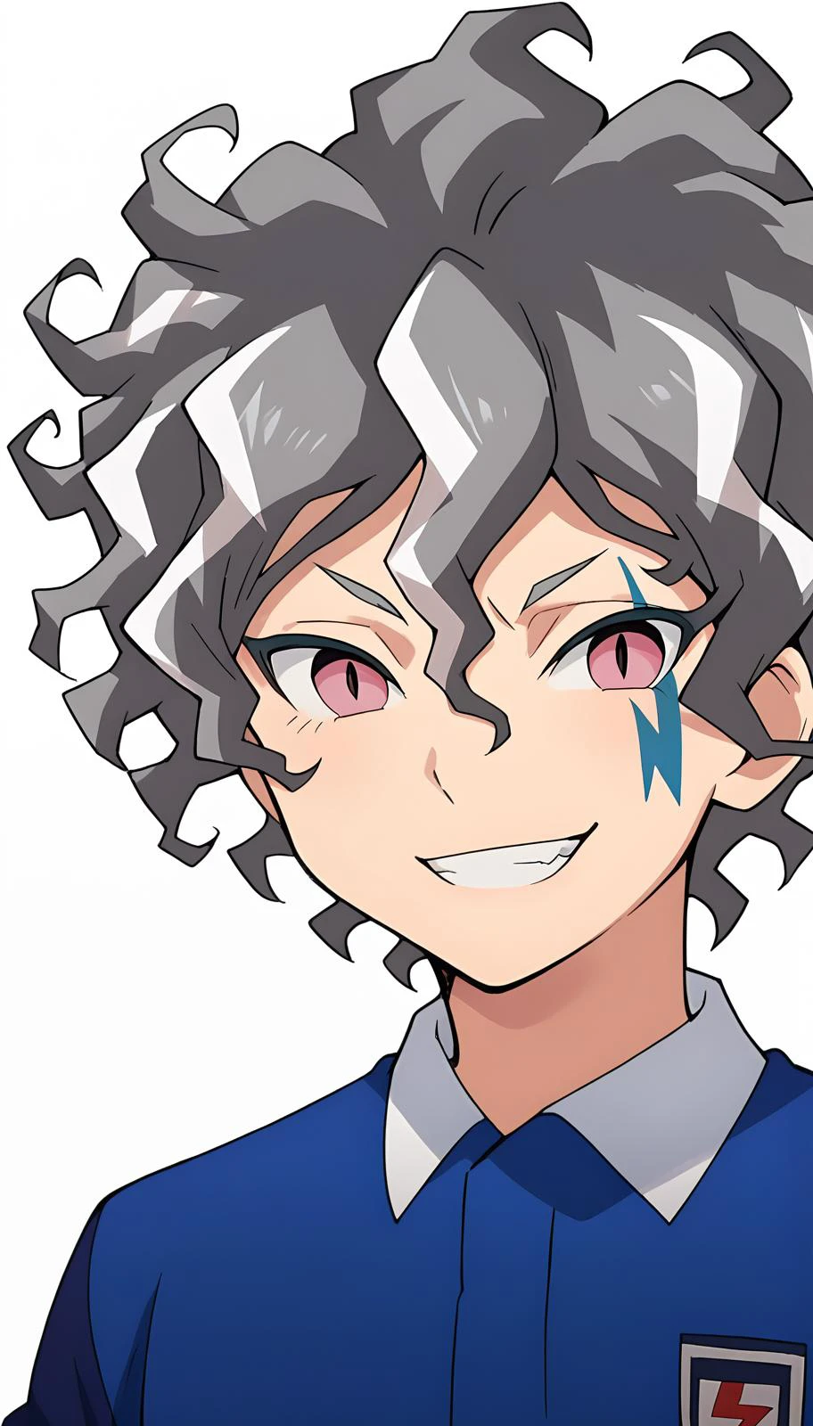 1boy, kira hiroto, multicolored hair, grey hair, pink eyes, facial tattoo