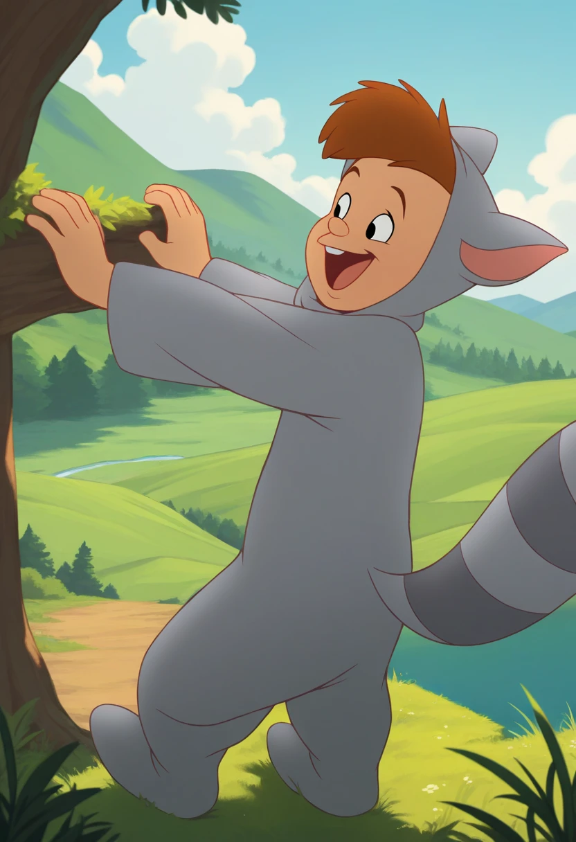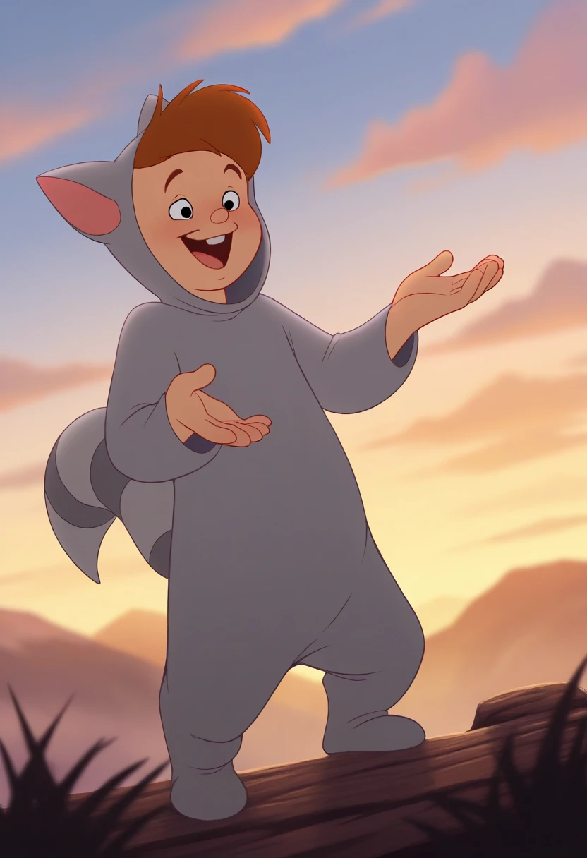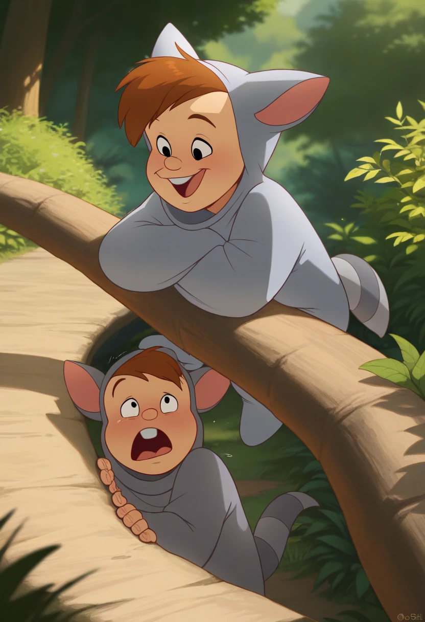 score_8, score_9 ,standing, male focus, <lora:Twins_PeterPan:1>,(Duo:1.3),pptwins, brown hair, male focus, black eyes, grey animal ears, grey animal costume, open mouth,grey tail, smile, buck teeth,young,