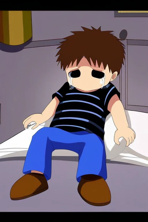 C.C_FNAF, 1boy, solo, crying, black eyes, 8-bit, brown hair, black shirt, striped shirt, blue shorts, brown shoes, no mouth, no nose,