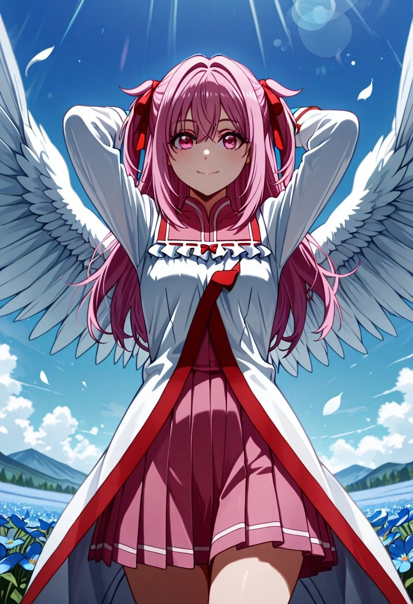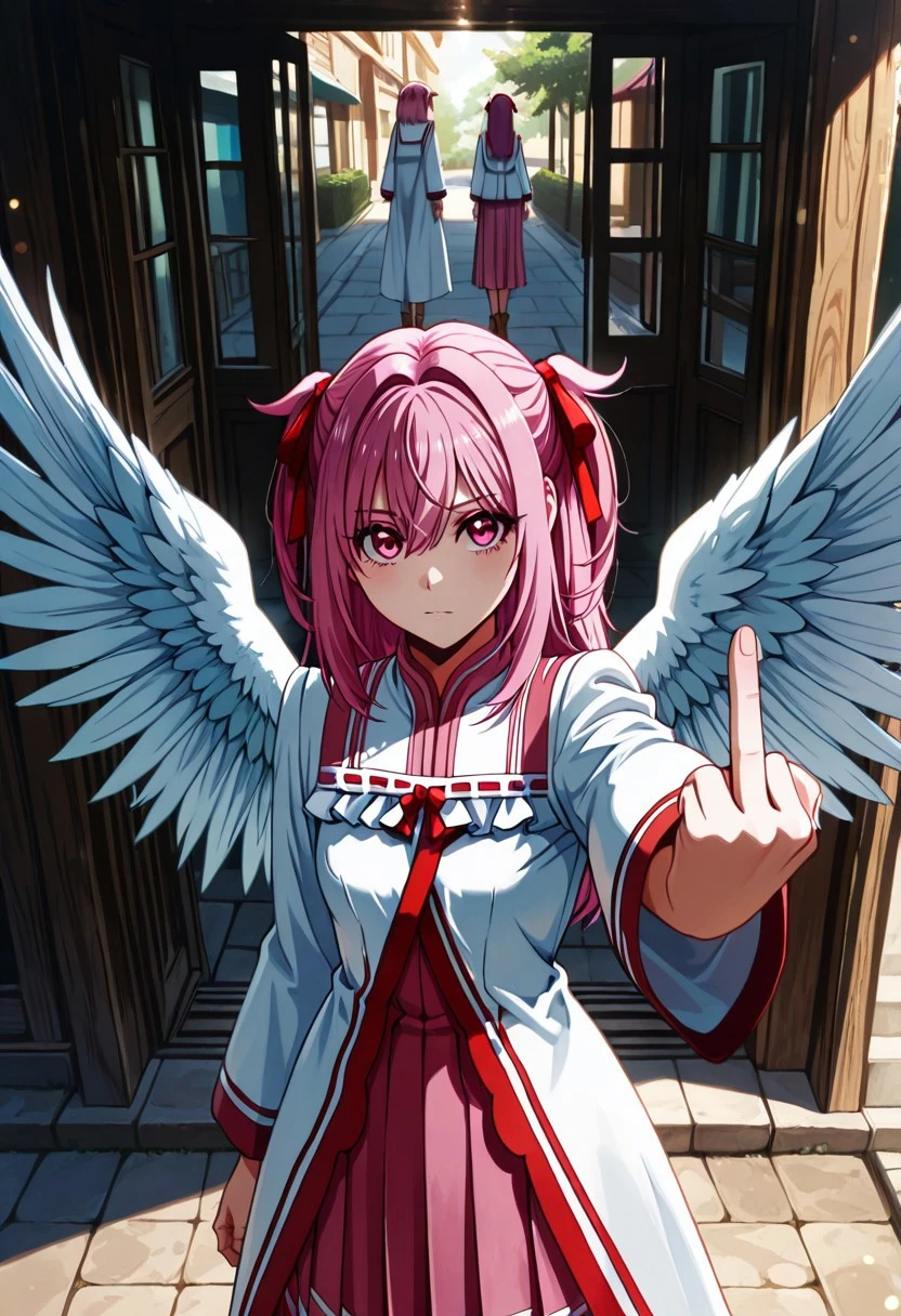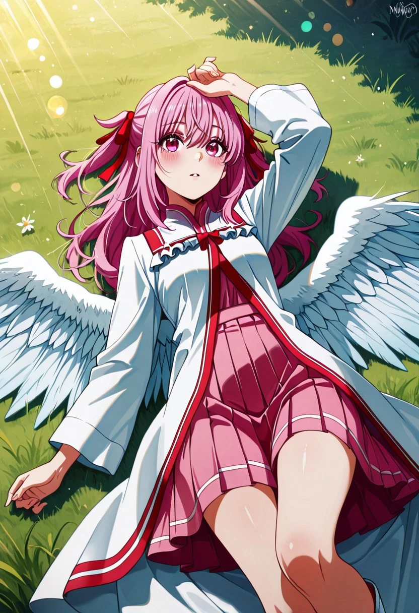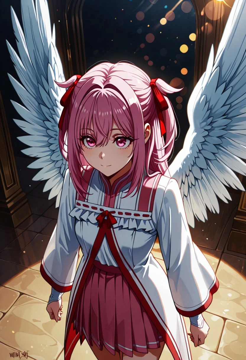 Character appearance: pink hair, long hair, bangs, side bangs, hair between eyes, two side-up bangs, hair ribbon, red ribbon, pink eyes, feather wings, white wings, angel wings, small breasts