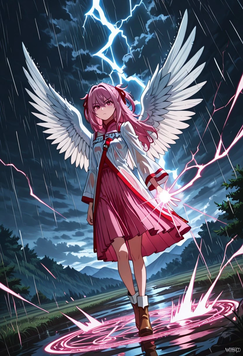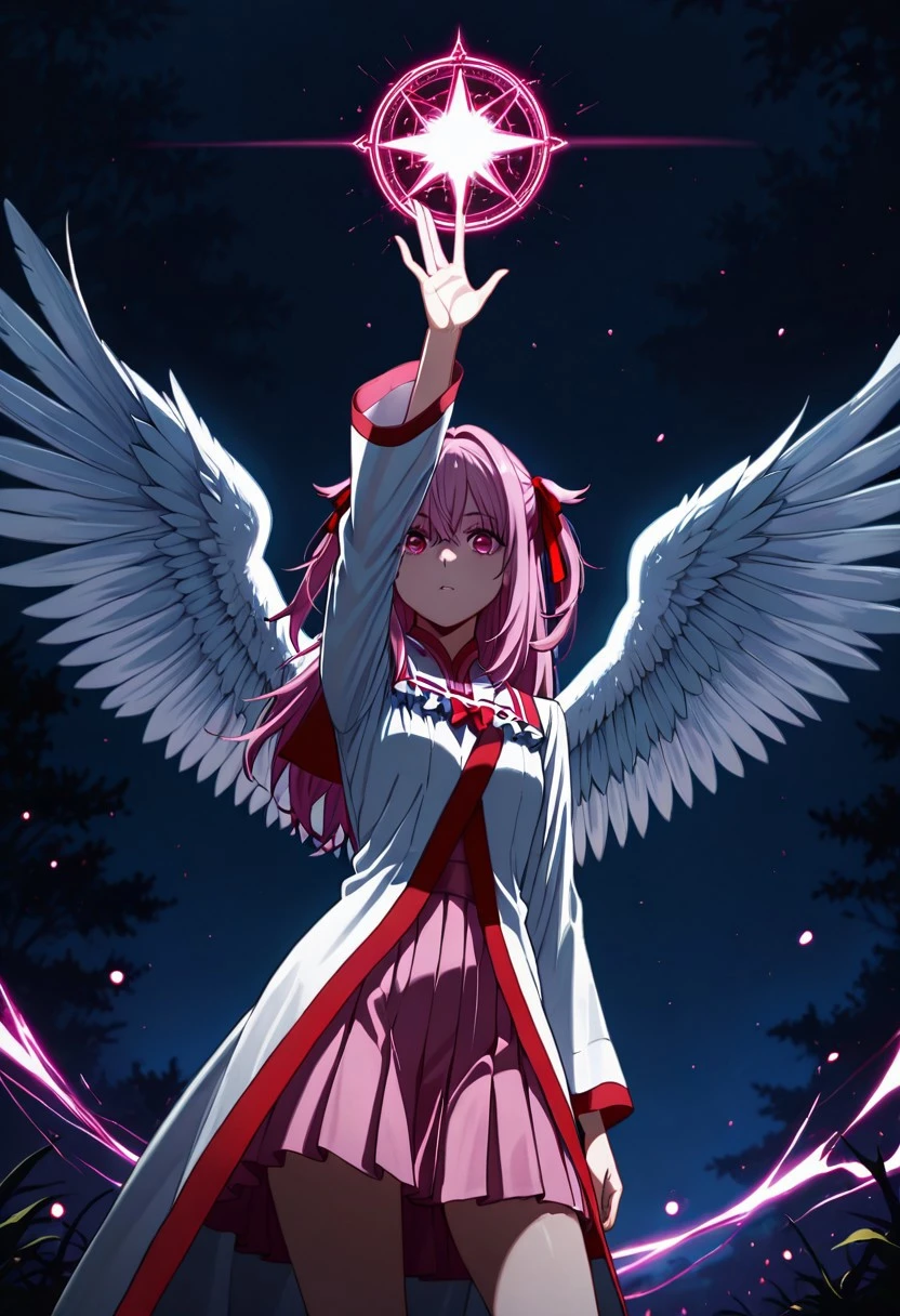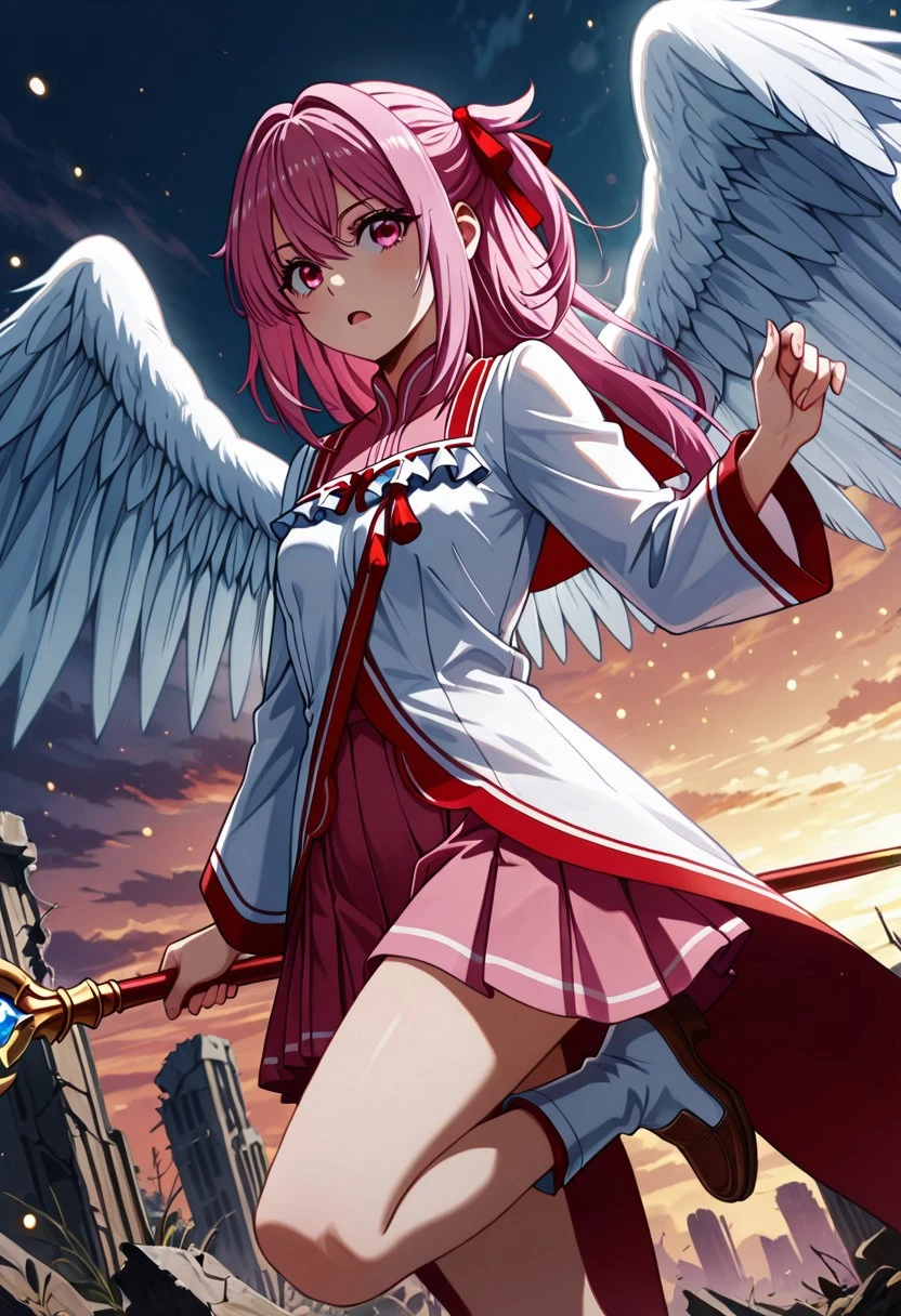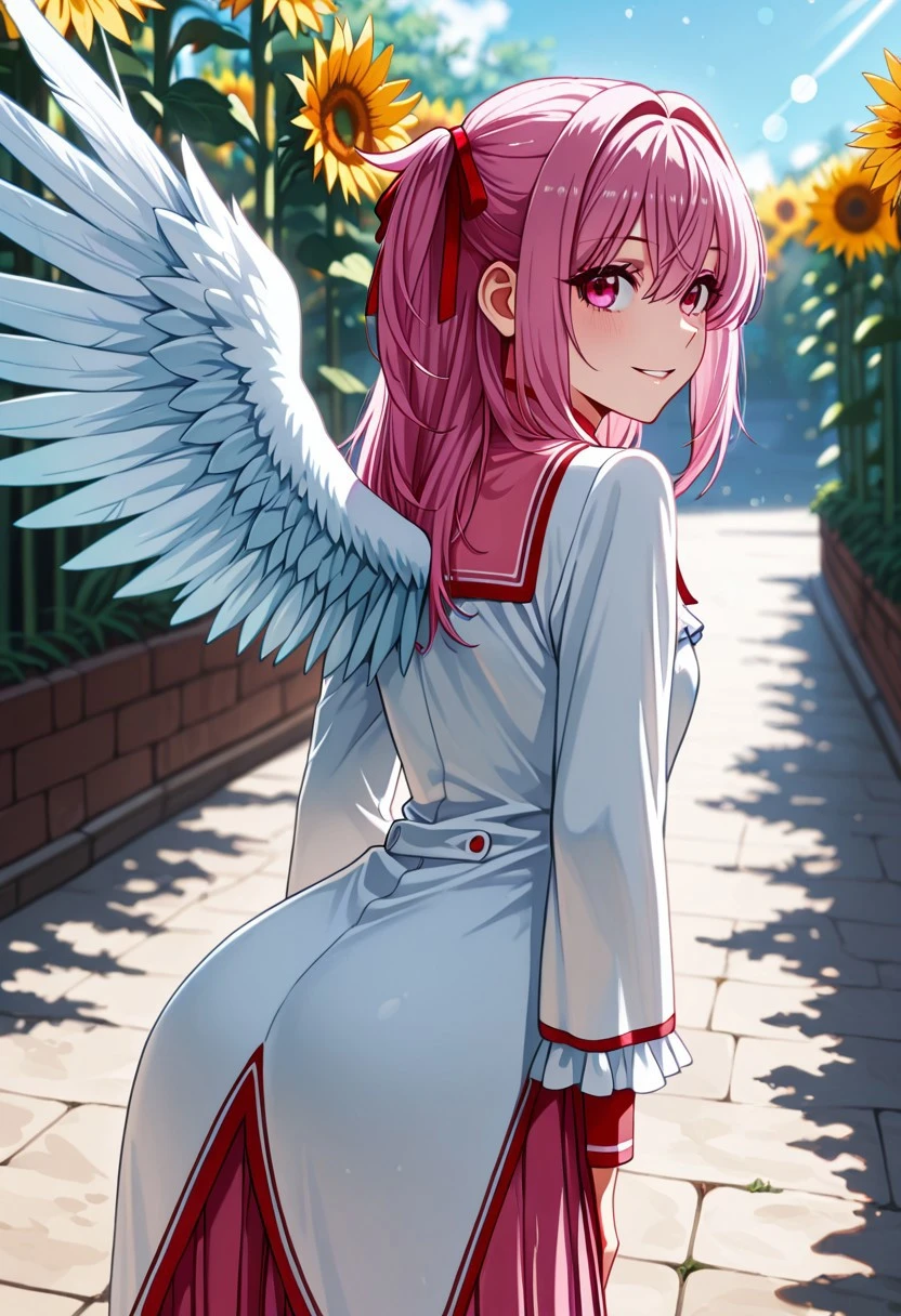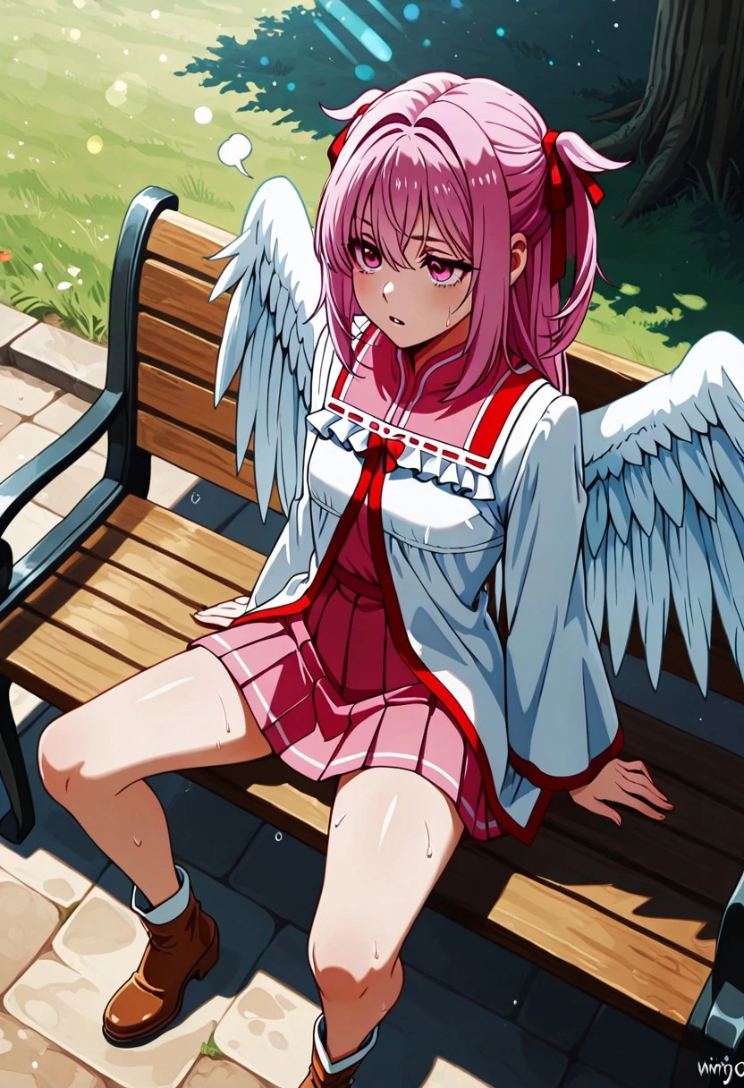 Character appearance: pink hair, long hair, bangs, side bangs, hair between eyes, two side-up bangs, hair ribbon, red ribbon, pink eyes, feather wings, white wings, angel wings, small breasts