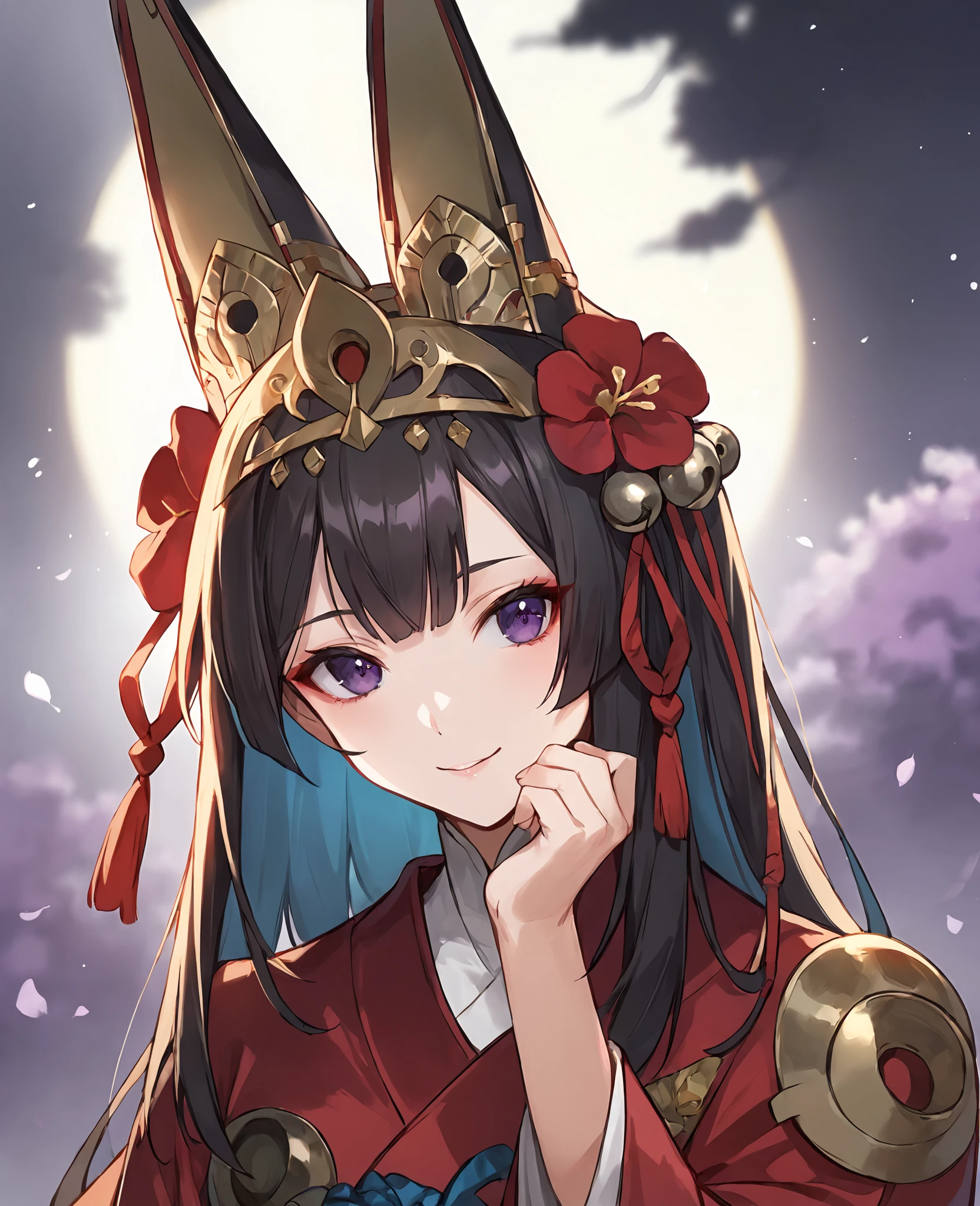 Default costume : Japanese clothes ( red dress ) , clothing cutout , wide / long sleeves , purple skirt / hakama ,hair ornament / headgear , hair flower , tassel , ribbon , knots , gold trim , ( sash ) , ( white ) ( thighhighs ) , ( armored boots ) ;