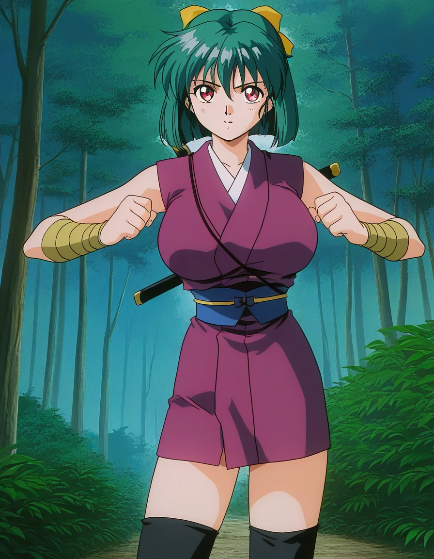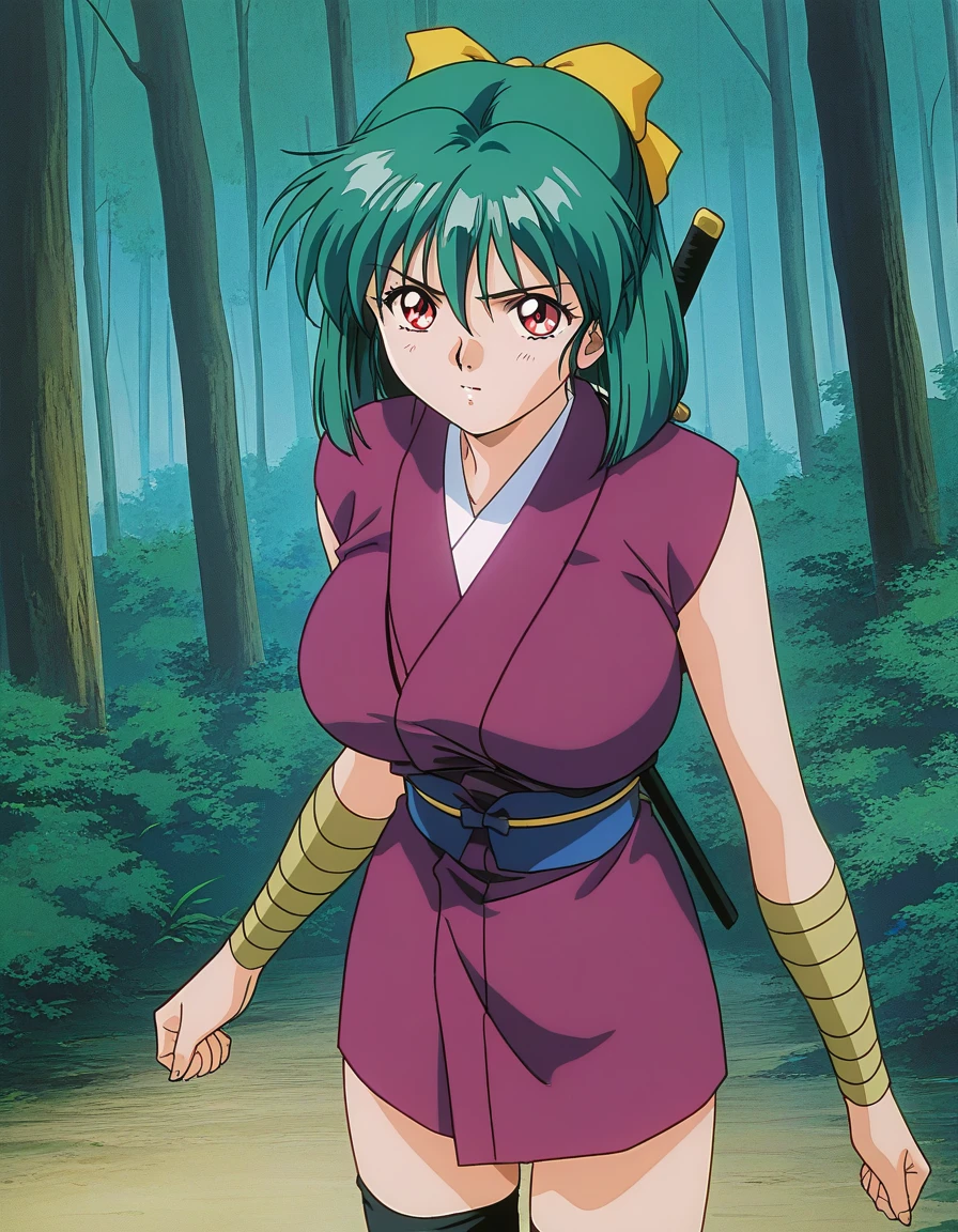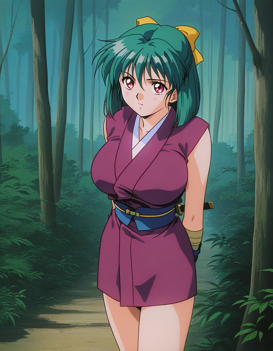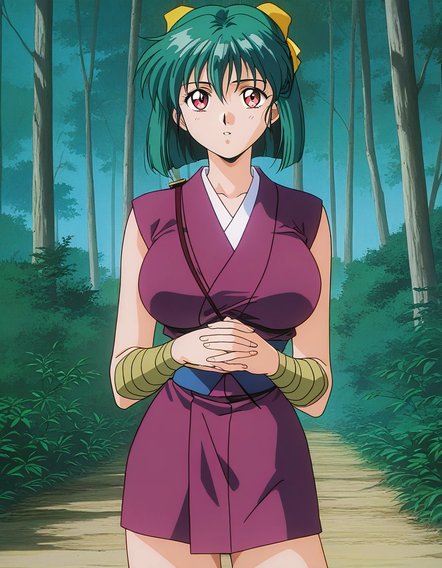 Yaku, 1girl, green hair, short hair, red eyes, large breasts, hair ribbon, Yellow bow, 1990s \(style\),anime coloring,