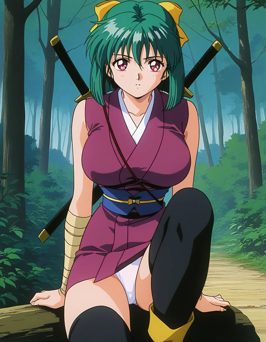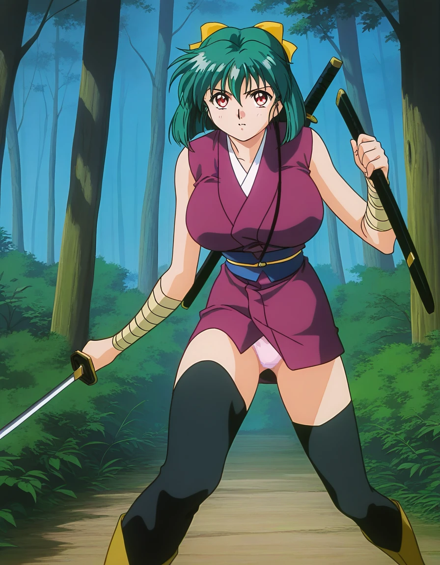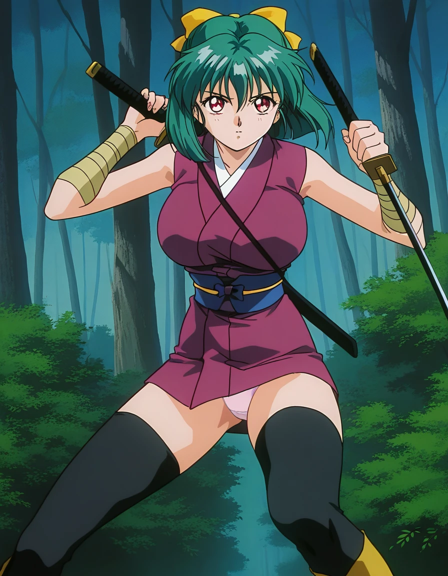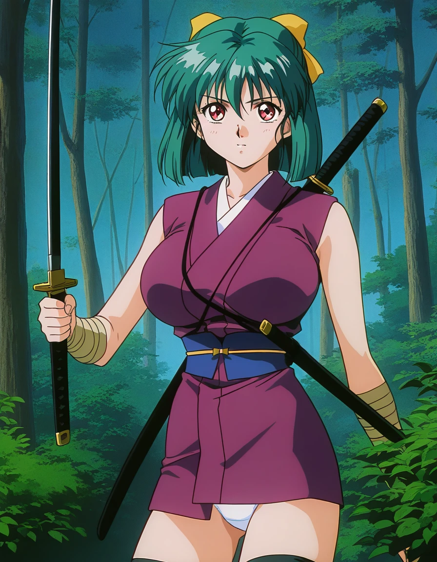 Yaku, 1girl, green hair, short hair, red eyes, large breasts, hair ribbon, Yellow bow, 1990s \(style\),anime coloring,