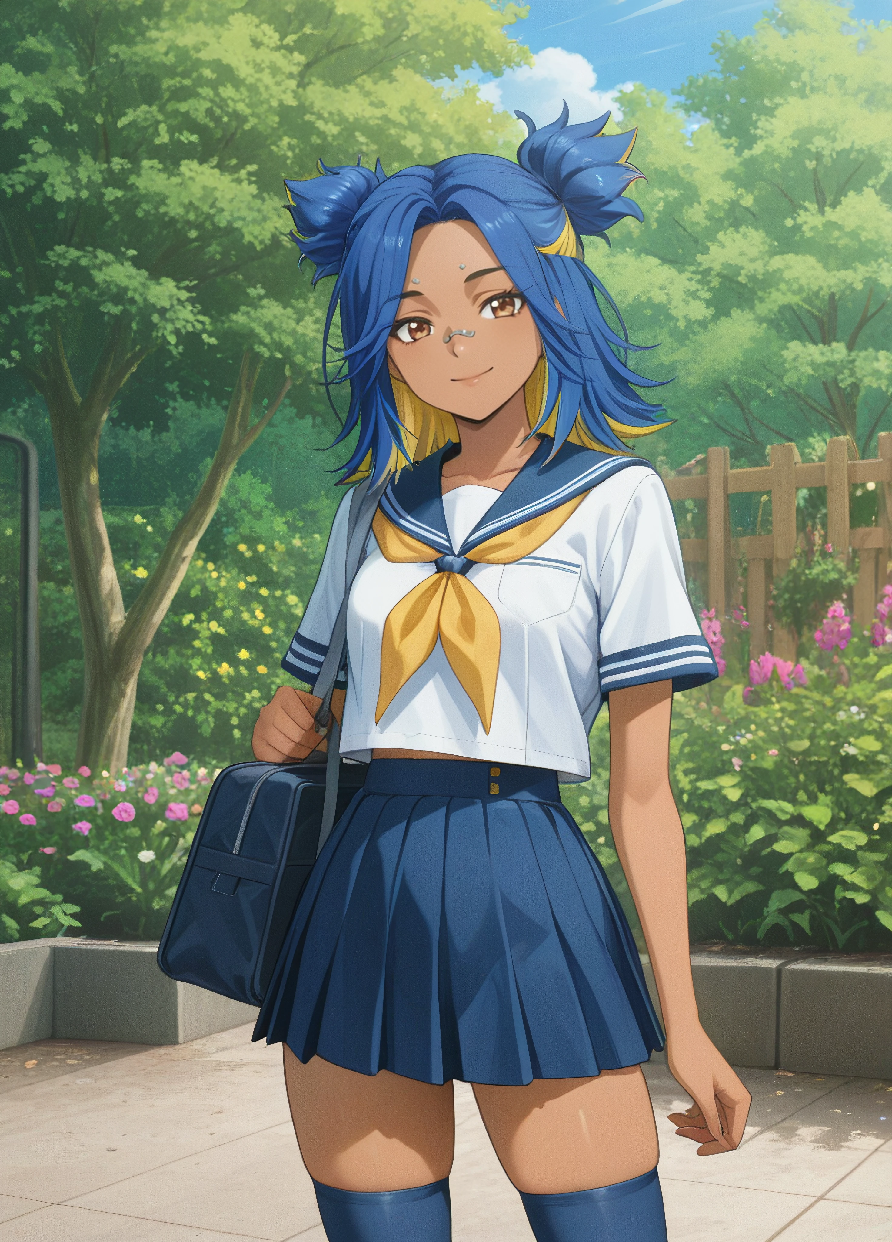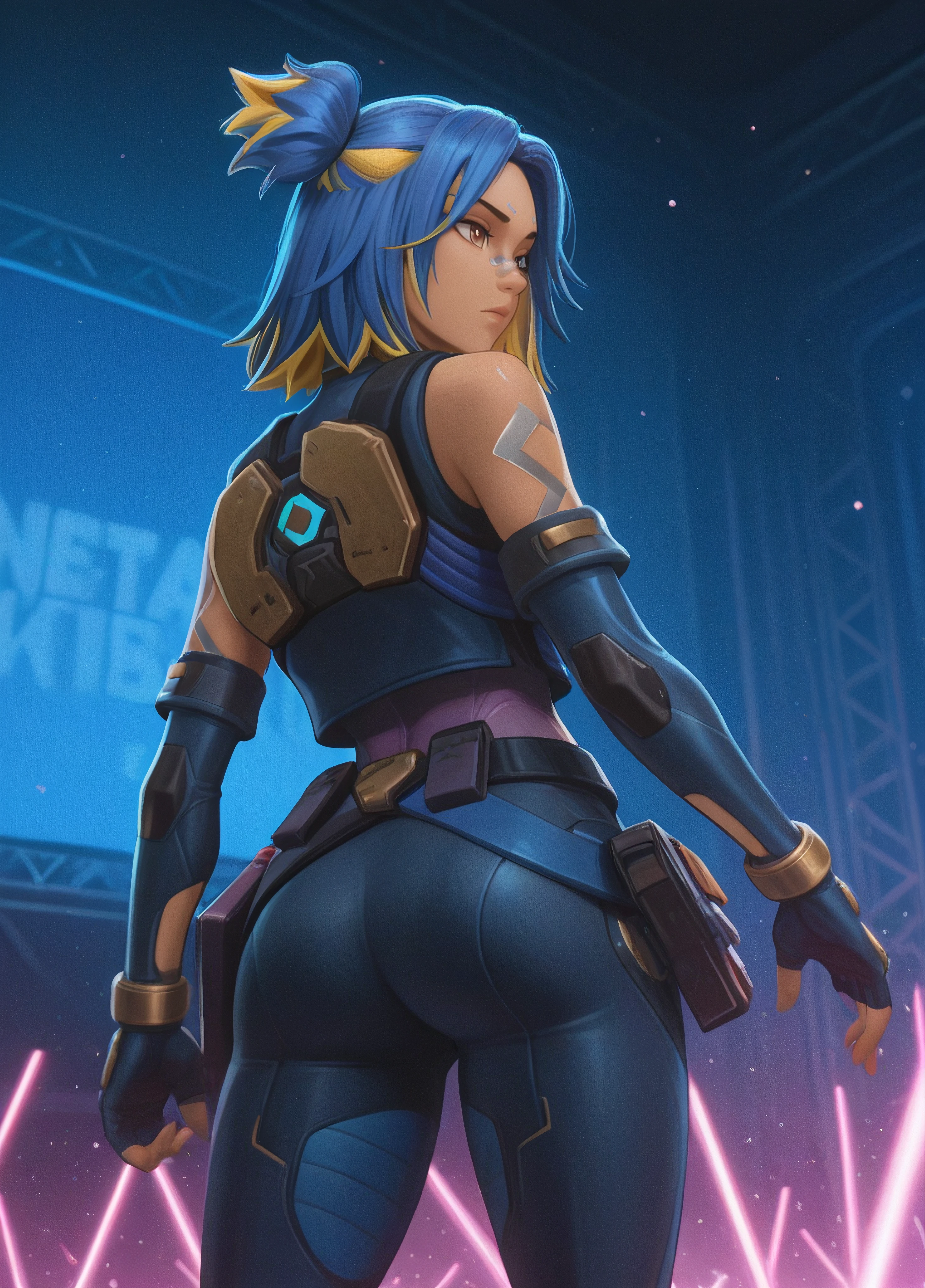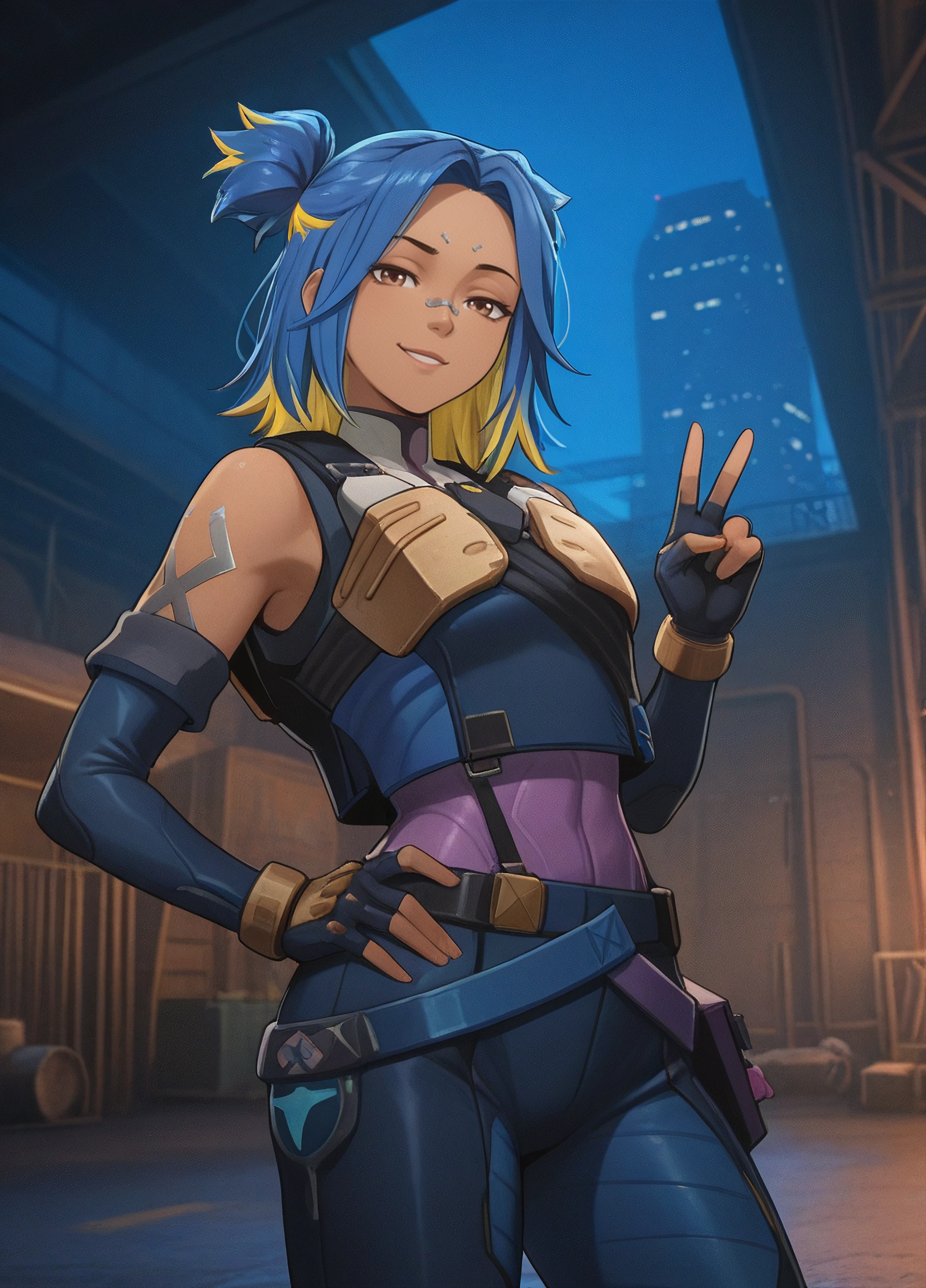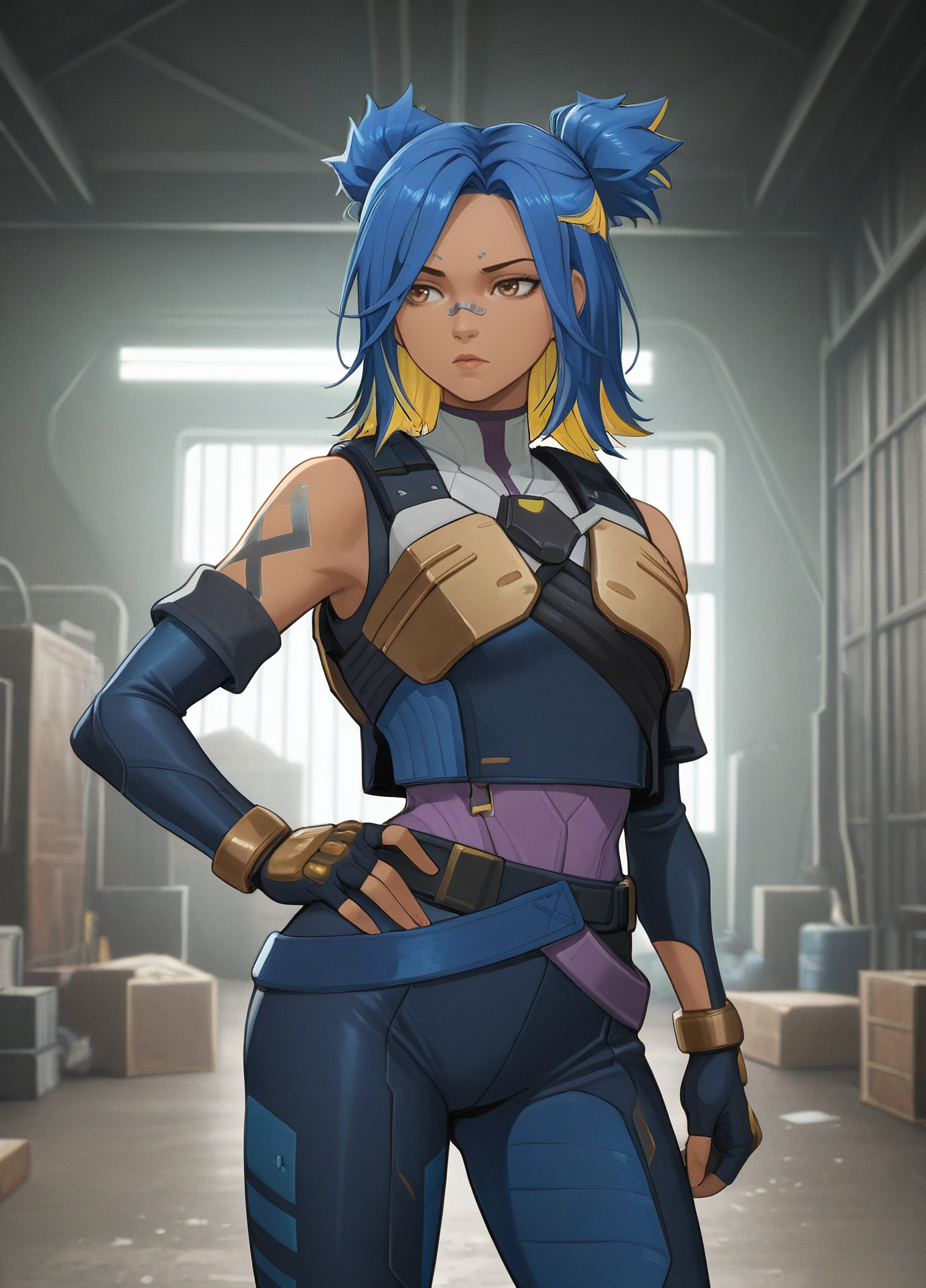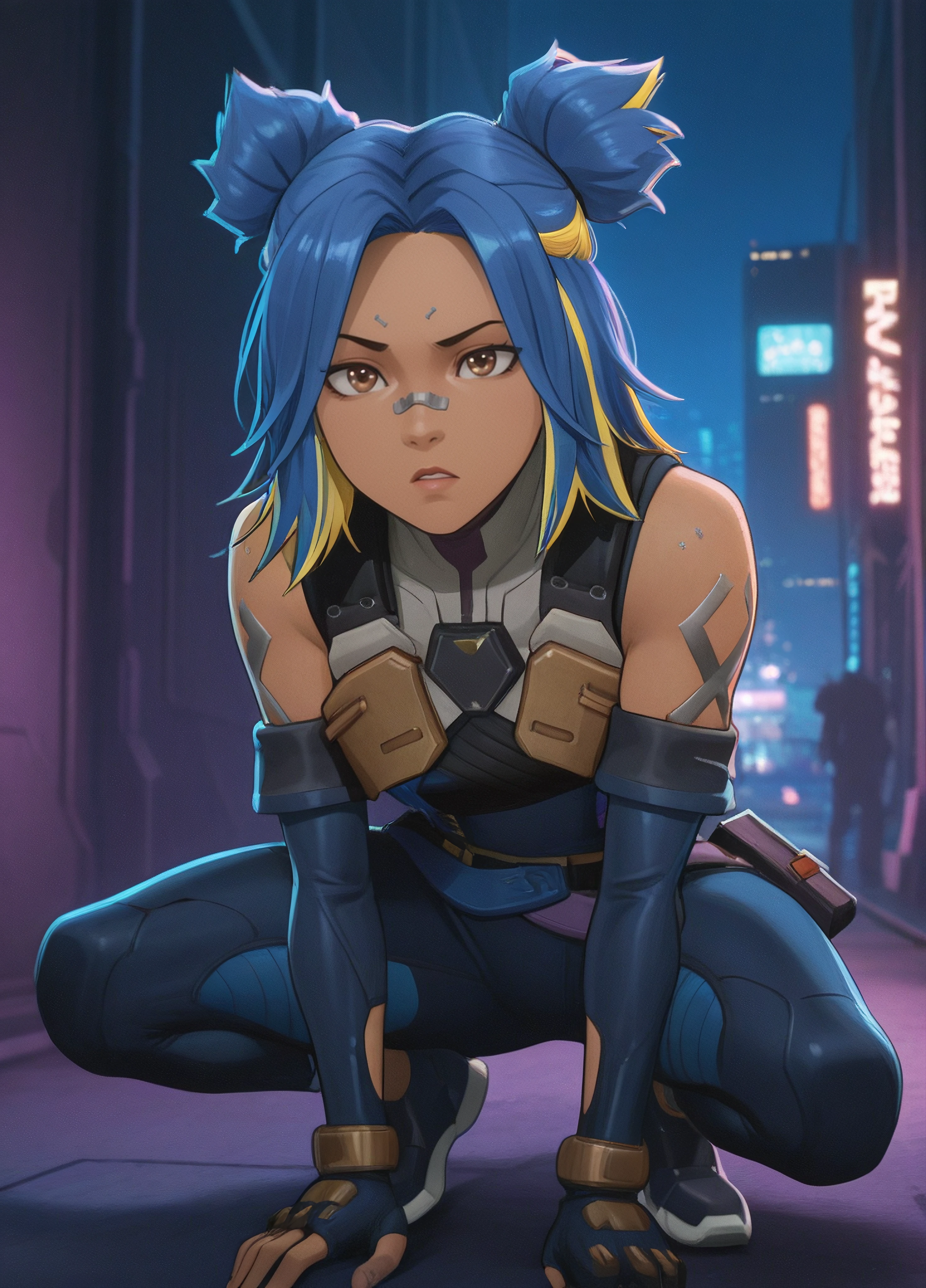 Neon, brown eyes, olive skin, metal bandaid on nose, blue hair, yellow hairstripes, multicolored hair, streaked hair,