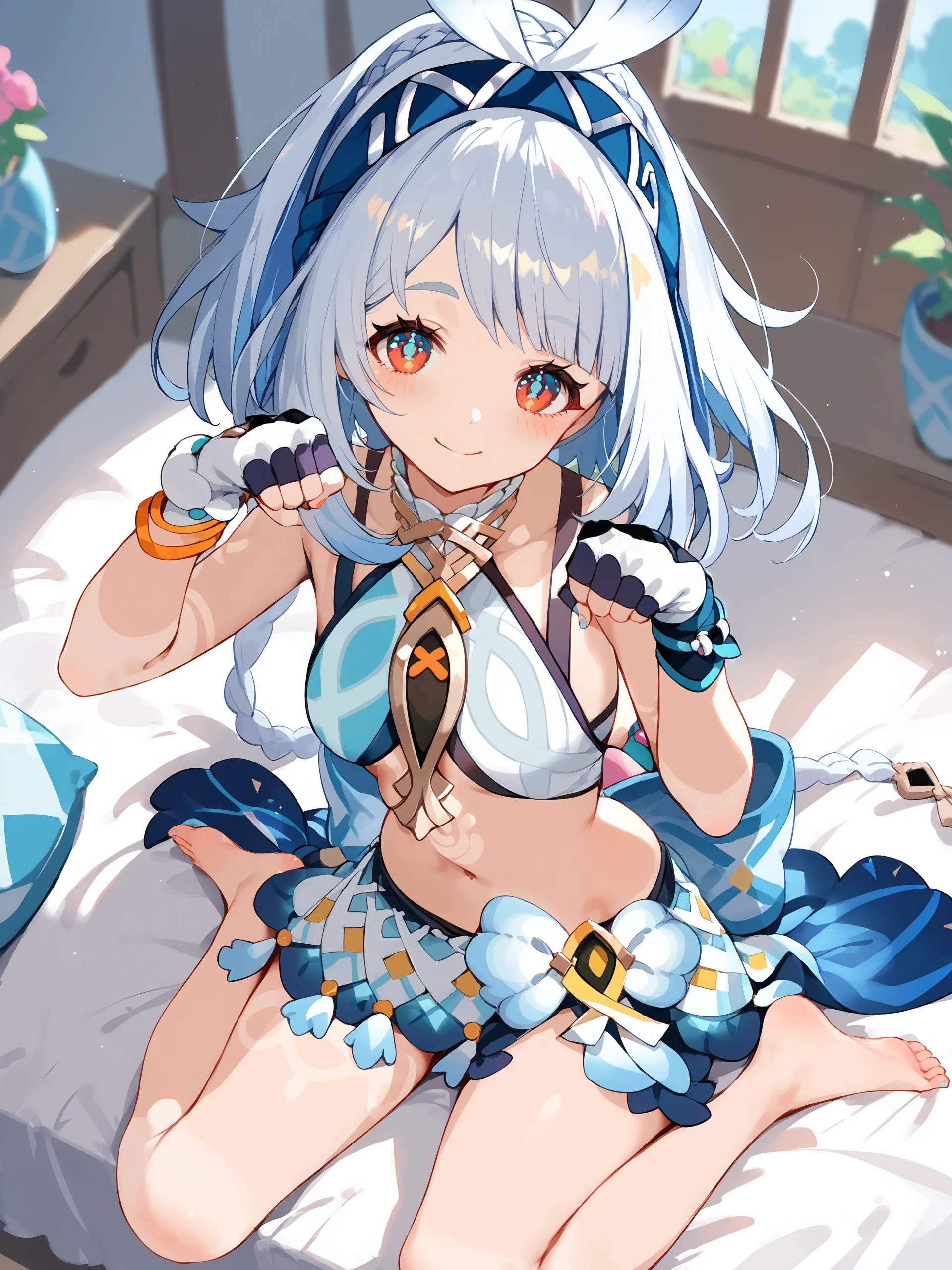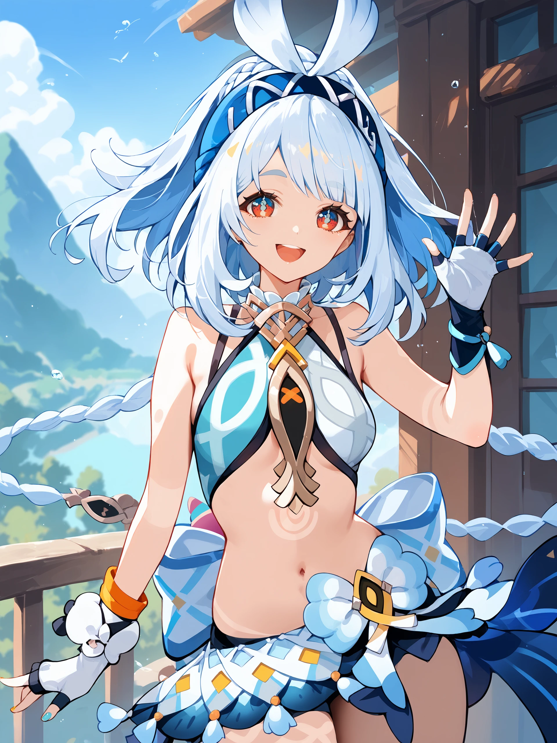 Additional prompts for her default costume, add/remove as you needed: bodypaint, bow hairband, fingerless gloves, nail polish, crop top, sandals, sarong, stirrup legwear, waist bow