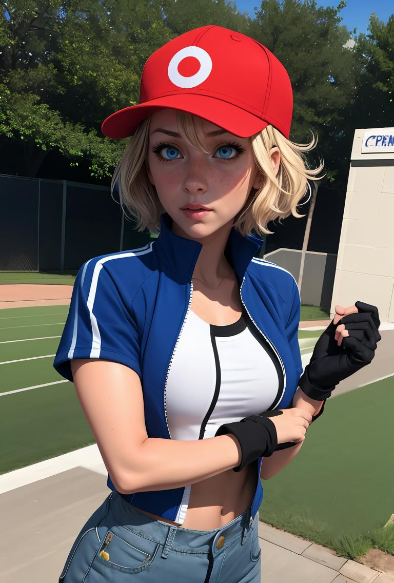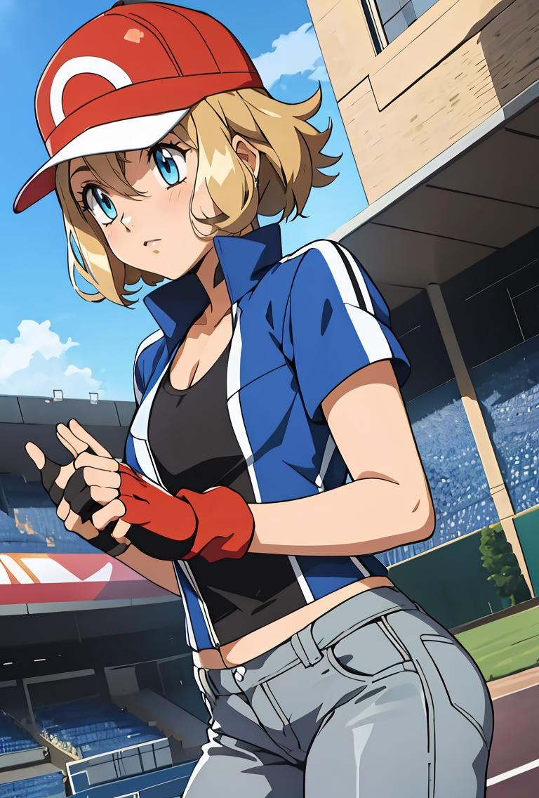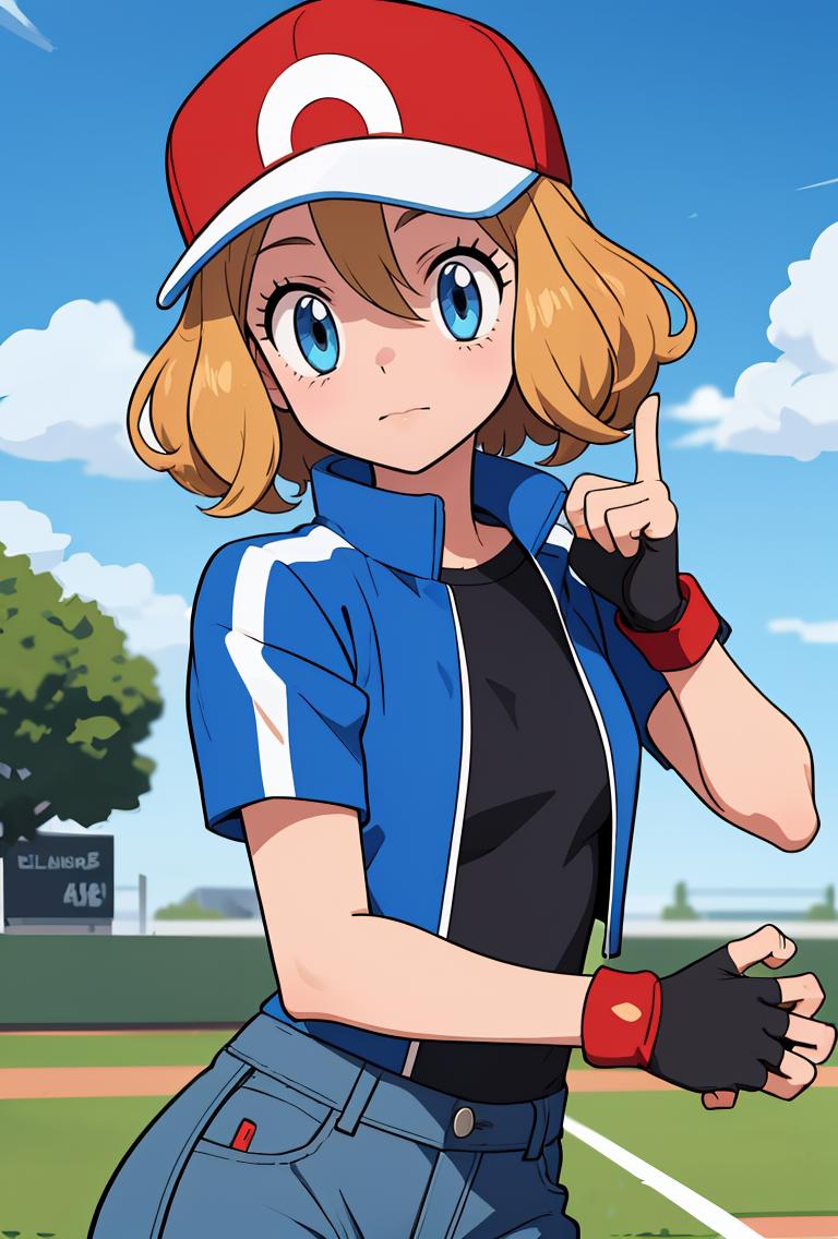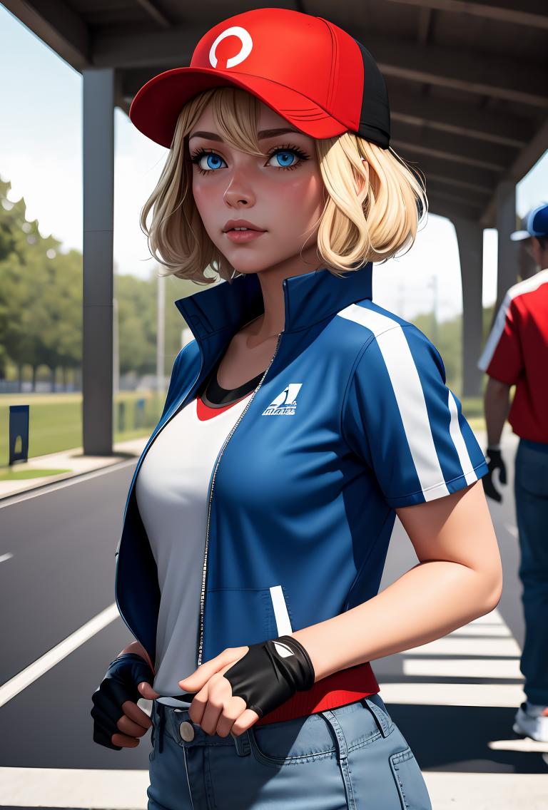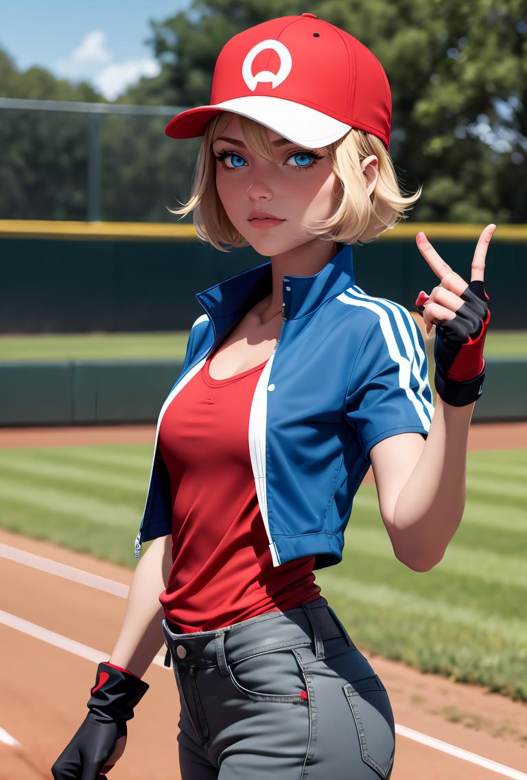 pkmnserena, 1girl, solo, blue eyes, blonde hair, short hair, bangs, hair between eyes, baseball cap, red headwear,