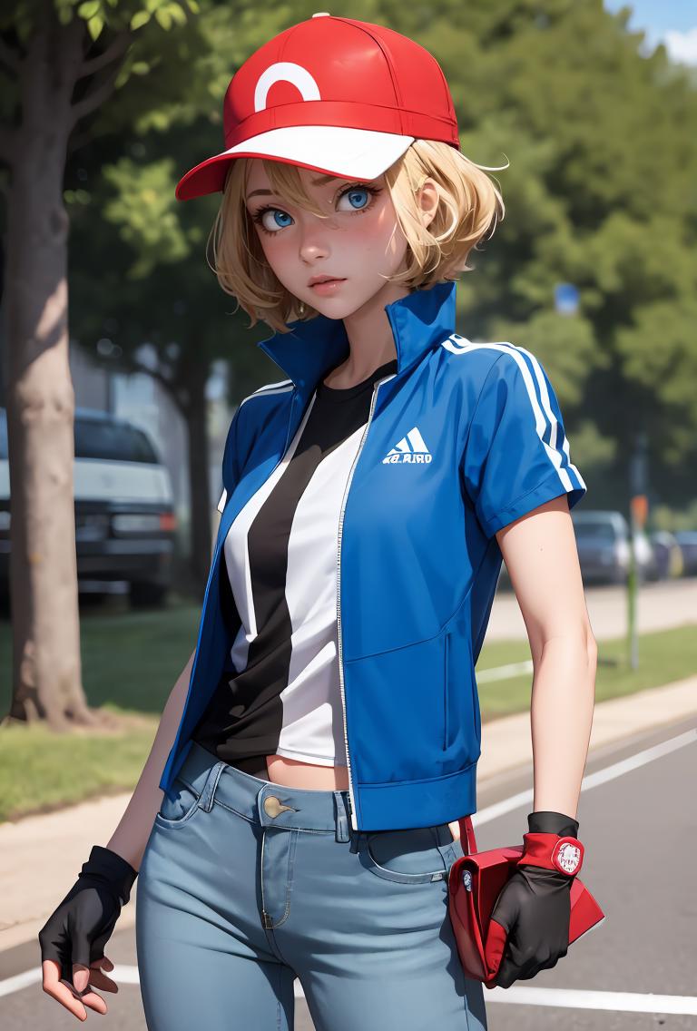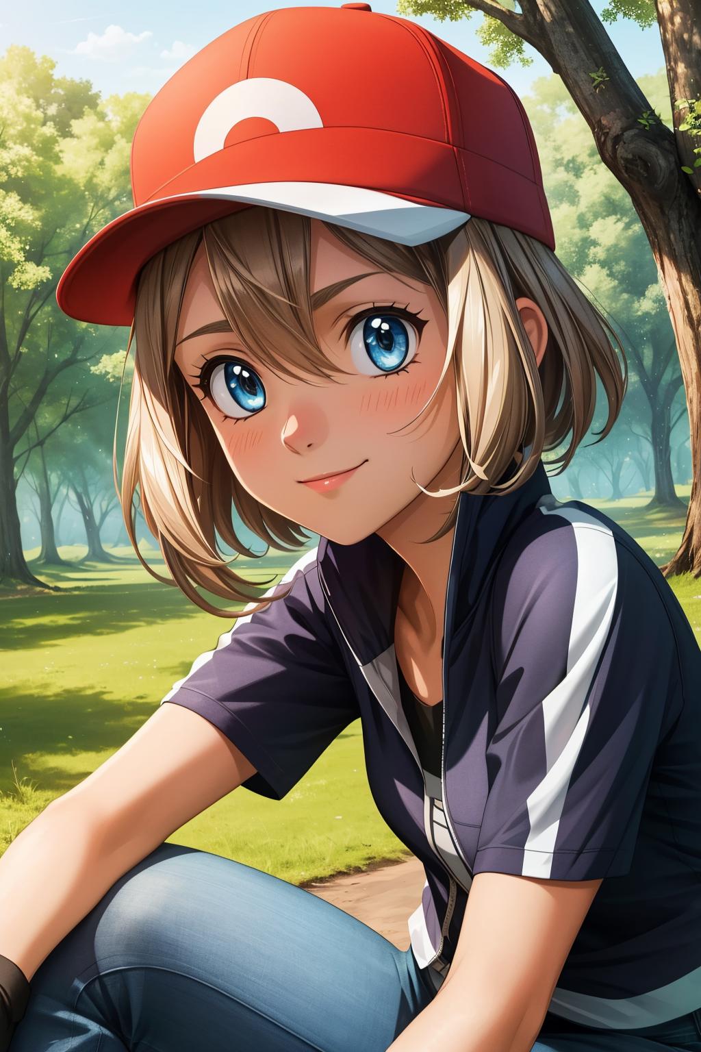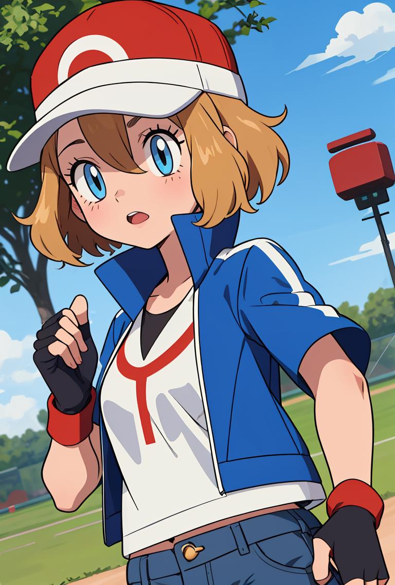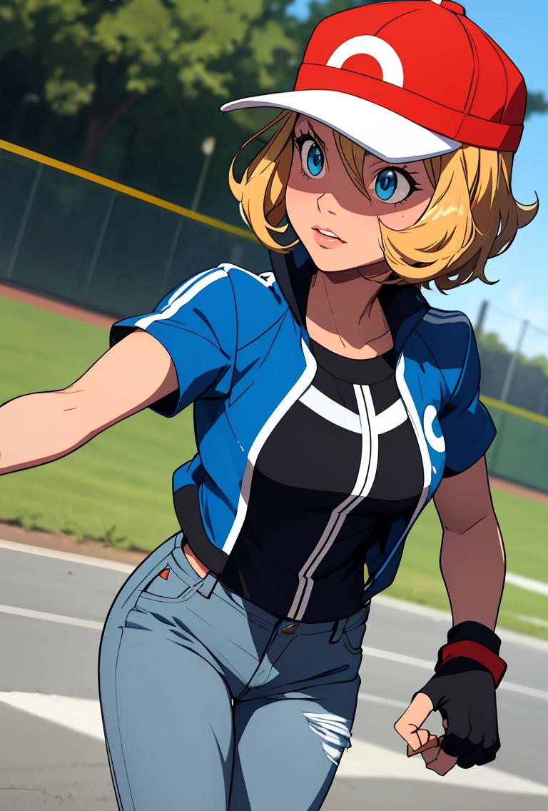 pkmnserena, 1girl, solo, blue eyes, blonde hair, short hair, bangs, hair between eyes, baseball cap, red headwear,