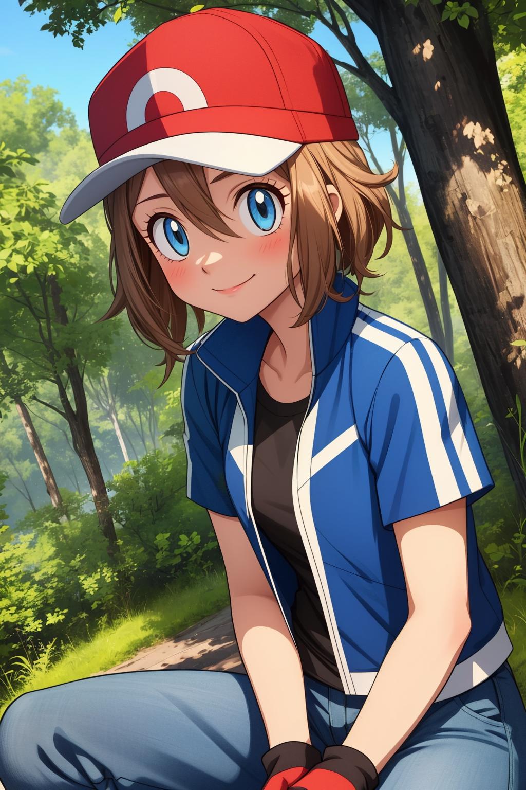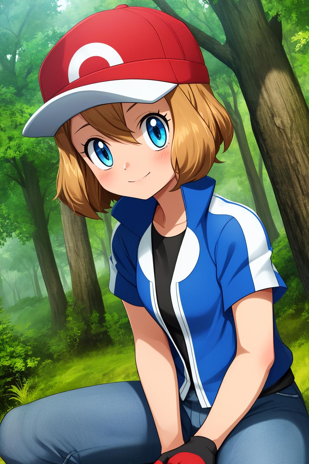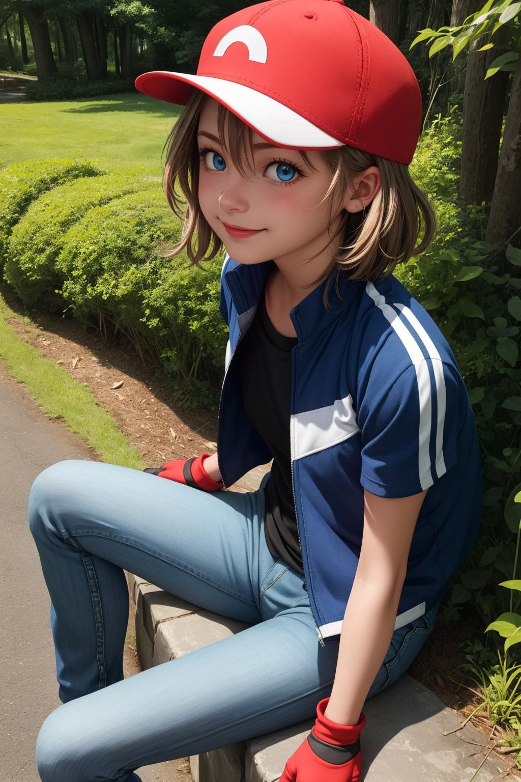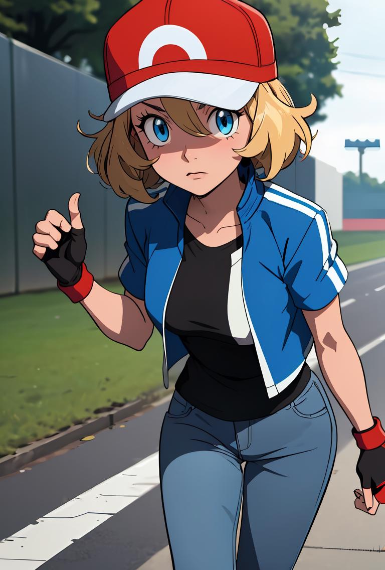 pkmnserena, 1girl, solo, blue eyes, blonde hair, short hair, bangs, hair between eyes, baseball cap, red headwear,