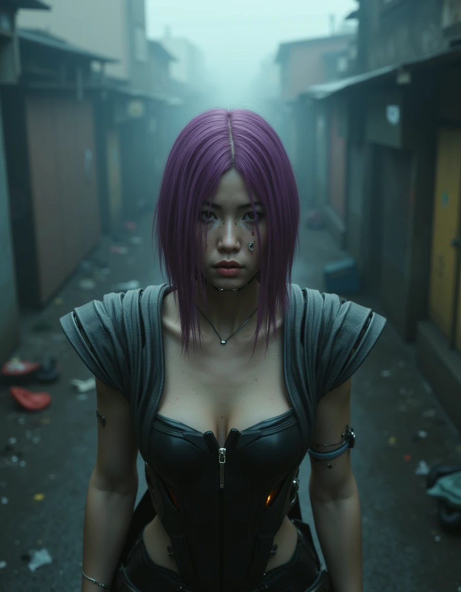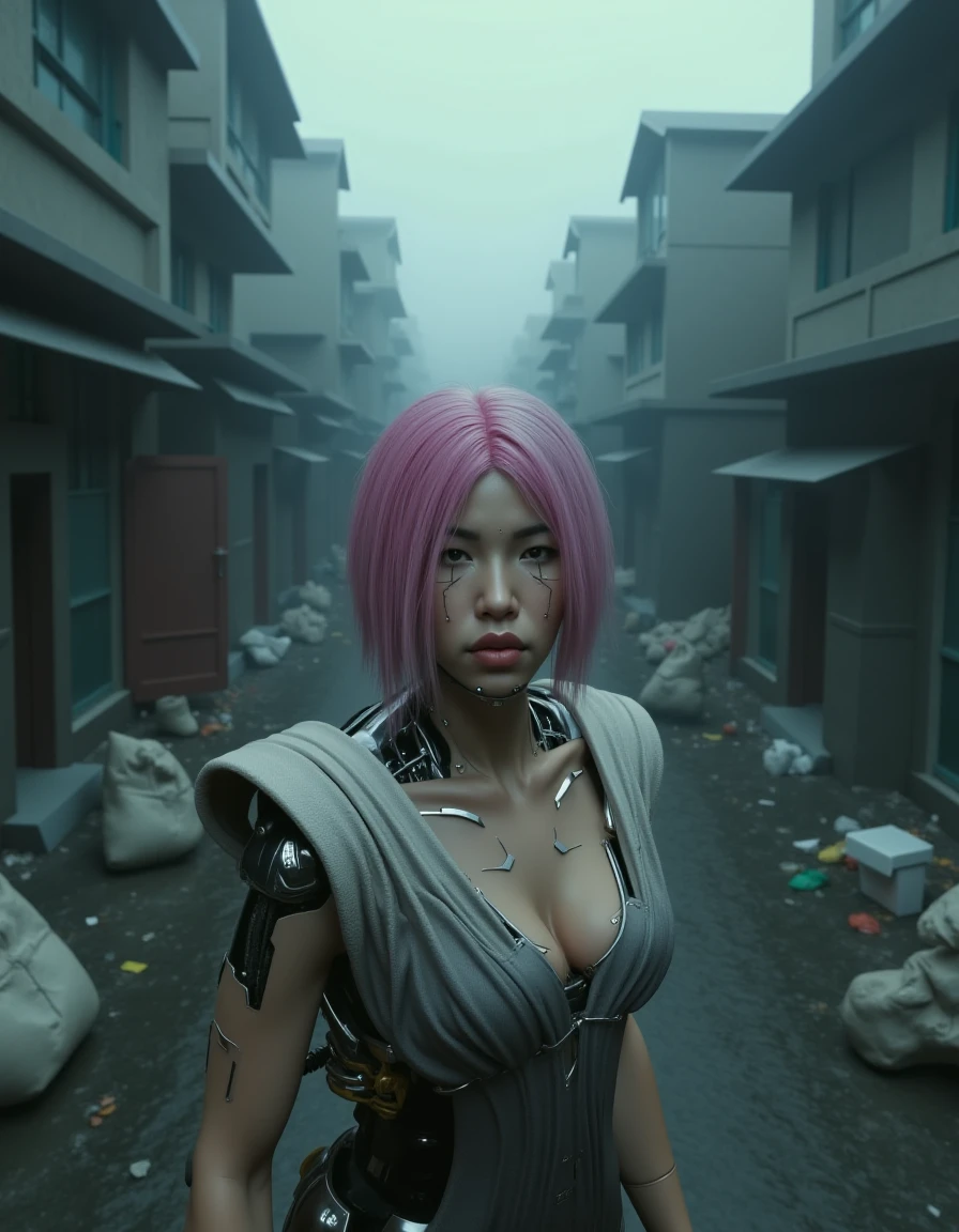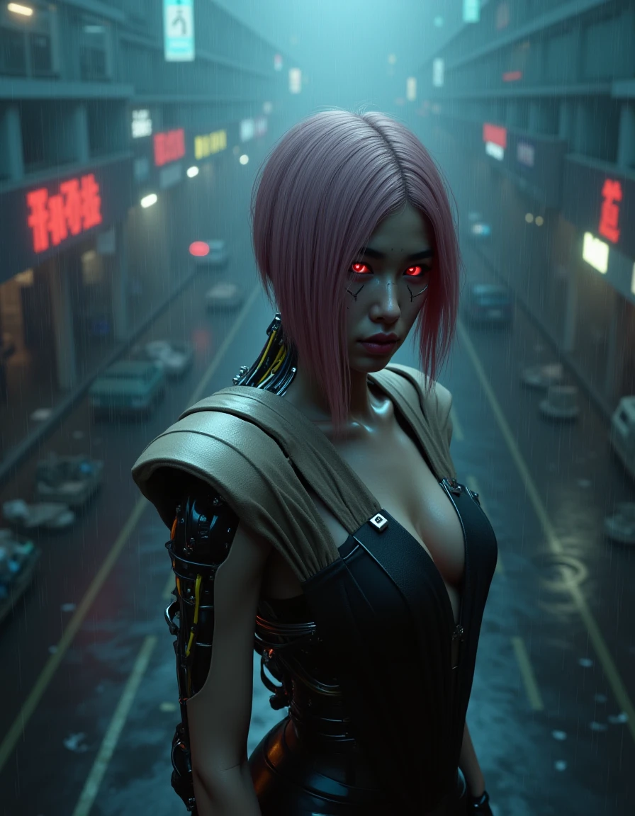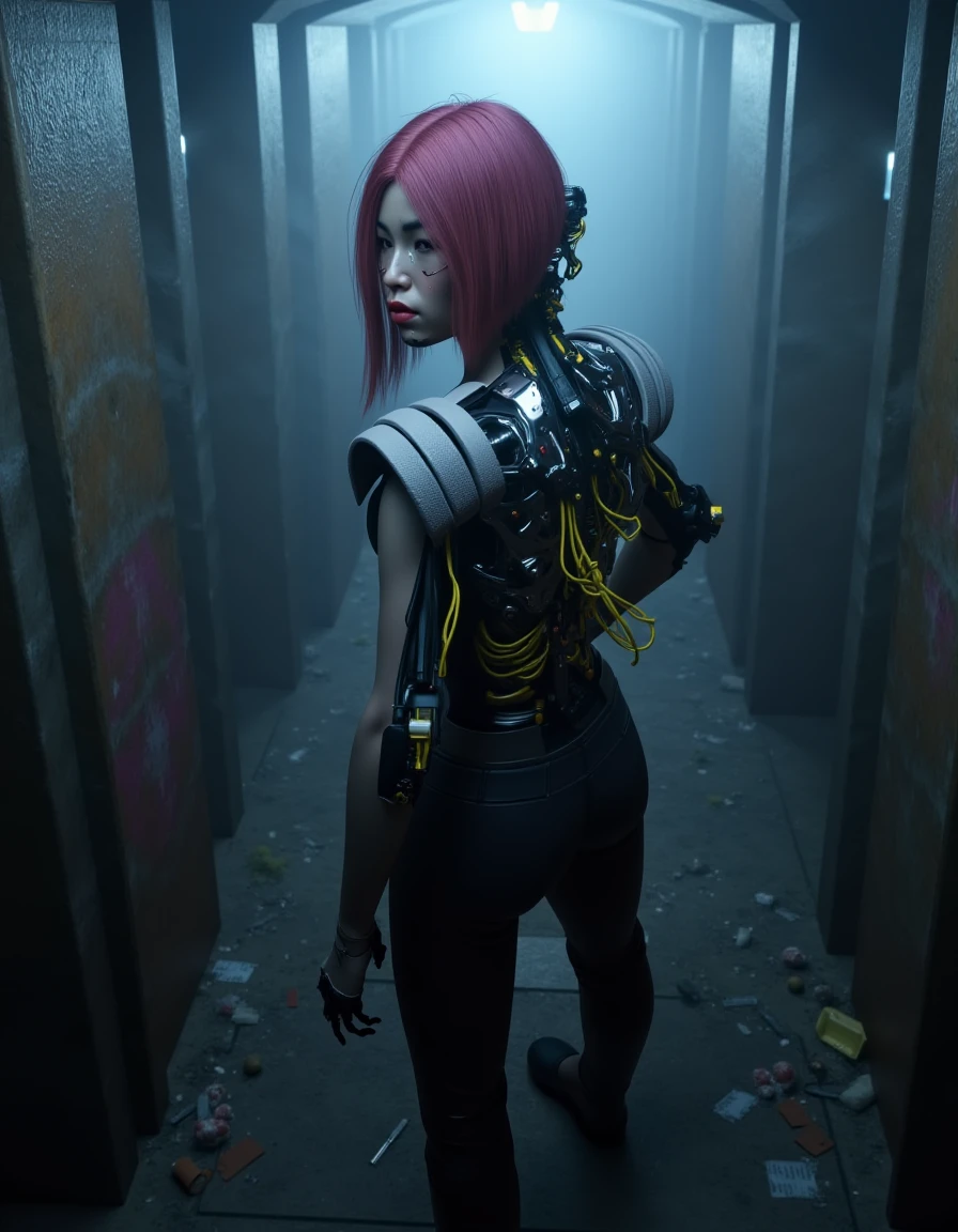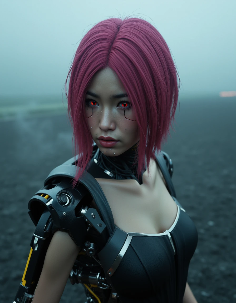 magenta hair, song so mi, songbird, cyberware, cybernetic, korean woman, cyborg, short hair, realistic, mechanical parts, lips, android, mechanical arms, robot joints