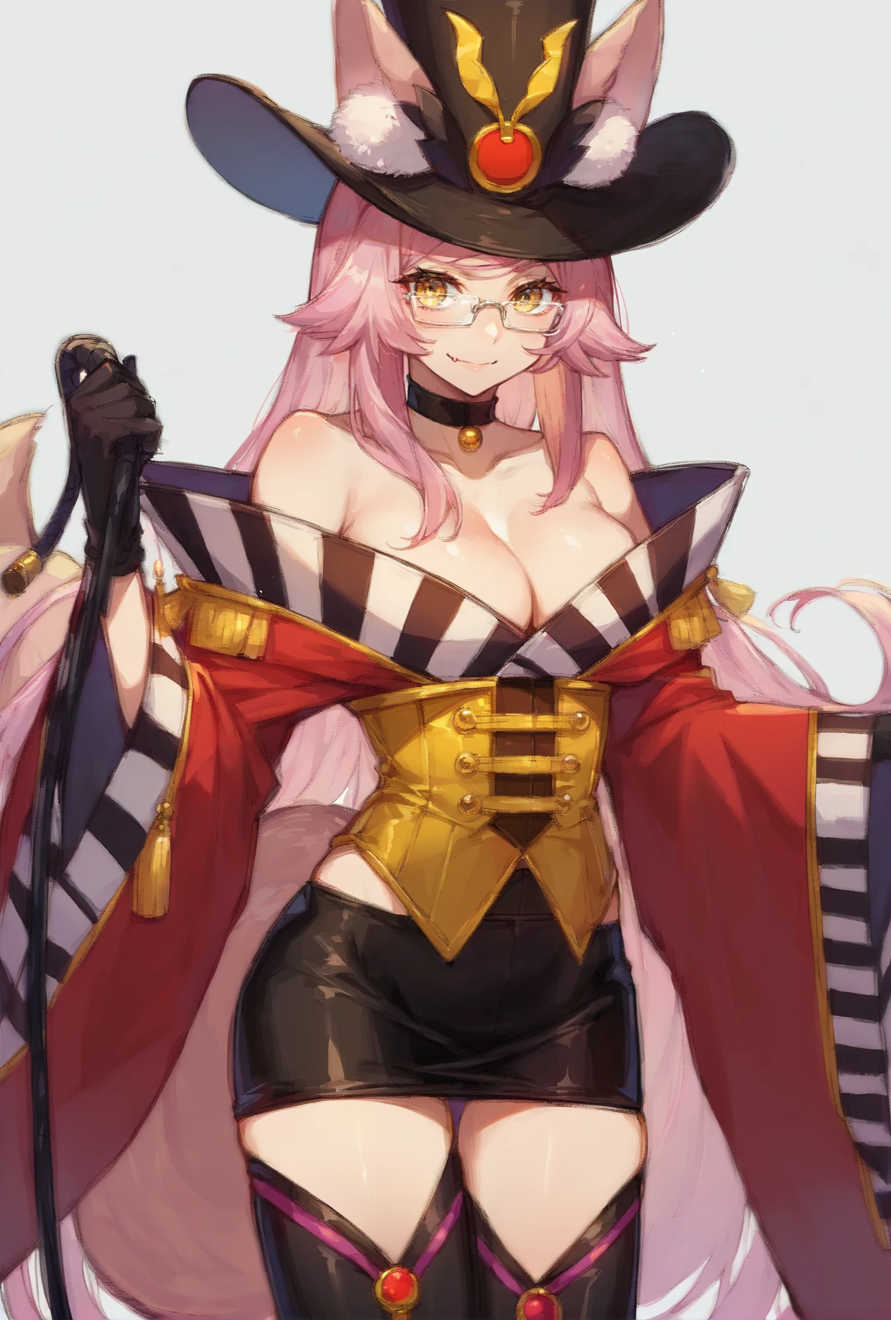 • Stage 2 (Darkness/Foreigner) - koyancircus, glasses, very long hair, pink hair, yellow eyes, pink fox ears, pink fox tail, animal ears, fox girl, top hat, japanese clothes, off-shoulder, tassels, gold corset, red top, striped trim, black pencil skirt, mismatched legwear, thigh high boot, cleavage, whip