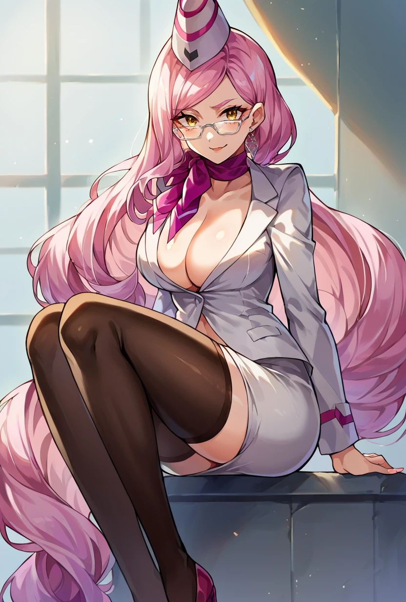 • Stage 1 (Darkness/Foreigner) - koyasec, glasses, very long hair, pink hair, yellow eyes, white blazer, cleavage, human ears, white pencil skirt, stiletto heels, office lady, garrison cap, pink scarf, earrings, stockings:1.3