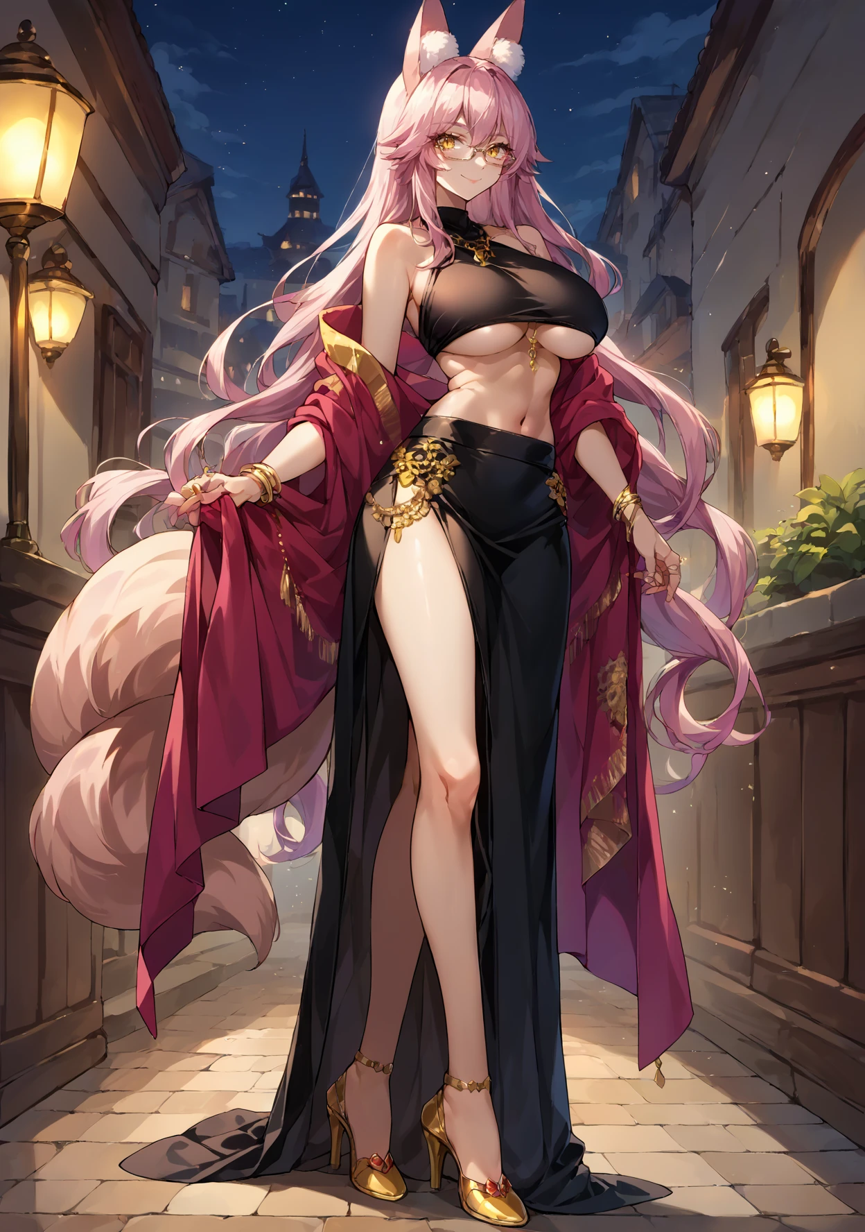 • India Lostbelt - koyaindia, glasses, very long hair, pink hair, yellow eyes, pink fox ears, pink fox tail, animal ears, fox girl, indian clothes, stiletto heels, detached sleeves, sari, midriff, crop top, turtle neck, veil, circlet, sandals