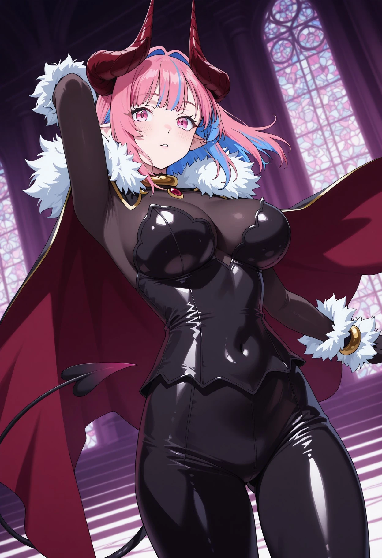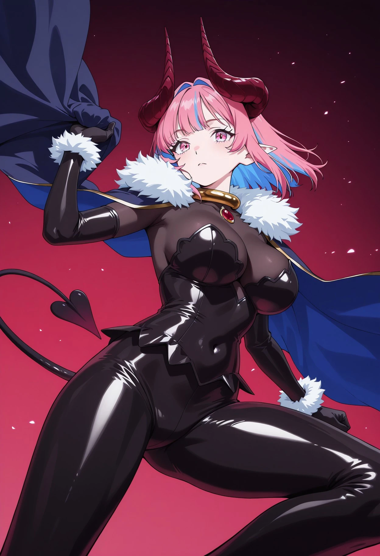 red horns, pink hair, blue streaks, blue inner hair, pink eyes, pointy ears, outfit2, white fur, demon outfit, cape, red brooch, golden neck ring, demon tail