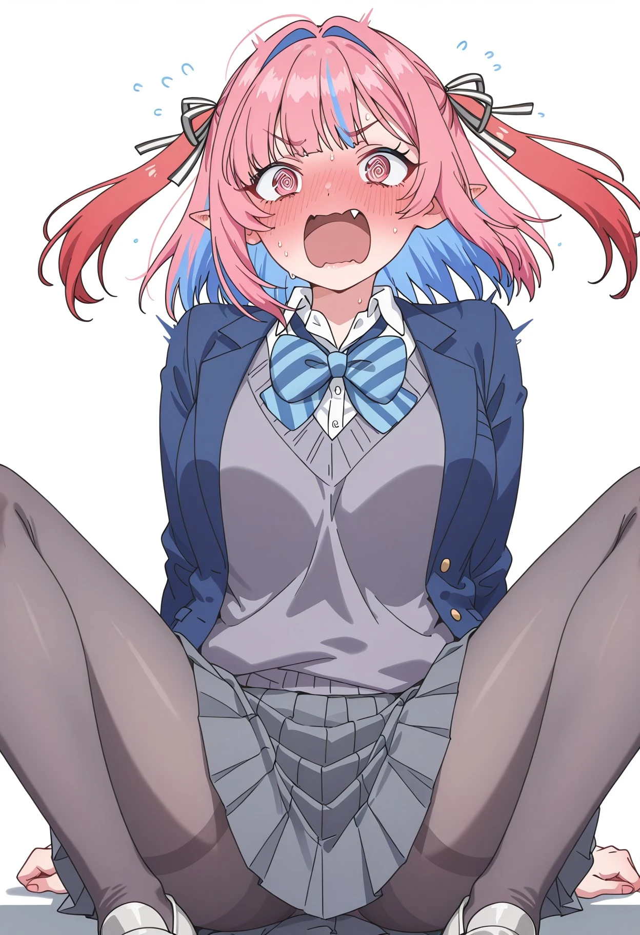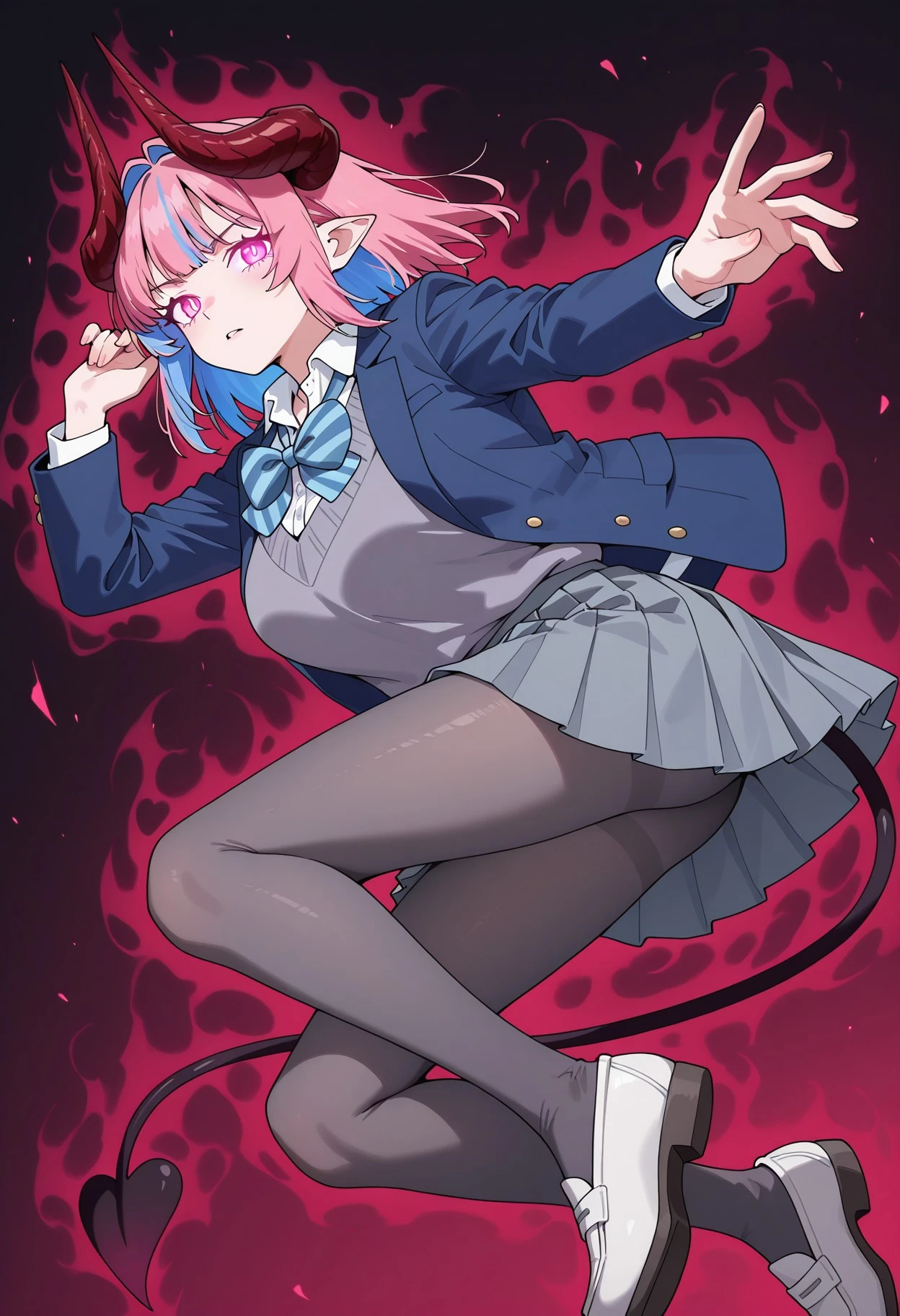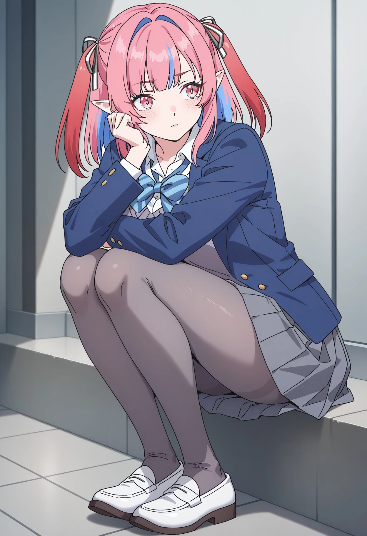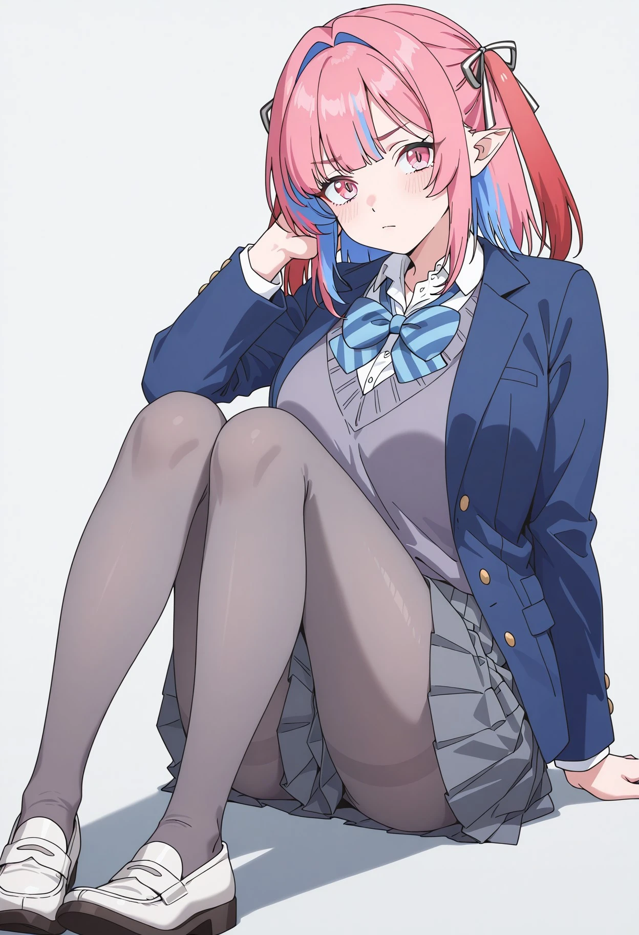 pink hair, blue streaks, blue inner hair, black and white hair ties, twintails, pink eyes, pointy ears, outfit1, blue uniform, striped bowtie, gray pleated skirt, gray pantyhose, white loafers